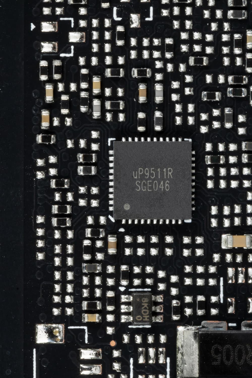 На лицевой стороне имеется третий ШИМ-контроллер uP9511R (uPI Semiconductor), который управляет 3-фазной схемой питания микросхем памяти.