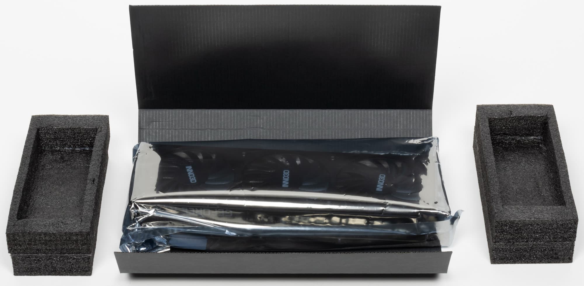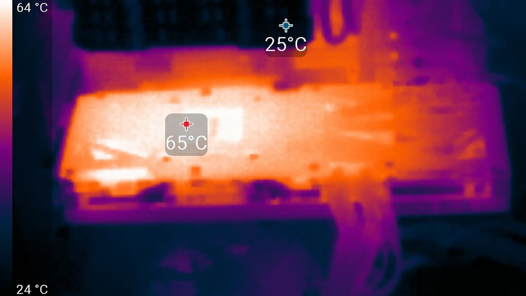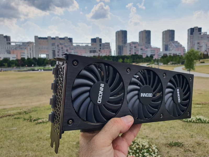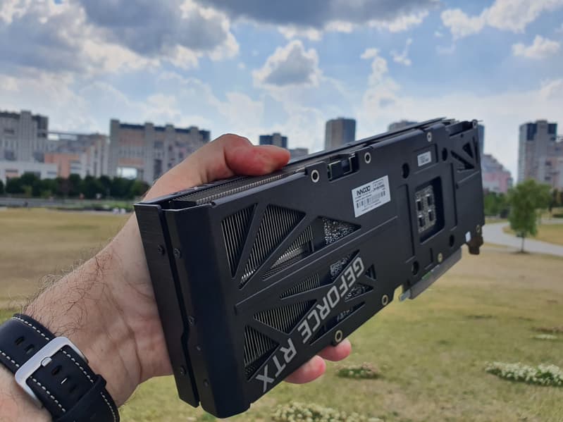 Систему охлаждения нельзя назвать тихой, но для двухслотового решения шум очень низкий — вспомним, как шумела референс-карта Nvidia. Оборотной стороной является высокий нагрев компонентов, потому что карта Inno3D может потреблять до 350 Вт. Потребуется хорошо вентилируемый корпус, потому что весь нагретый воздух видеокарта оставляет внутри системного блока.