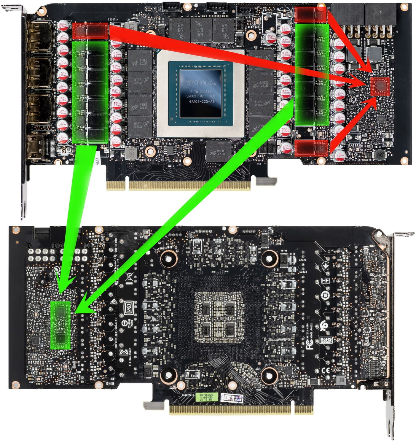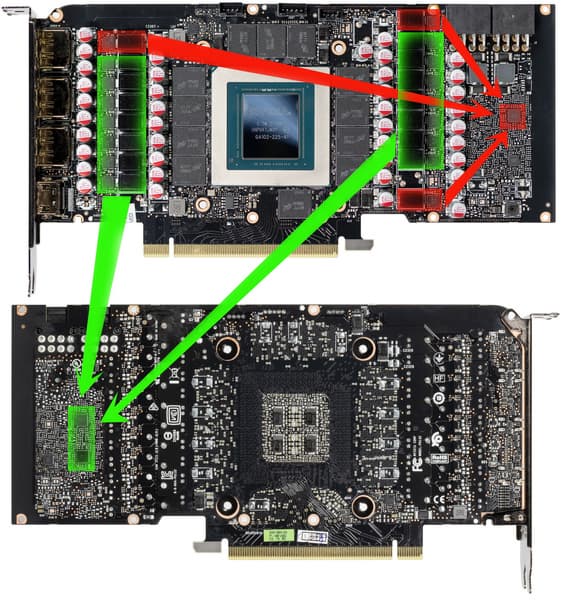 Зеленым цветом отмечена схема питания ядра, красным — памяти. Для управления схемой питания GPU используются два ШИМ-контроллера: два uP9511R (uPI Semiconductor), расположенные на оборотной стороне платы…