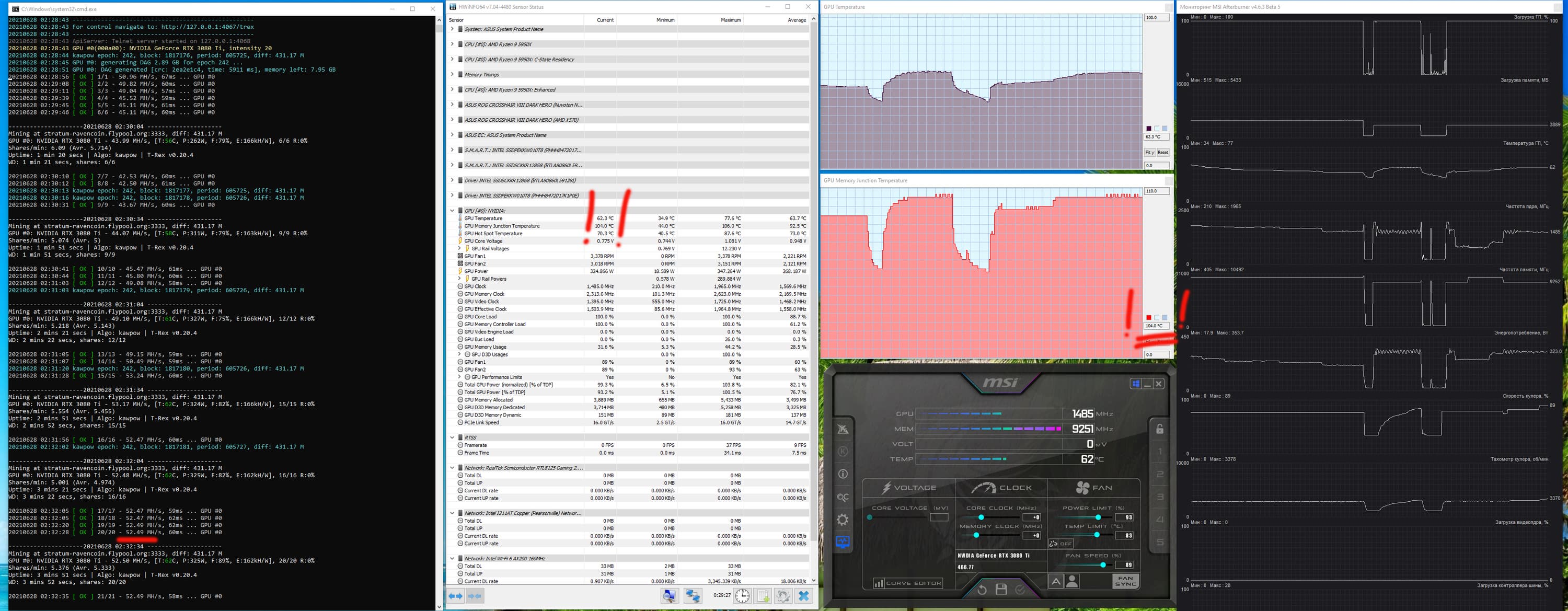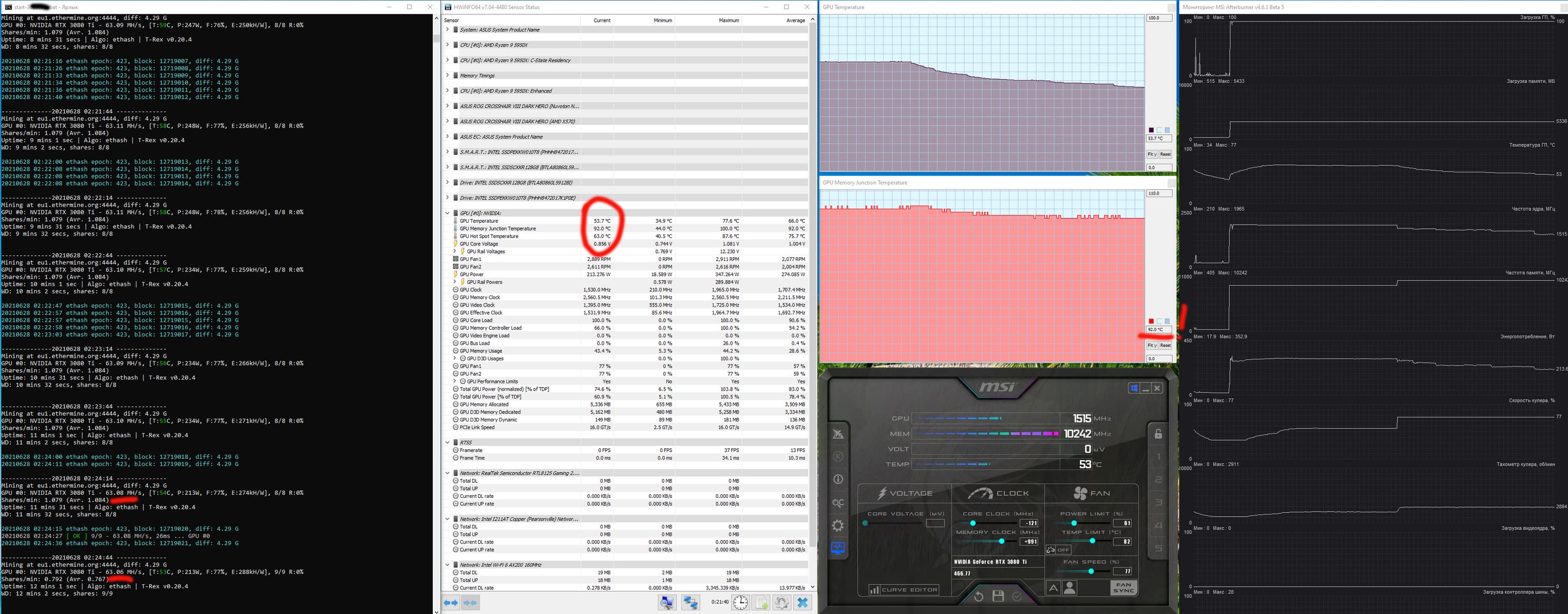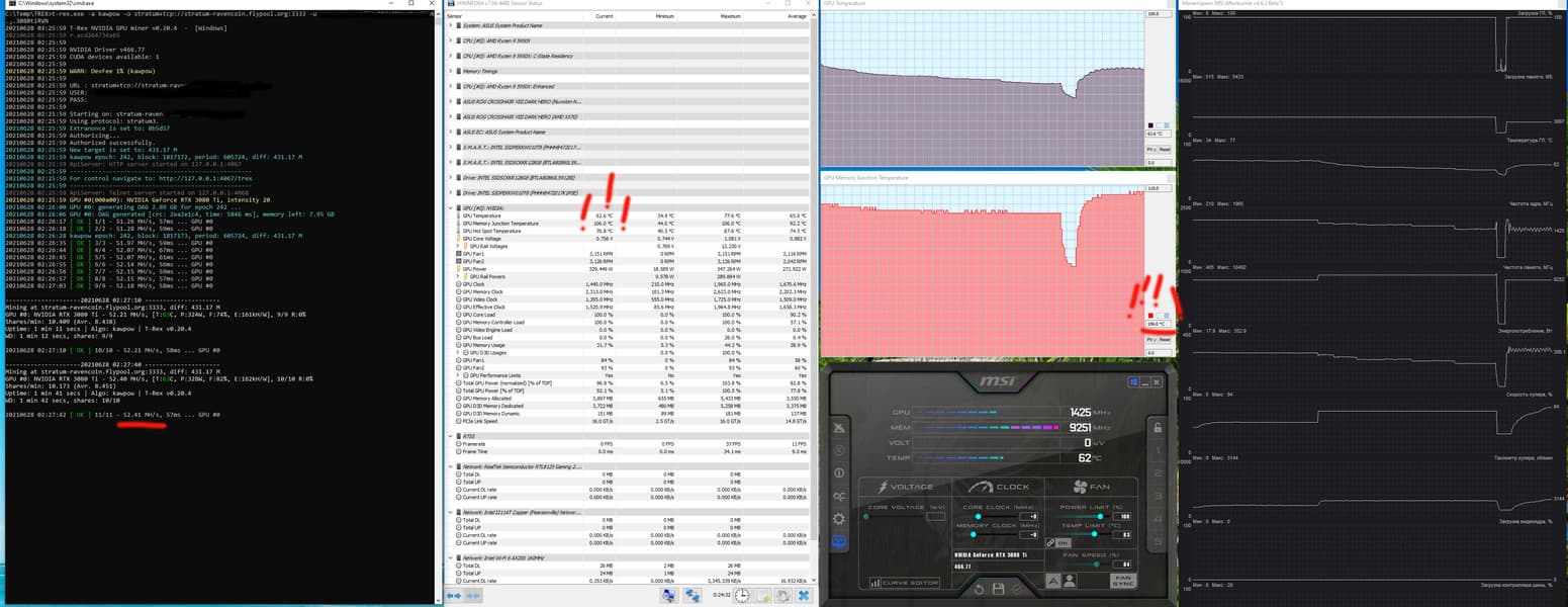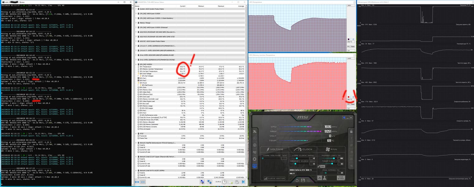 Оптимизация настроек работы видеокарт под майнинг в нашем случае не предусматривает сильного разгона видеопамяти, также обязательным является внешний обдув видеокарт. Особо тщательно надо следить за нагревом GDDR6X у GeForce RTX 3080/3090, ибо максимум для этой памяти — 110 градусов, и она долго не проживет, постоянно работая в условиях нагрева выше 100 °C. В нашем случае после оптимизации параметров работы карты и принудительного улучшения охлаждения нагрев памяти в майнинге по алгоритму ethash не превышал 92 градусов.