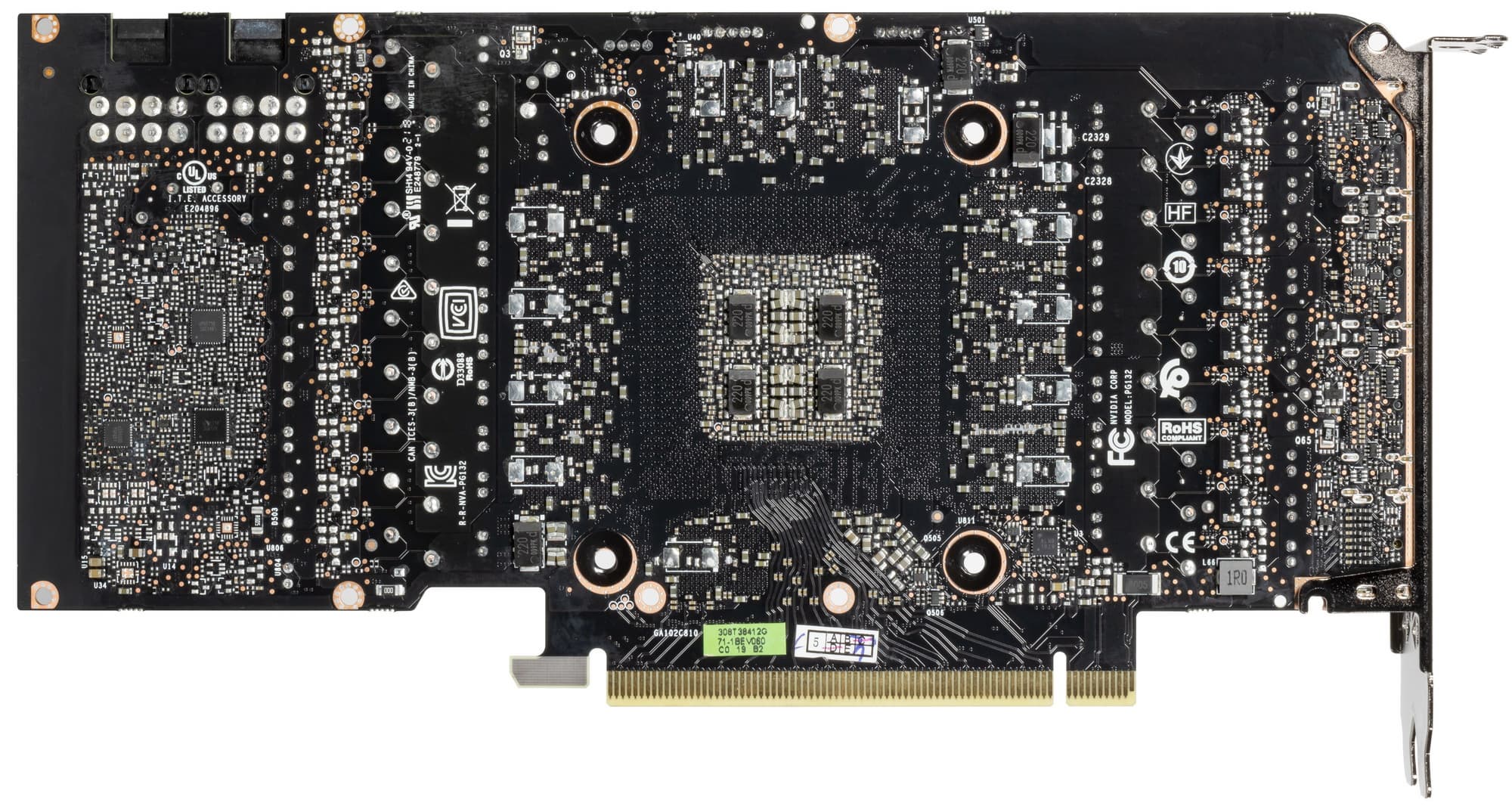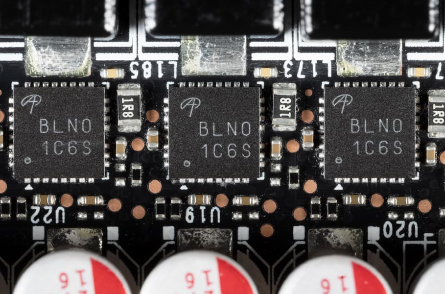 В преобразователе питания, традиционно для всех видеокарт Nvidia, используются транзисторные сборки DrMOS — в данном случае AOZ5332QI (Alpha & Omega Semiconductor), каждая из которых рассчитана максимально на 50 А.