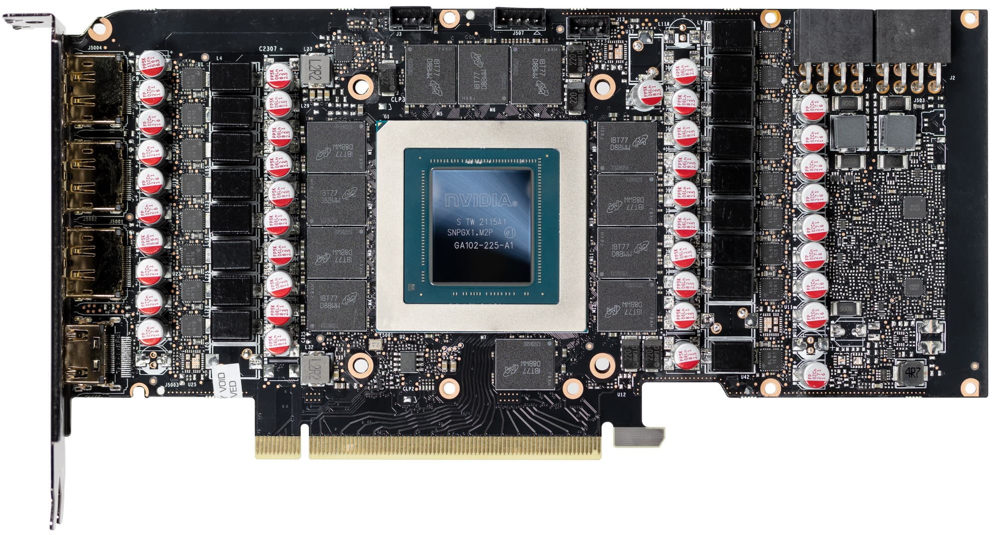Карта имеет 12 ГБ памяти GDDR6X SDRAM, размещенной в 12 микросхемах по 8 Гбит на лицевой стороне PCB. Микросхемы памяти Micron (GDDR6X, MT61K256M32JE-19) рассчитаны на номинальную частоту работы в 5500 (21000) МГц. Расшифровщик кодов на упаковках FBGA находится здесь.