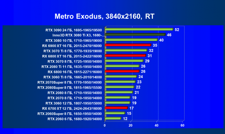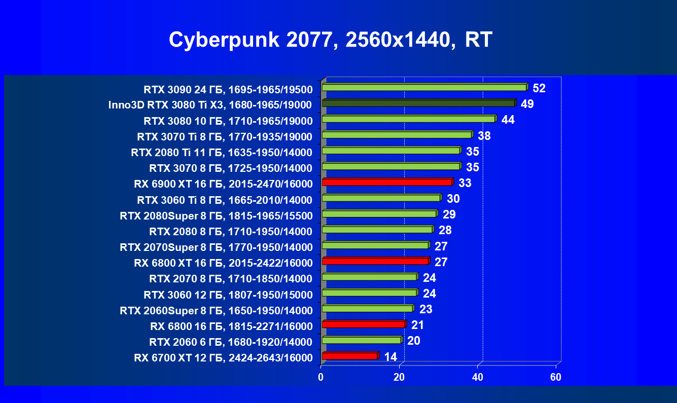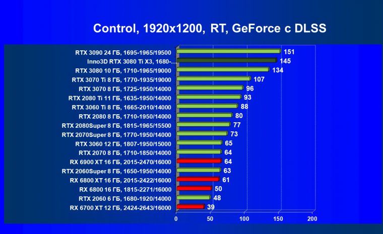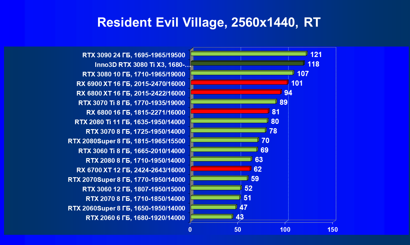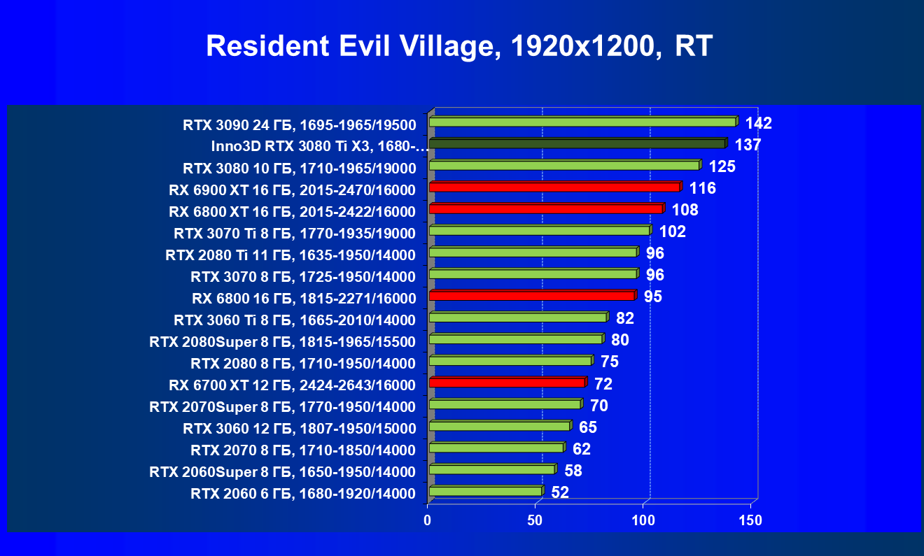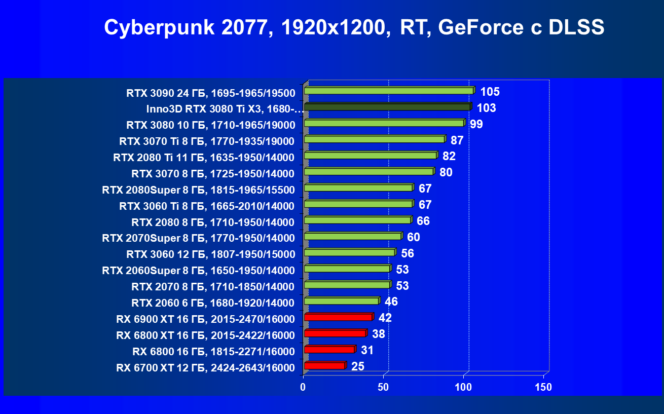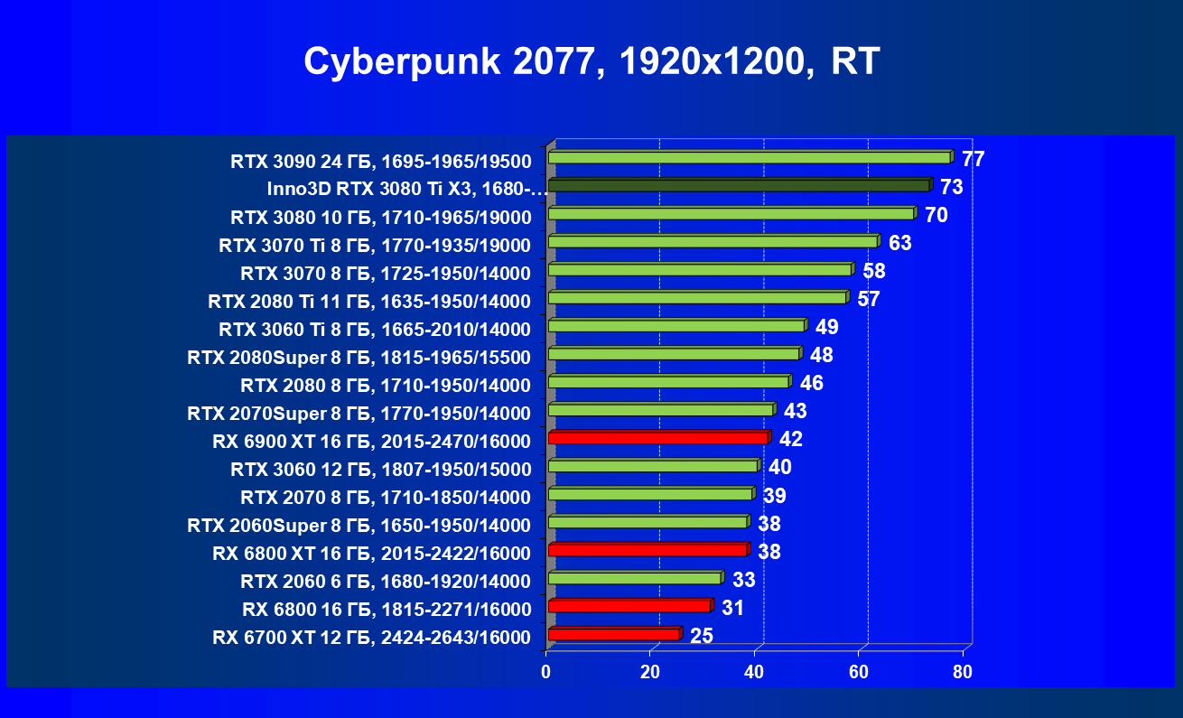 Все Radeon RX 6000 оказались аутсайдерами из-за чрезмерного падения производительности в играх с трассировкой лучей, а GeForce RTX 3080 Ti логично оказался посередине между GeForce RTX 3080 и GeForce RTX 3090.