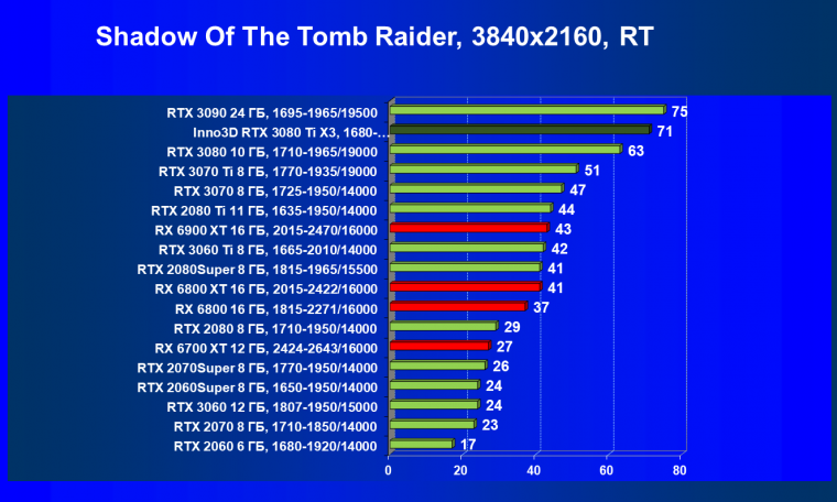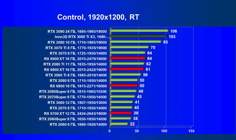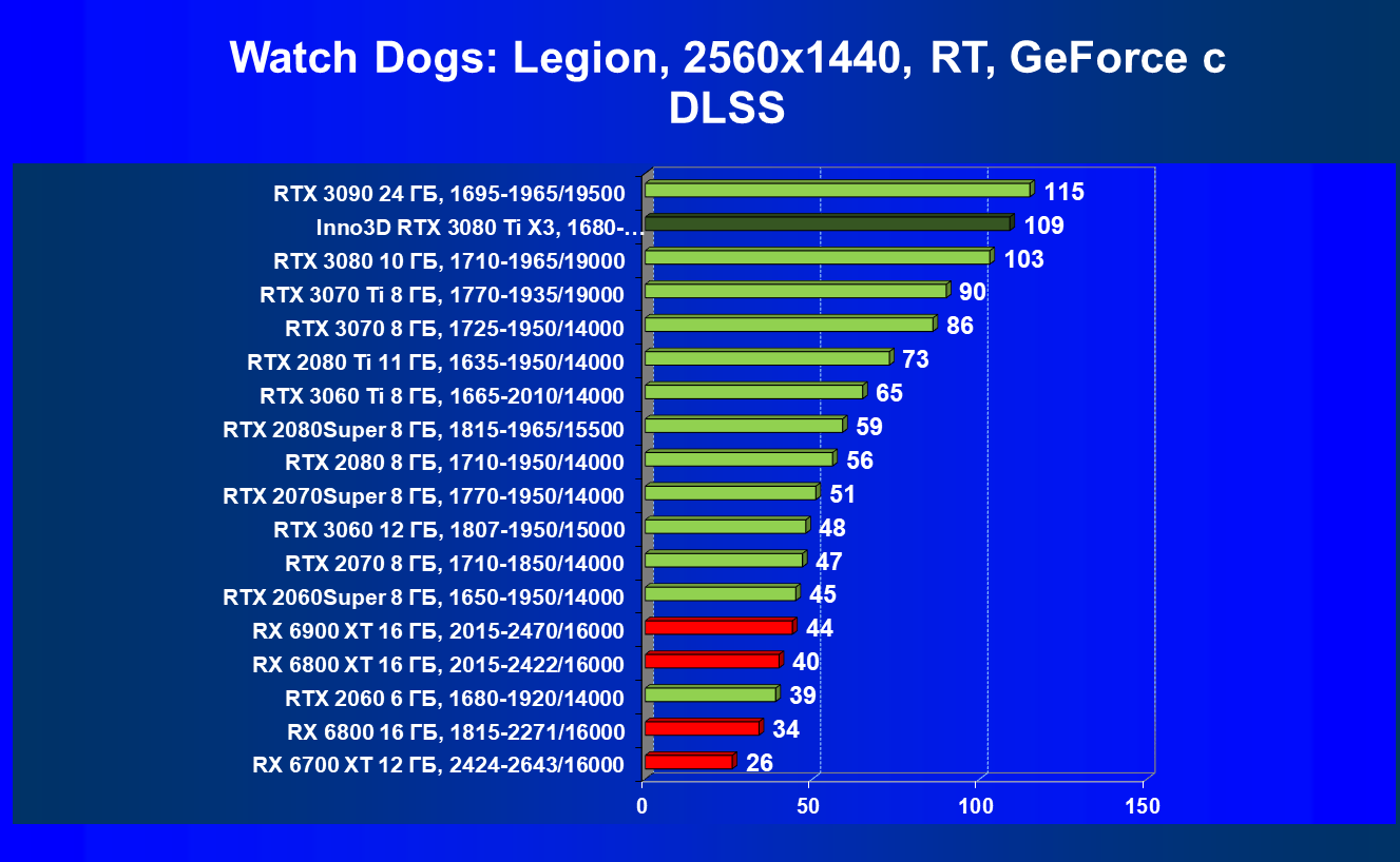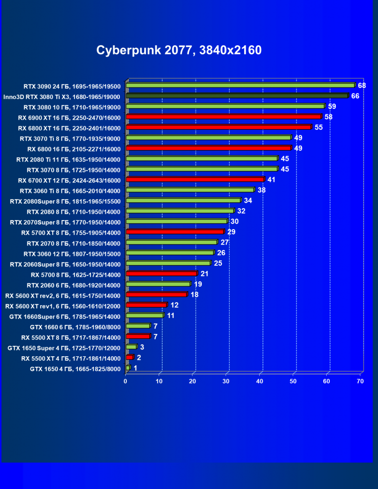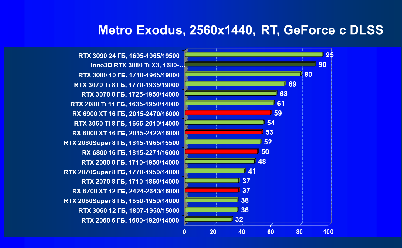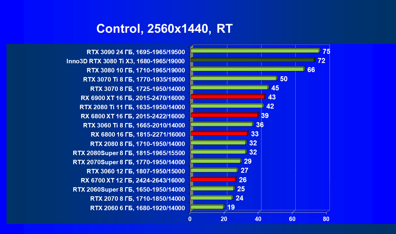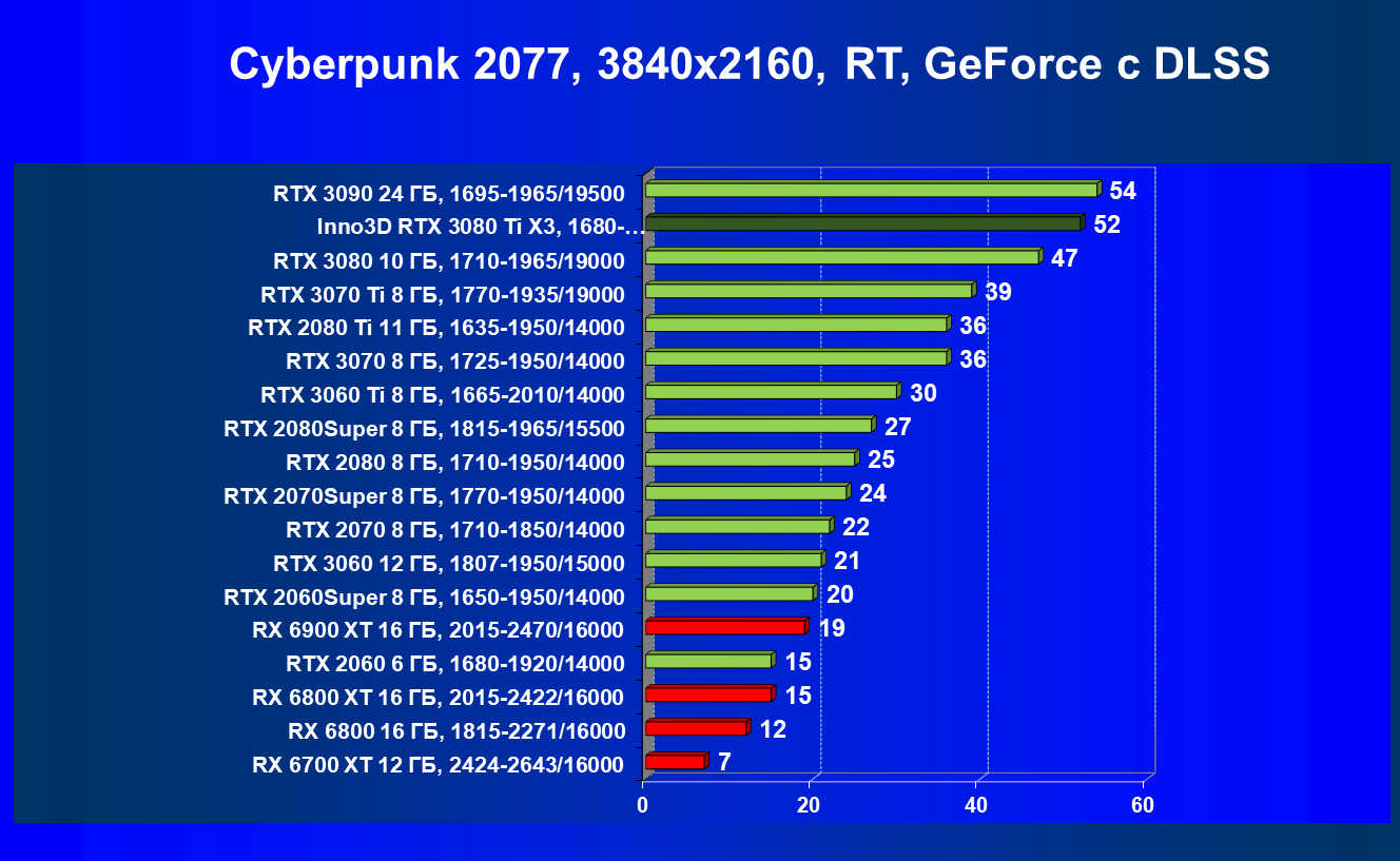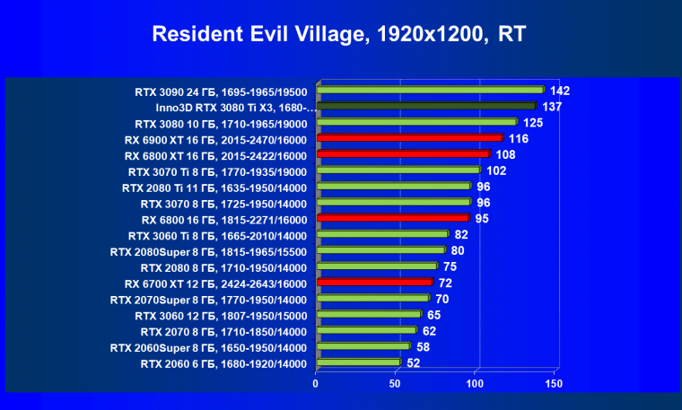 Все Radeon RX 6000 оказались аутсайдерами из-за чрезмерного падения производительности в играх с трассировкой лучей, а GeForce RTX 3080 Ti логично оказался посередине между GeForce RTX 3080 и GeForce RTX 3090.