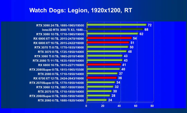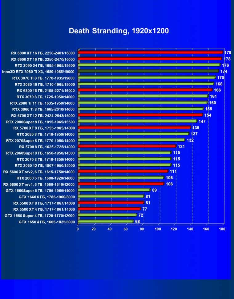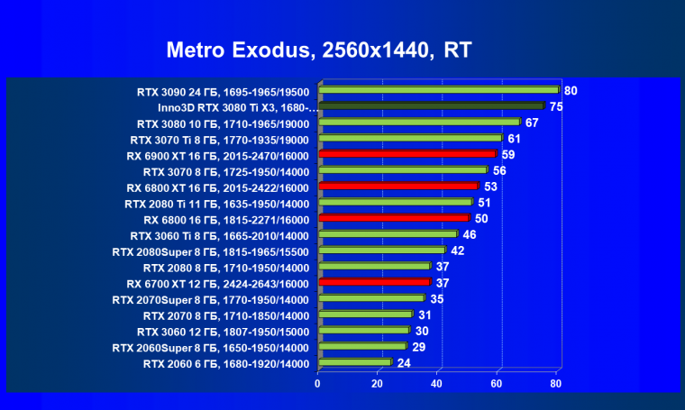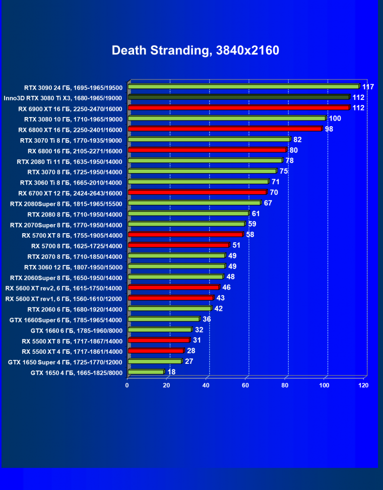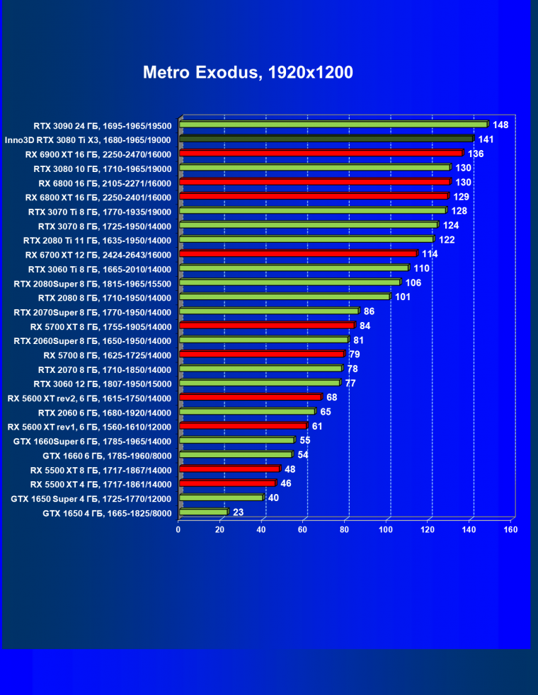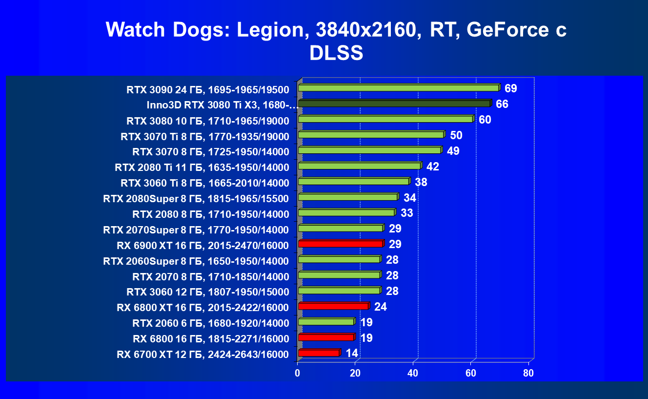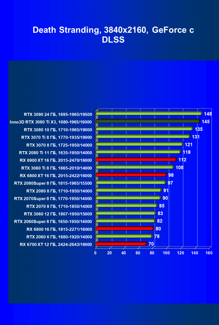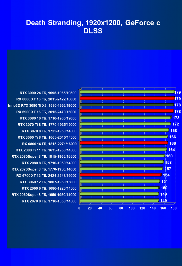 Все Radeon RX 6000 оказались аутсайдерами из-за чрезмерного падения производительности в играх с трассировкой лучей, а GeForce RTX 3080 Ti логично оказался посередине между GeForce RTX 3080 и GeForce RTX 3090.