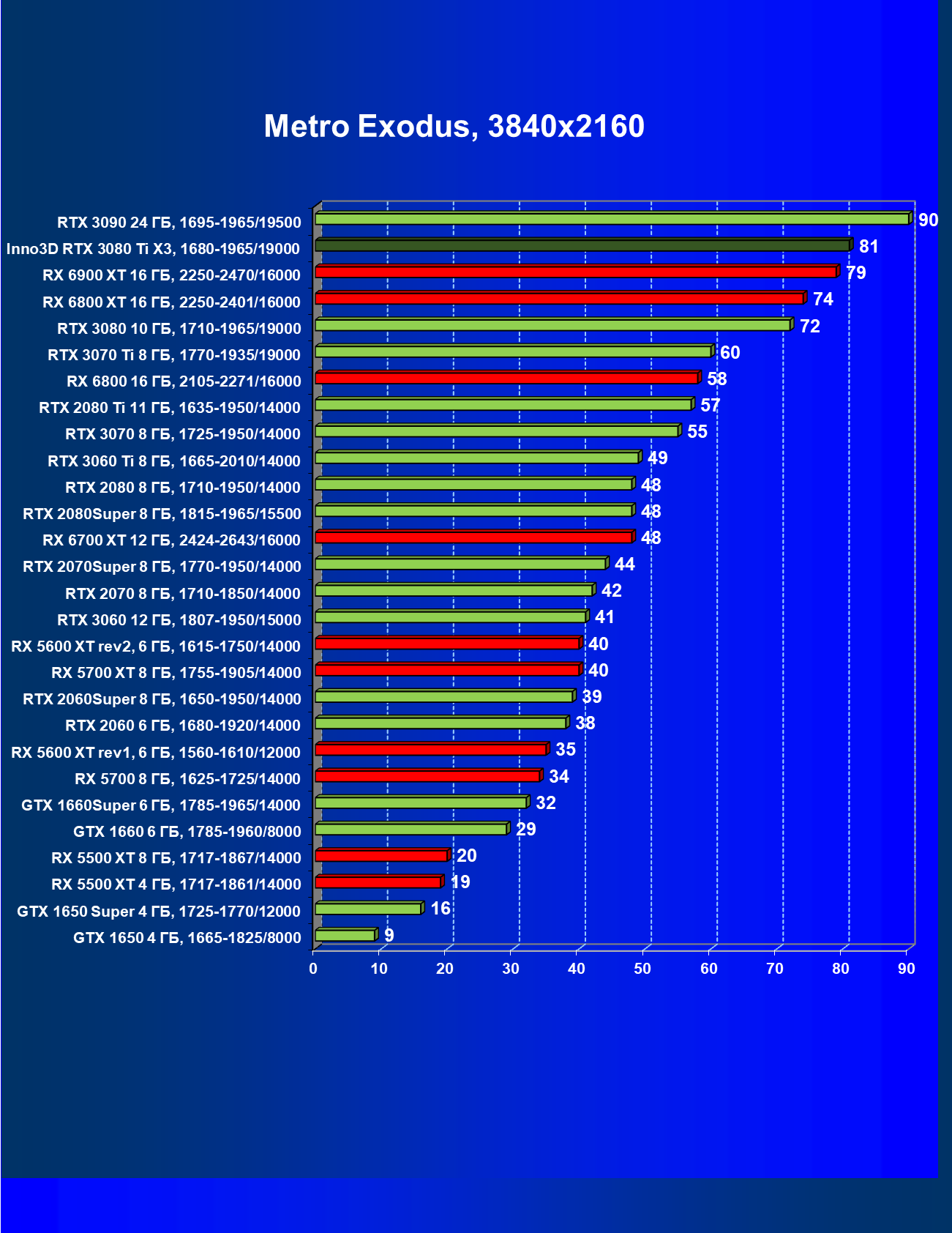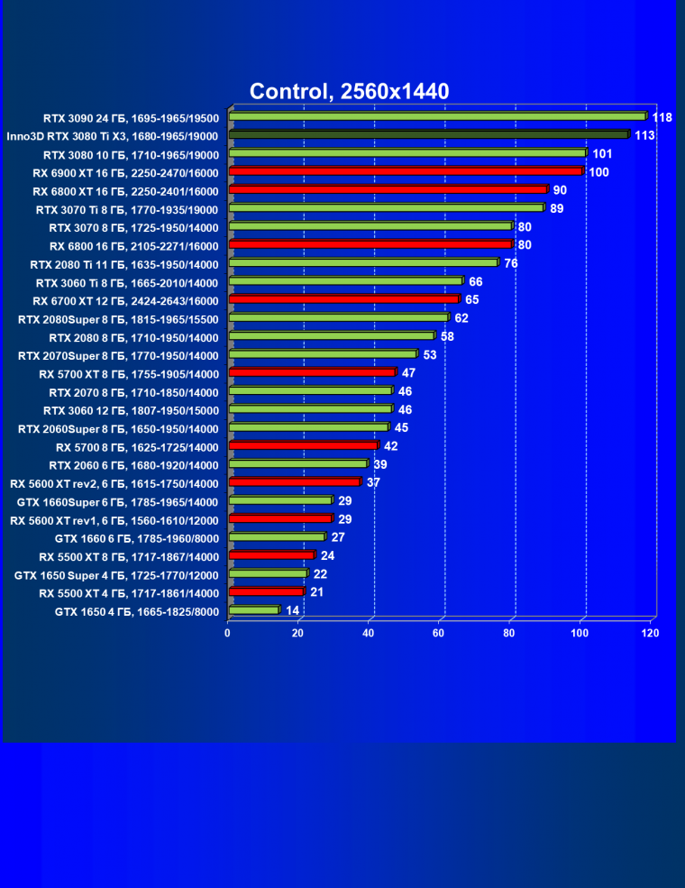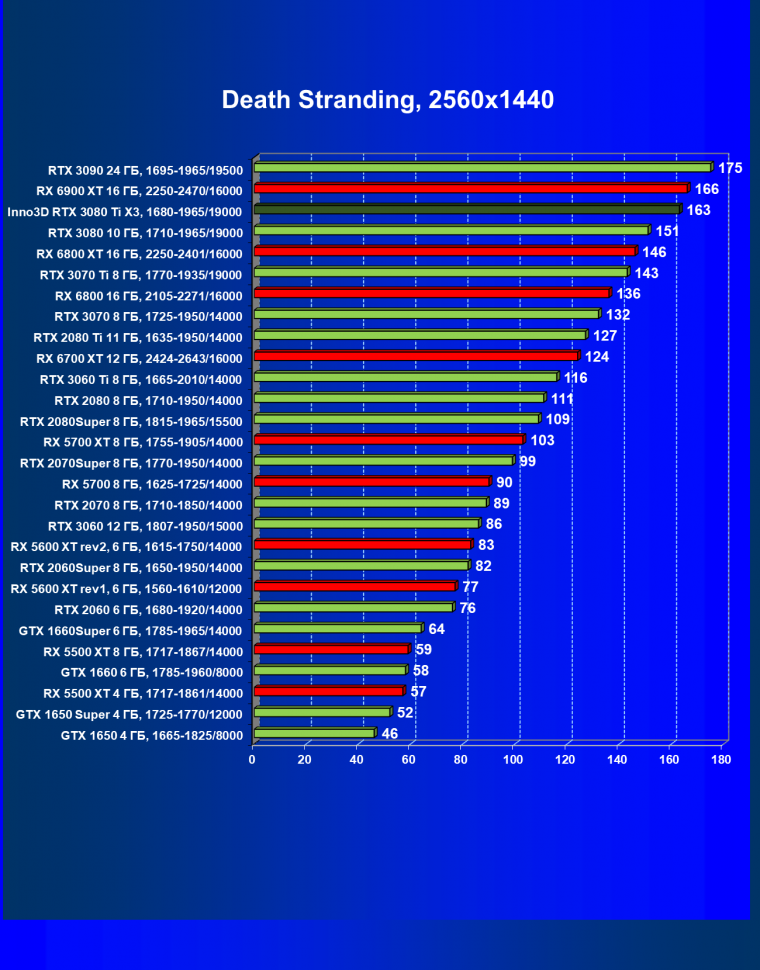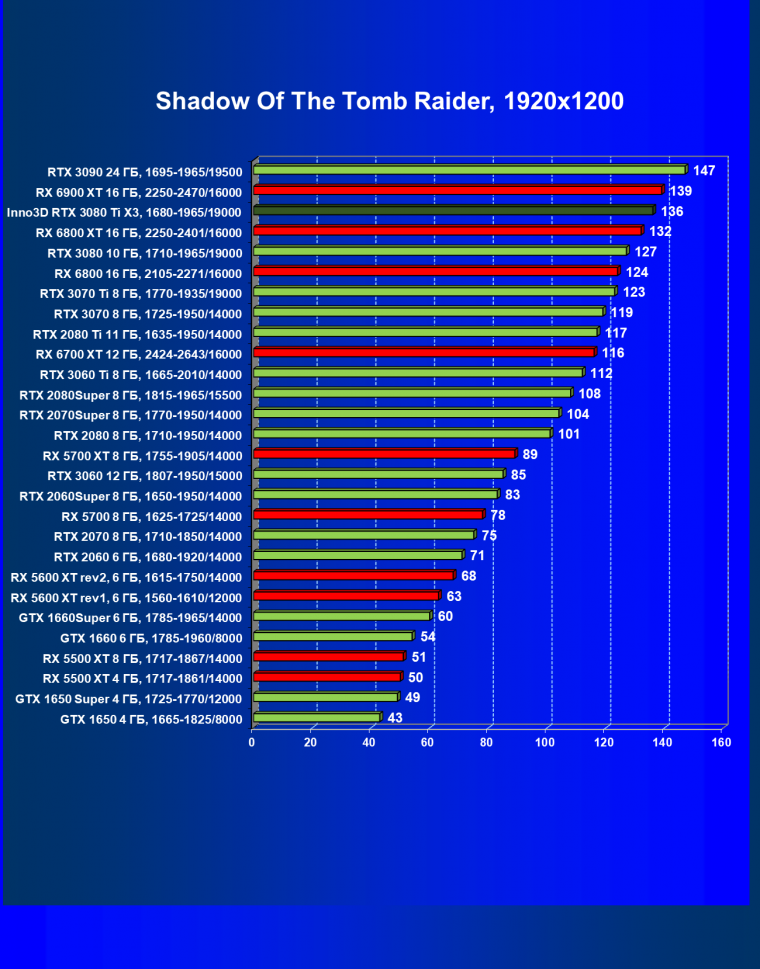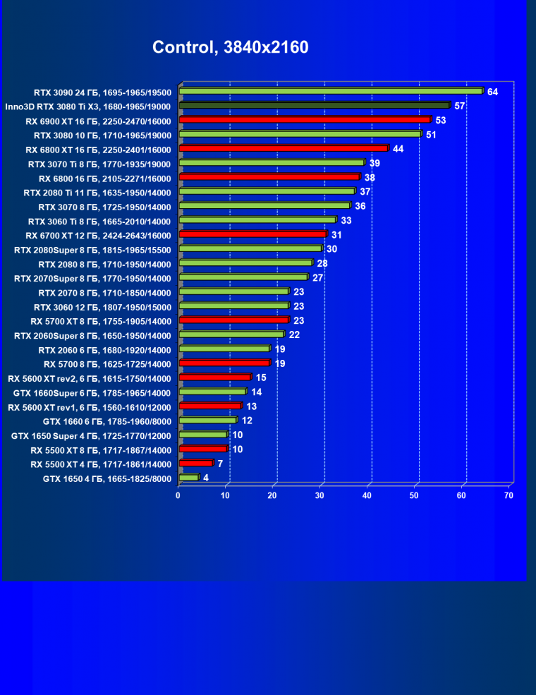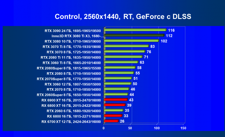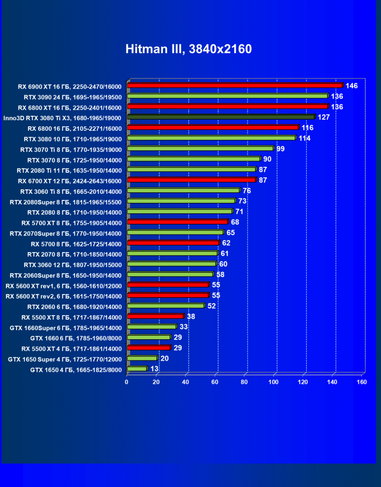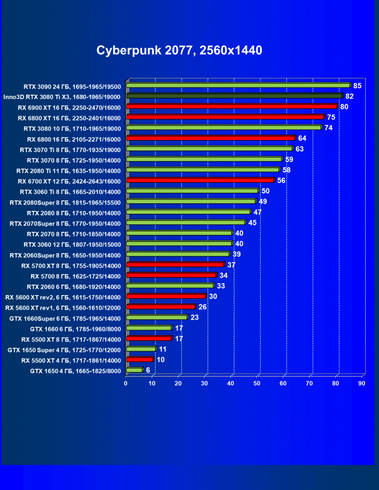 Все Radeon RX 6000 оказались аутсайдерами из-за чрезмерного падения производительности в играх с трассировкой лучей, а GeForce RTX 3080 Ti логично оказался посередине между GeForce RTX 3080 и GeForce RTX 3090.