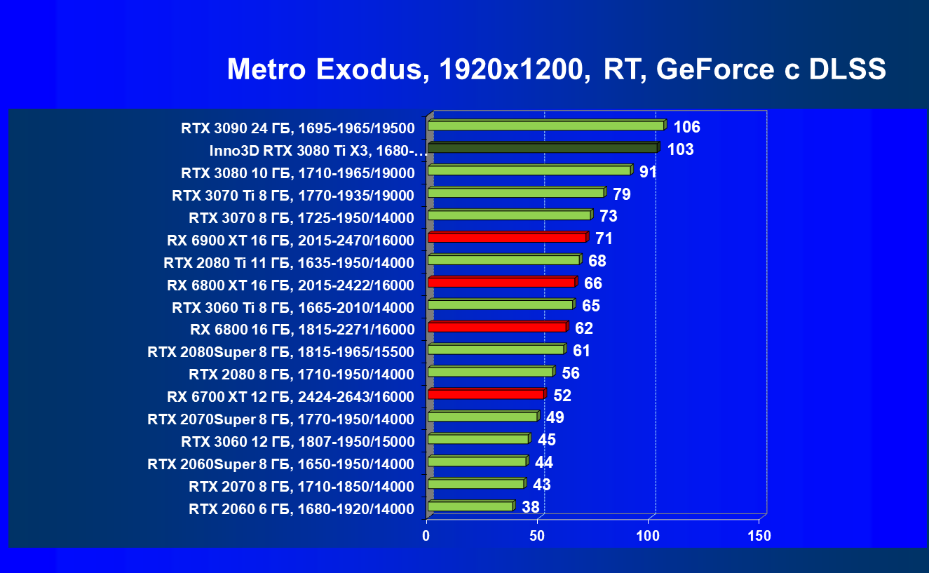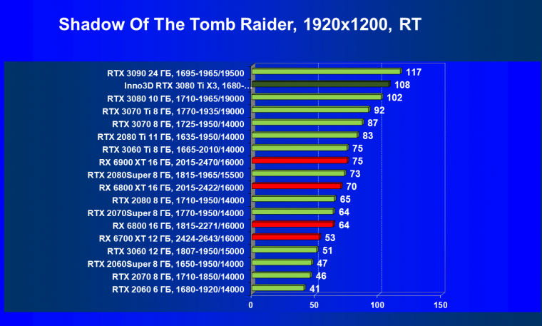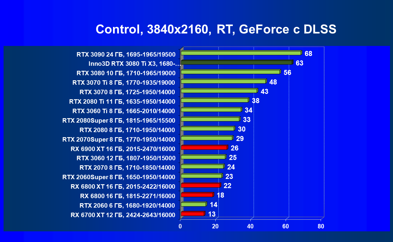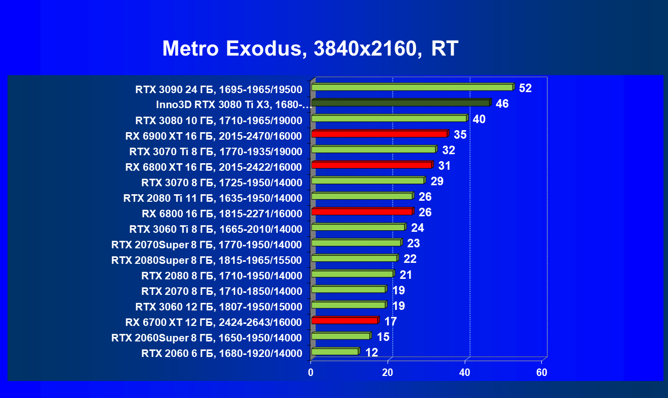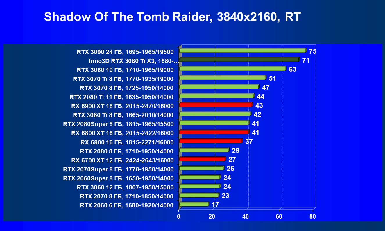 Несмотря на привлекательность Radeon RX 6000 в играх без использования RT, в случае игр с RT картина кардинально меняется, и GeForce RTX 3080 Ti становится беспрекословным лидером в своей группе (здесь мы обсуждаем только игровые возможности карт).