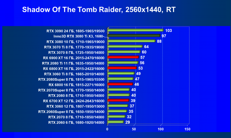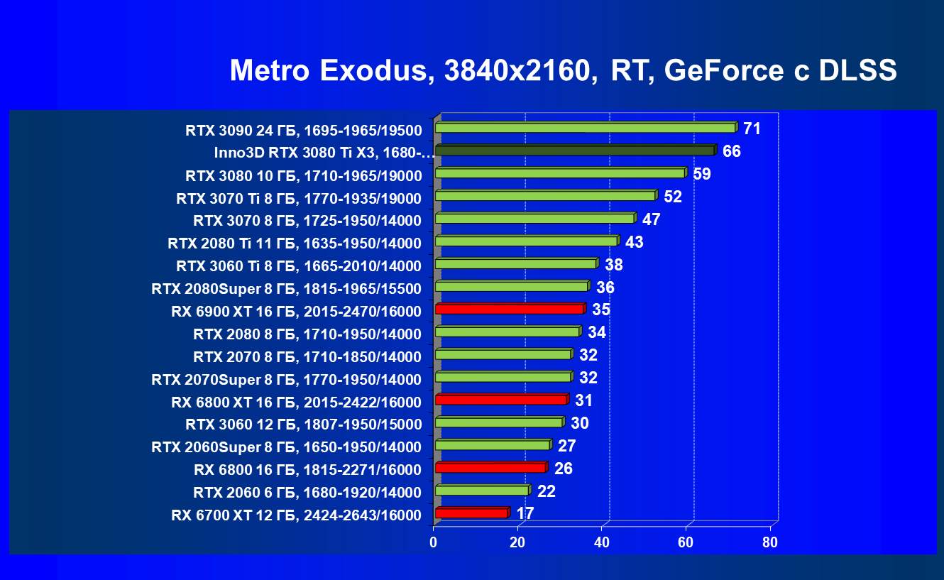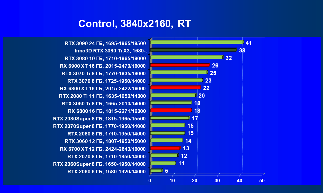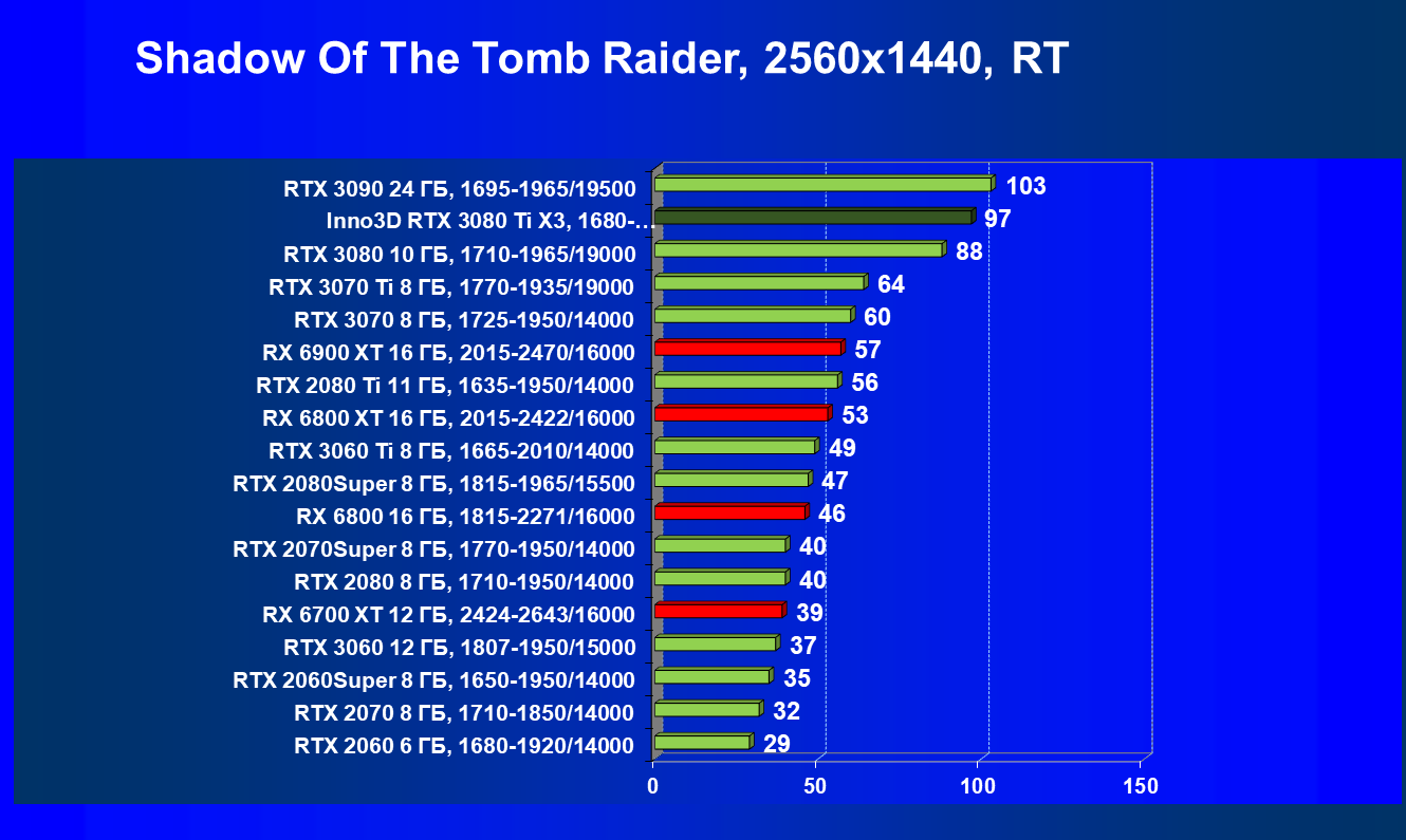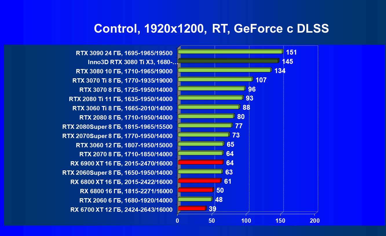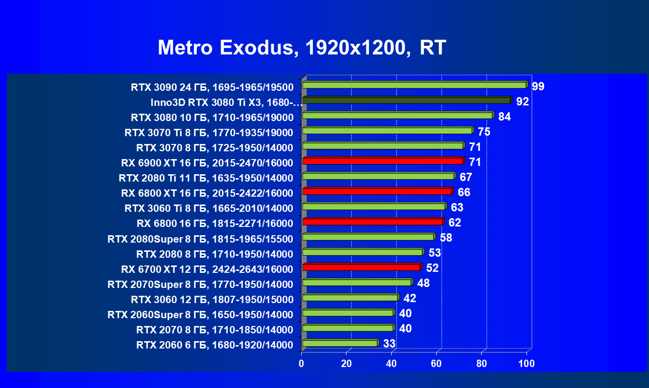 Несмотря на привлекательность Radeon RX 6000 в играх без использования RT, в случае игр с RT картина кардинально меняется, и GeForce RTX 3080 Ti становится беспрекословным лидером в своей группе (здесь мы обсуждаем только игровые возможности карт).