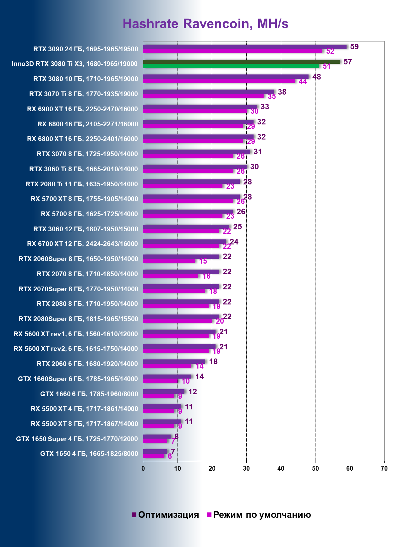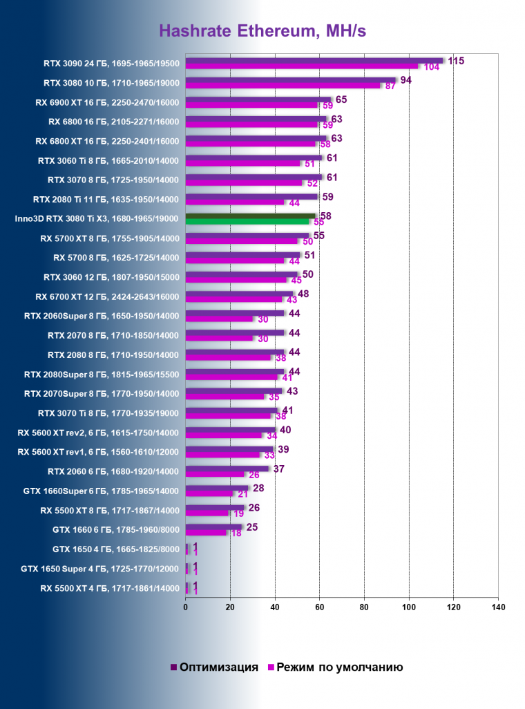 | 04 | Inno3D RTX 3080 Ti X3, 1680—1965/19000 | 29 | 405 | 140 000 |