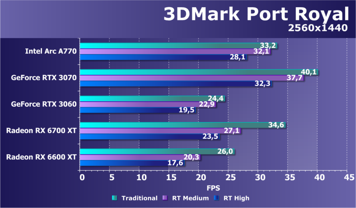 Падение производительности от использования трассировки лучей у карты Intel примерно такое же, как у RTX 3060 Ti (с учетом DLSS/FSR/XeSS). Но все же положение у RTX 3060 Ti немного лучше, так как DLSS имеет более высокий КПД. В целом скажем, что карта Intel прекрасно годится для игры в разрешении Full HD с максимальными настройками, включая и трассировку лучей, если задействовать одну из технологий масштабирования. Поддержку собственной технологии Intel — XeSS — пока найти можно лишь в паре игр, в нашем списке таковых нет.
