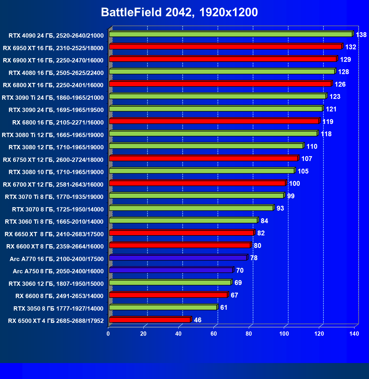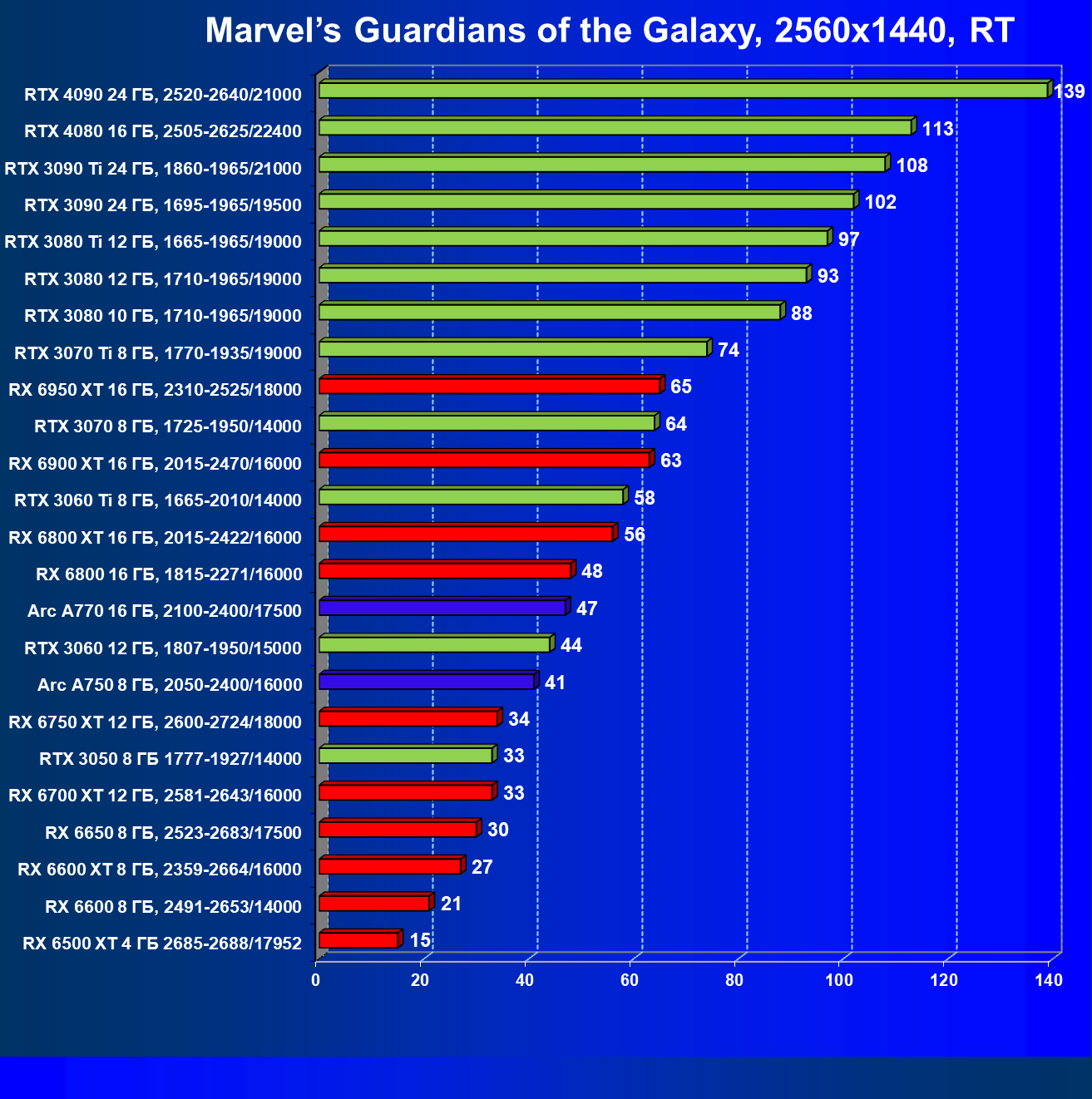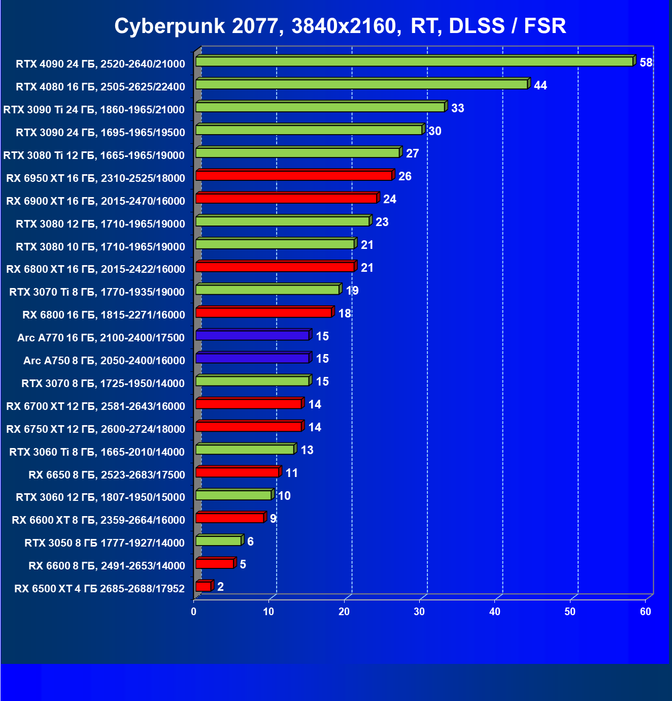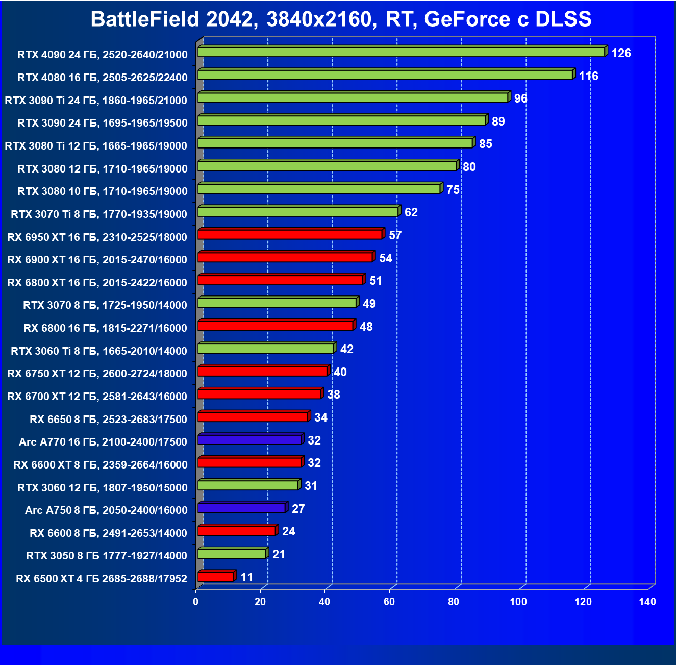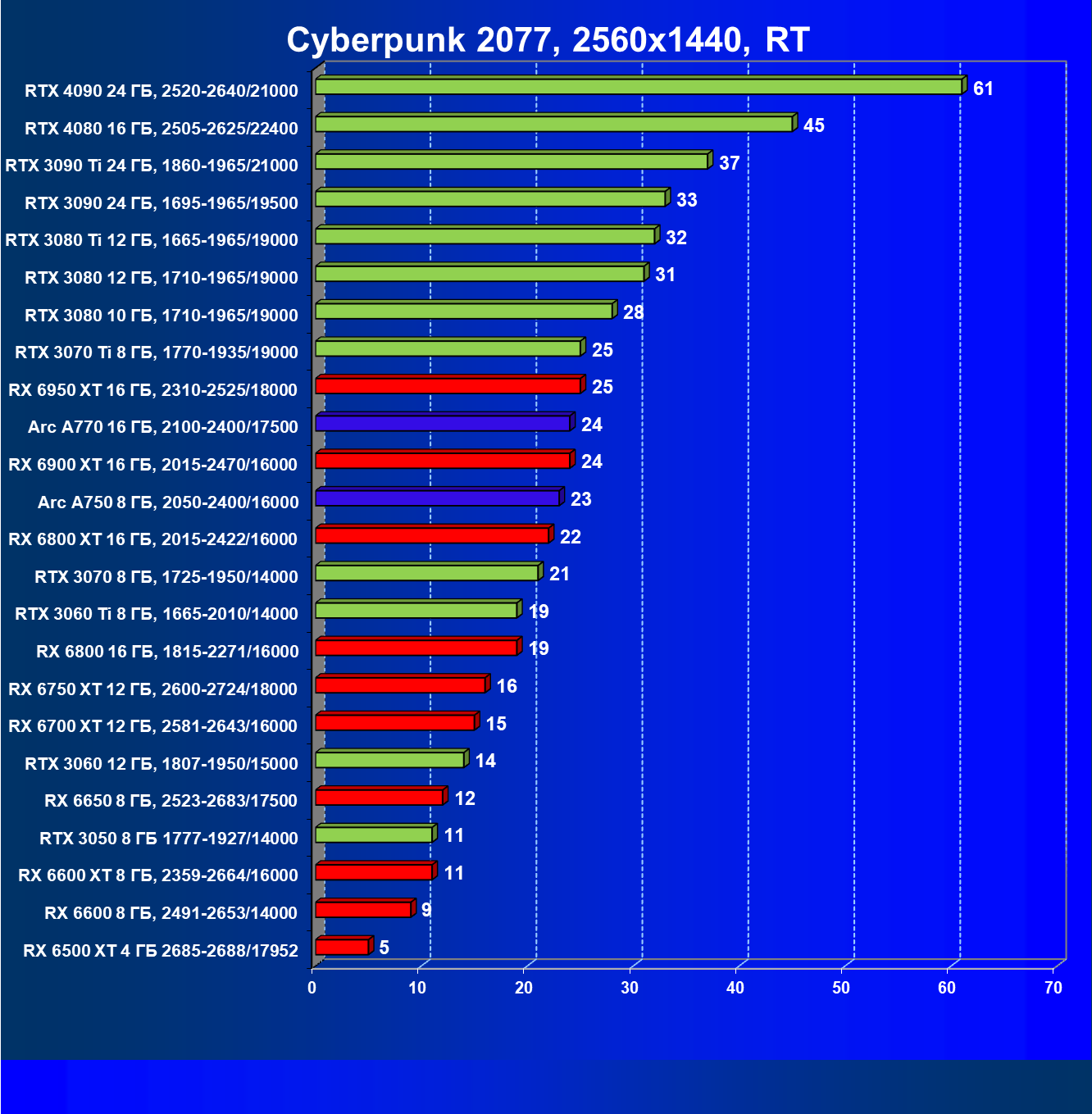 | 13 | Arc A770 16 ГБ, 2100—2400/17500 | 69 | 243 | 35 000 |