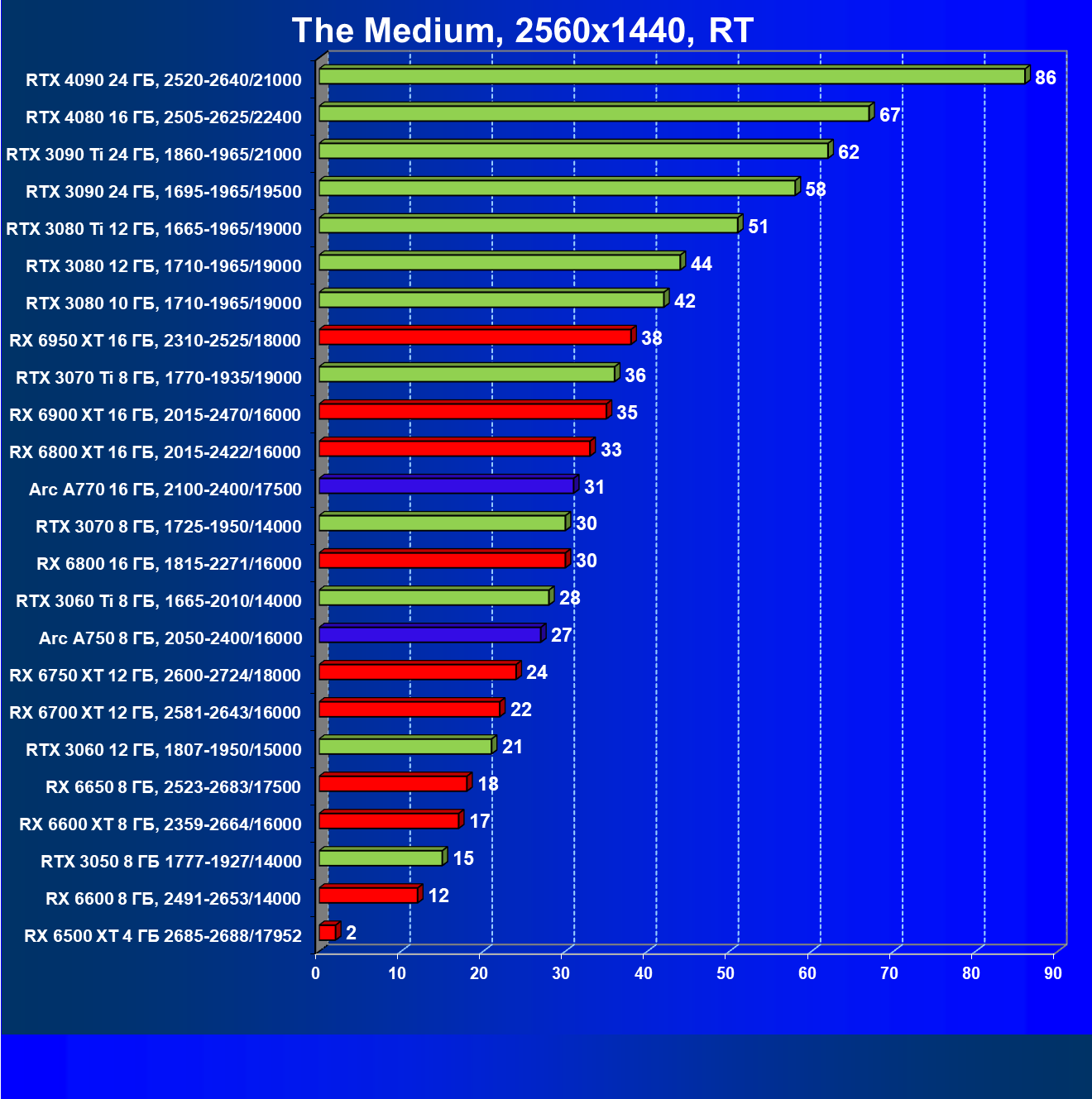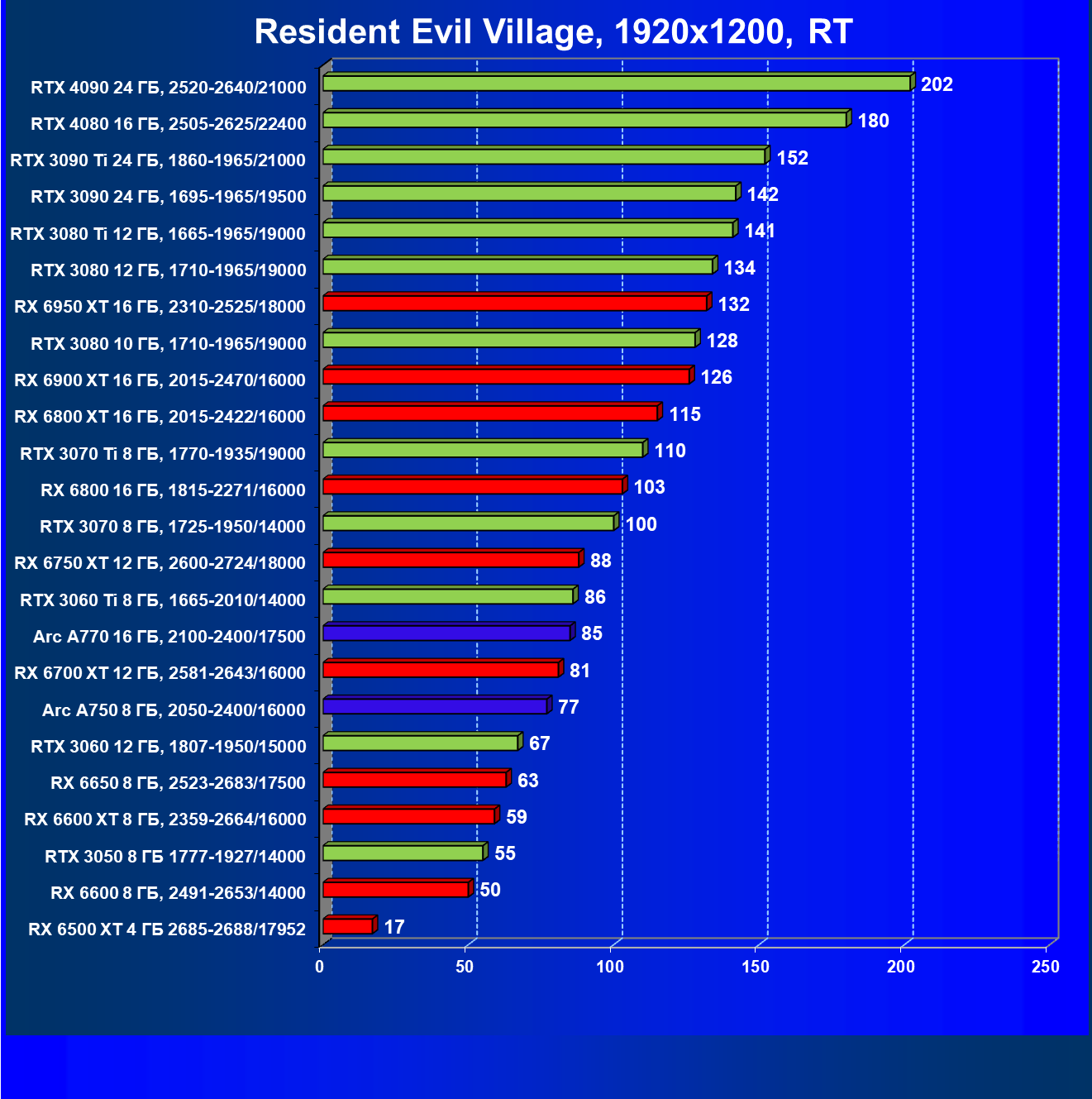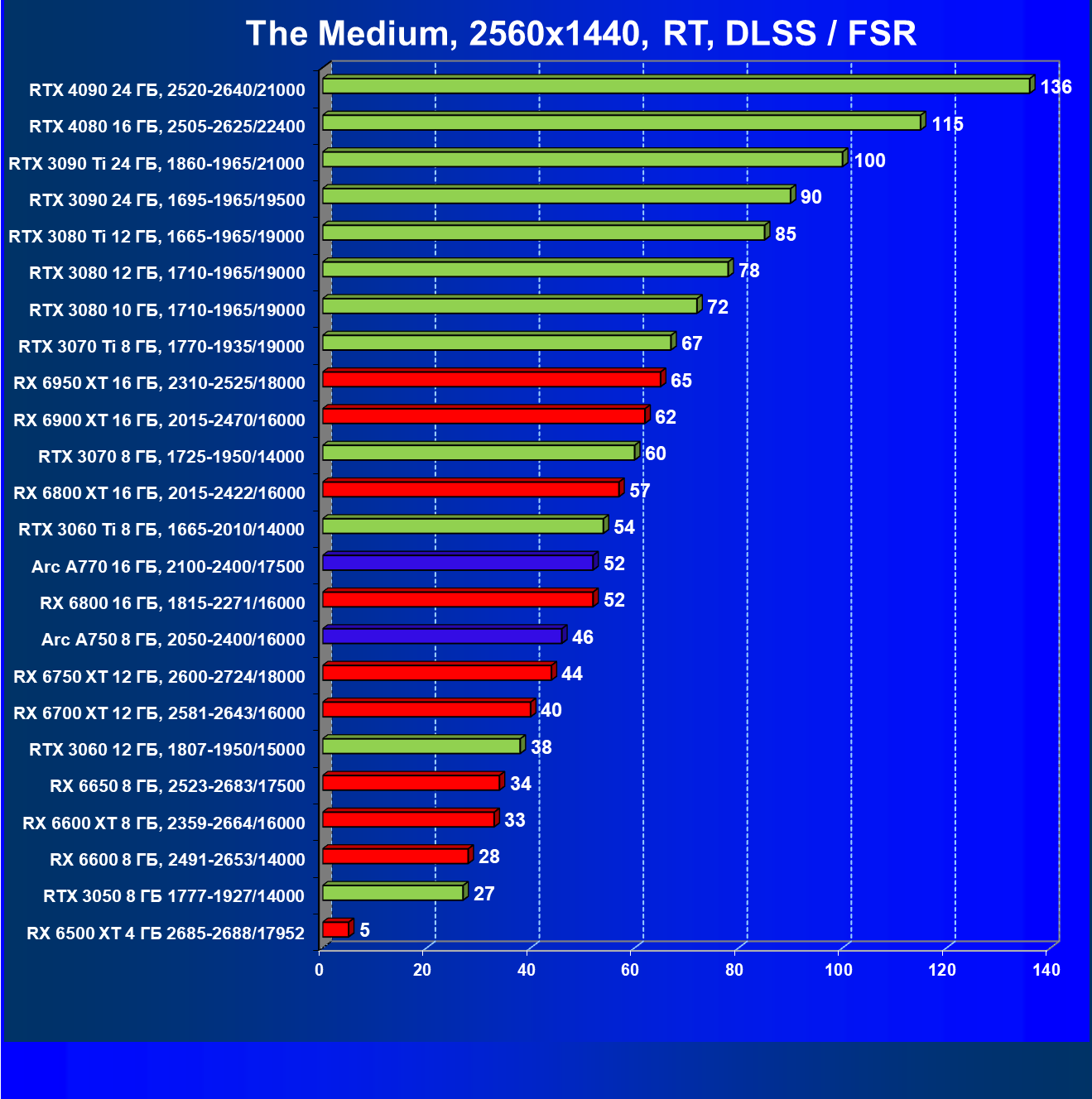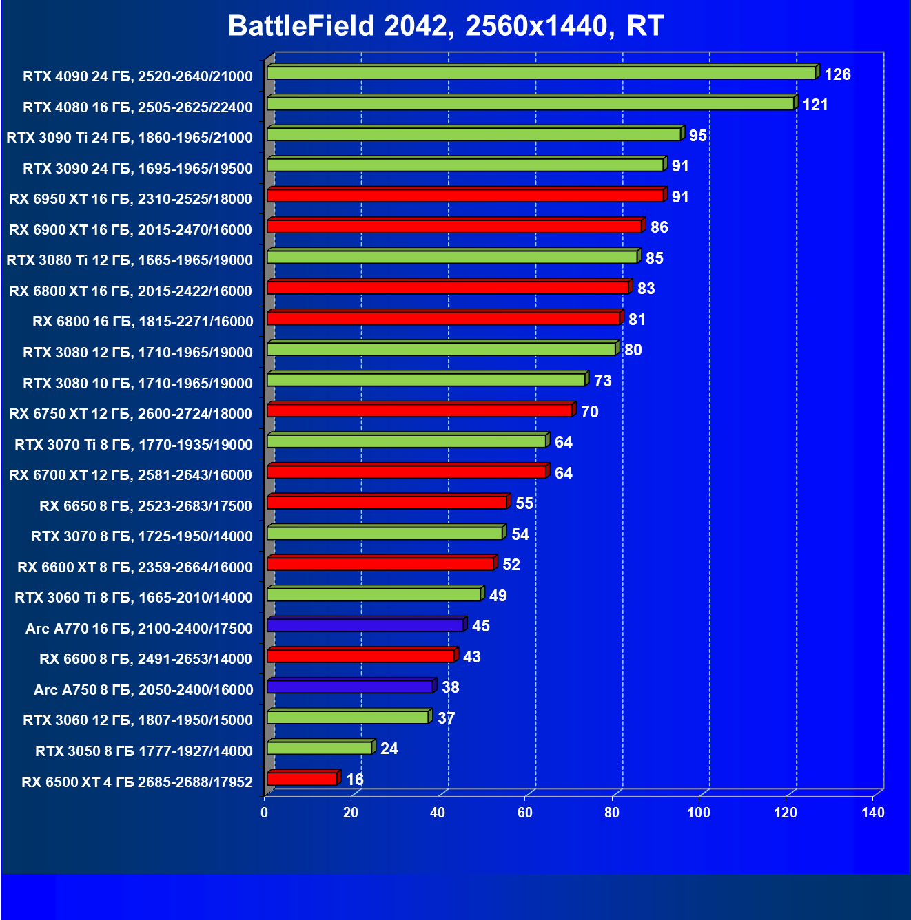 | 13 | Arc A770 16 ГБ, 2100—2400/17500 | 69 | 243 | 35 000 |