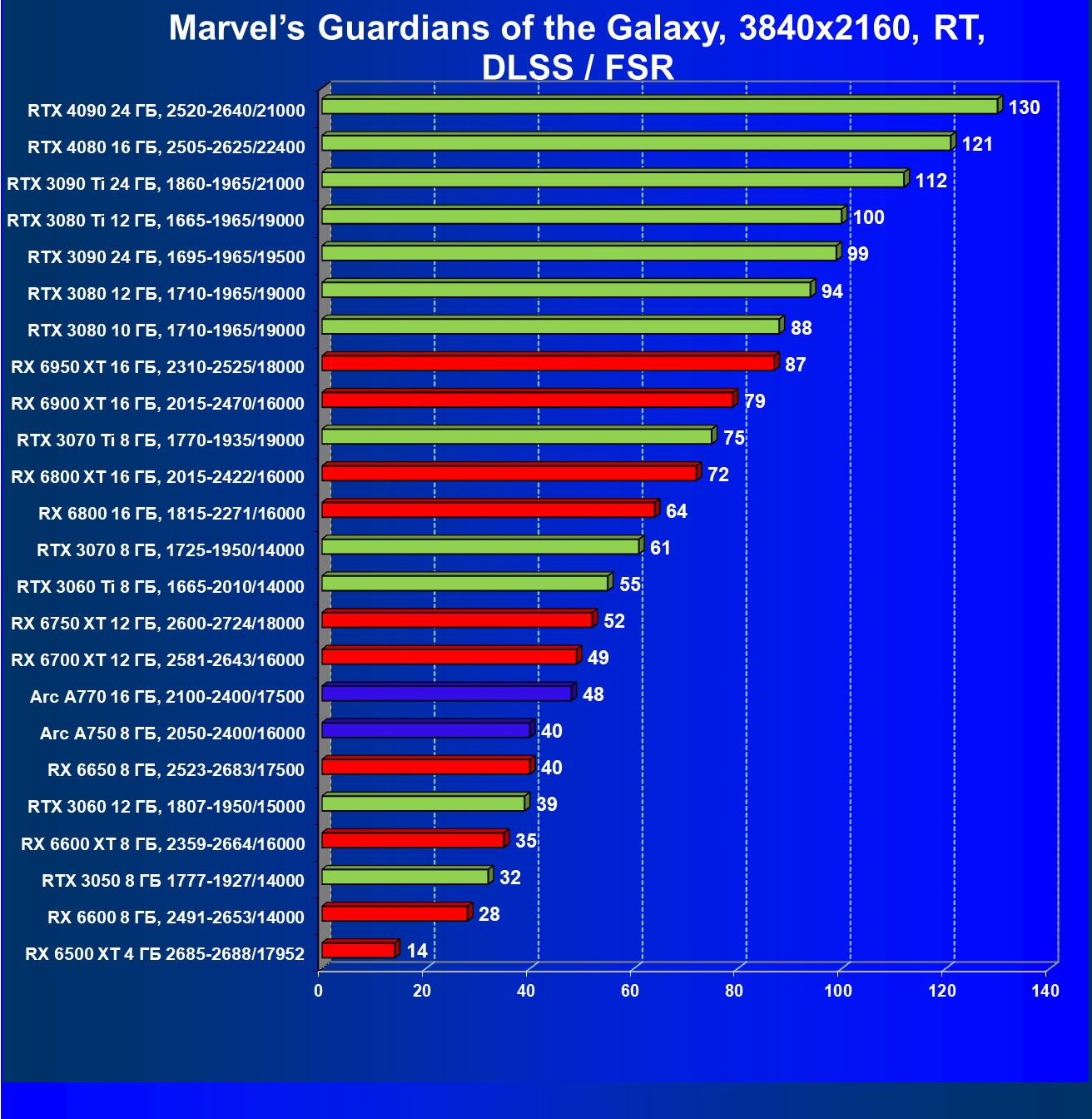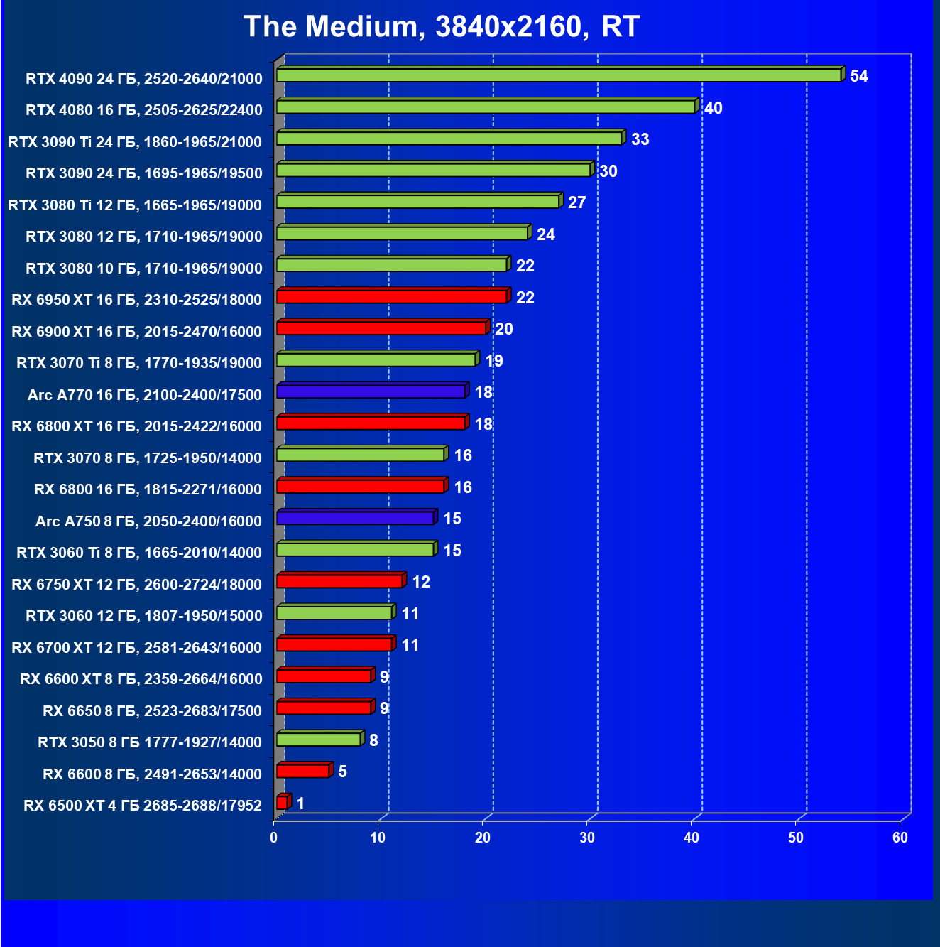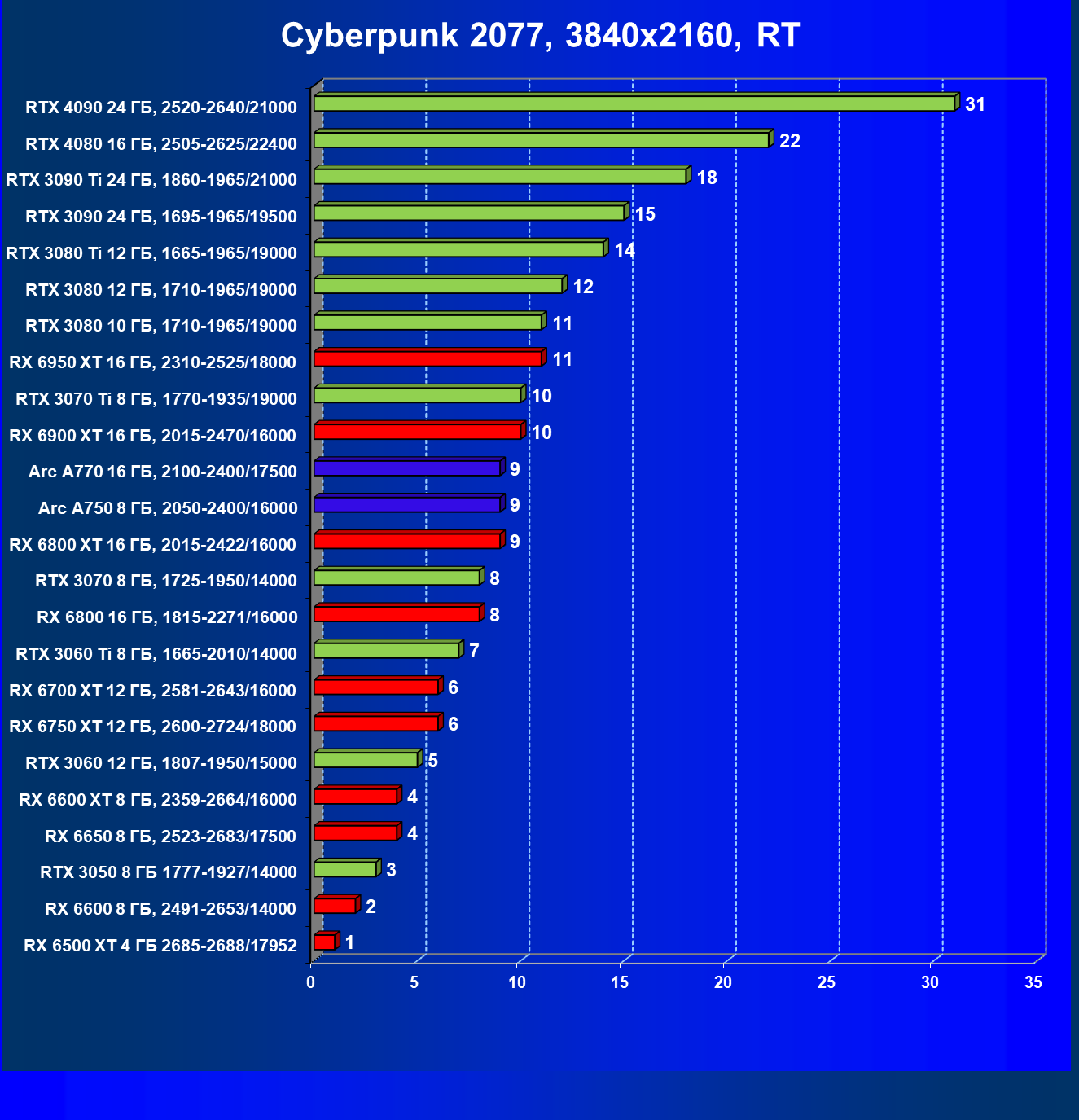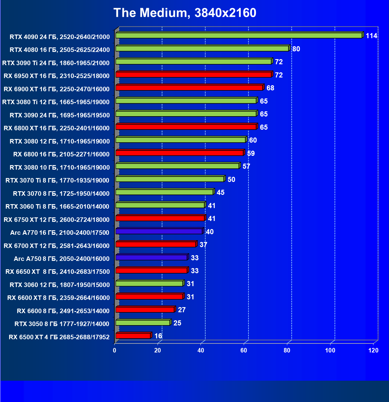 | 17 | Arc A770 16 ГБ, 2100—2400/17500 | 388 | 111 | 35 000 |
