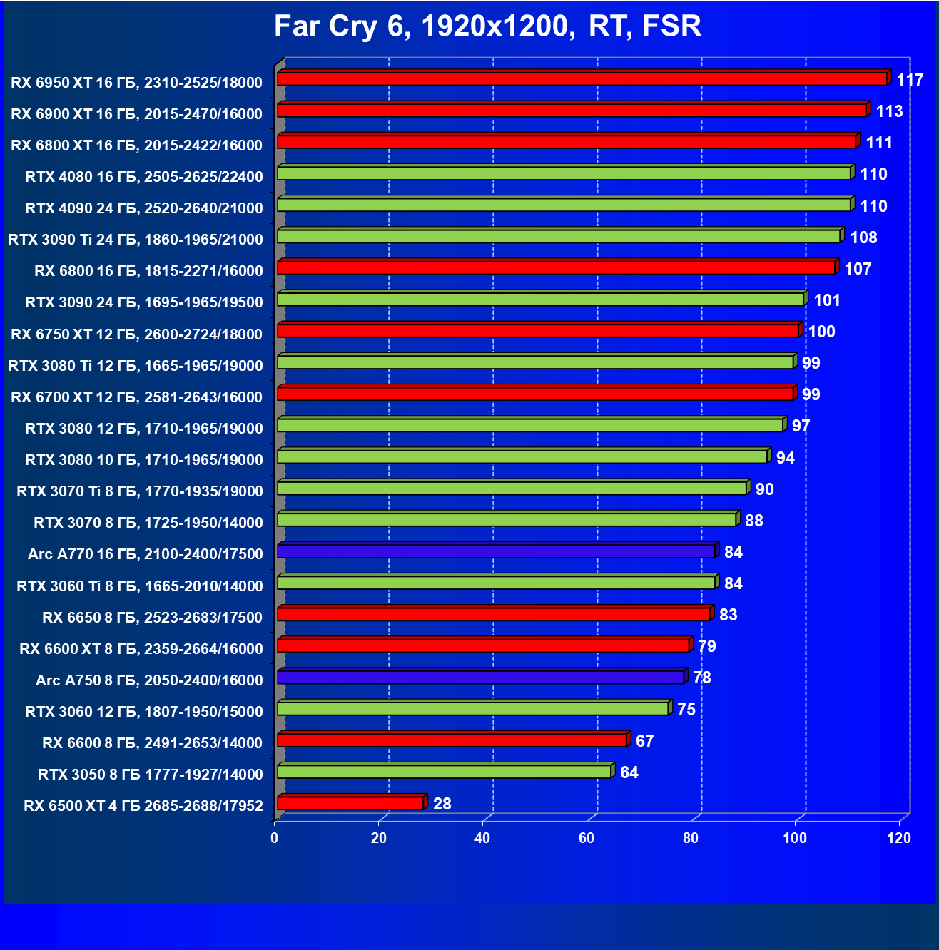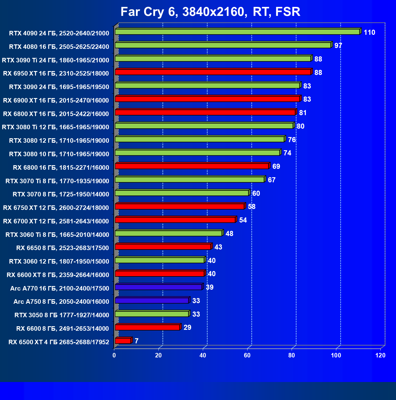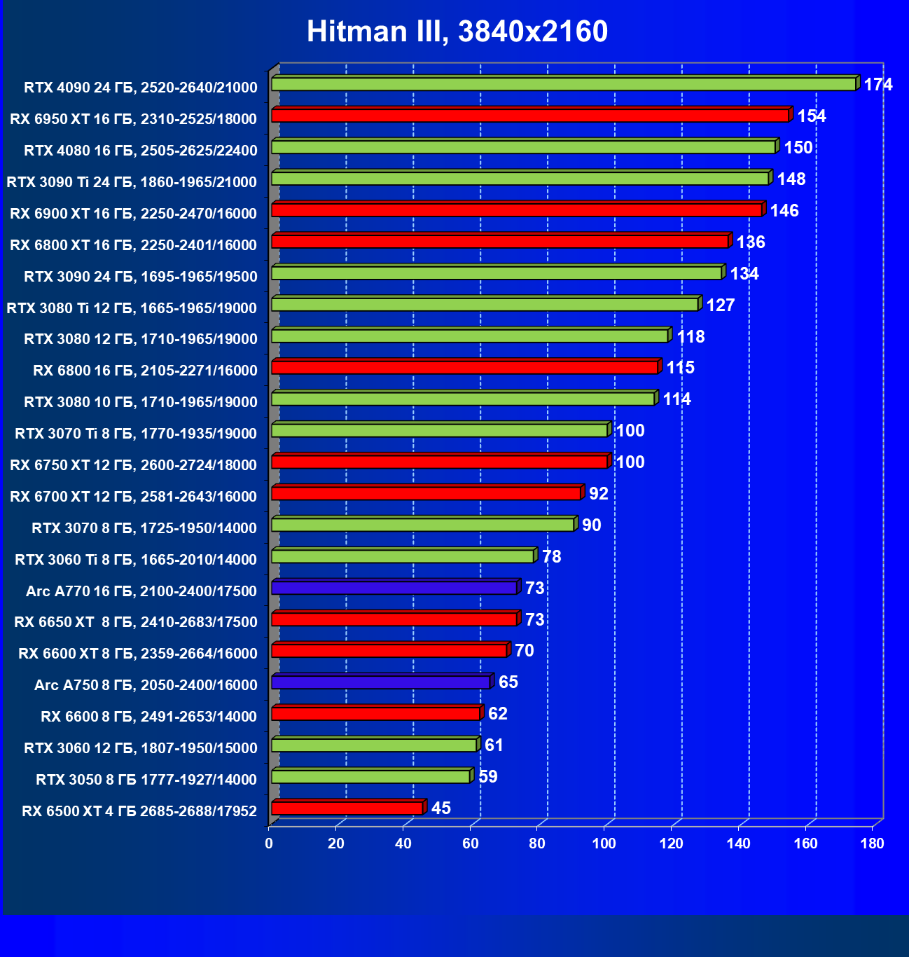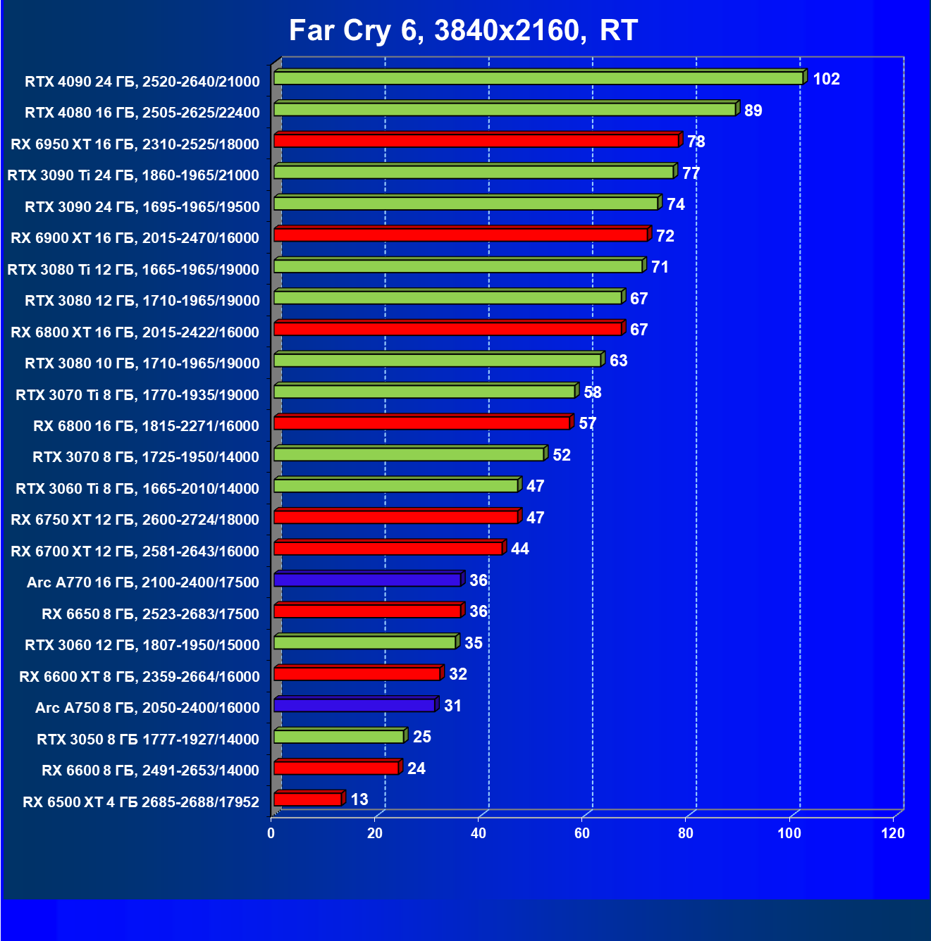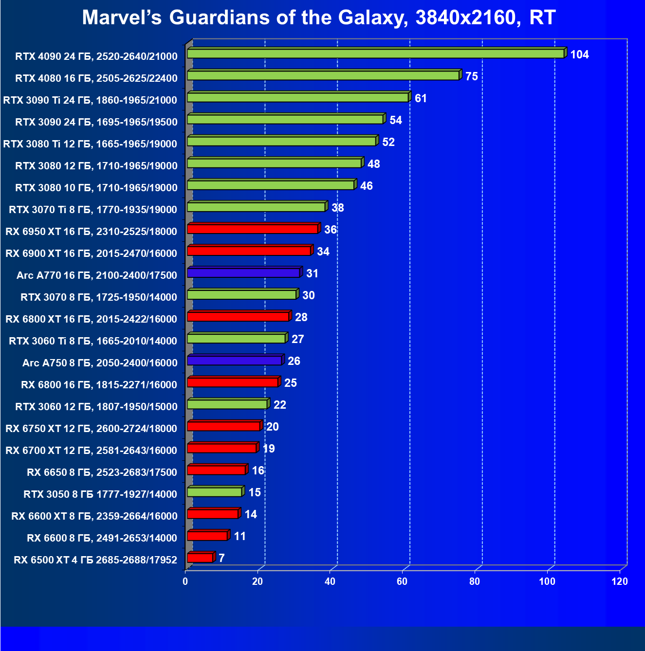 | 17 | Arc A770 16 ГБ, 2100—2400/17500 | 388 | 111 | 35 000 |