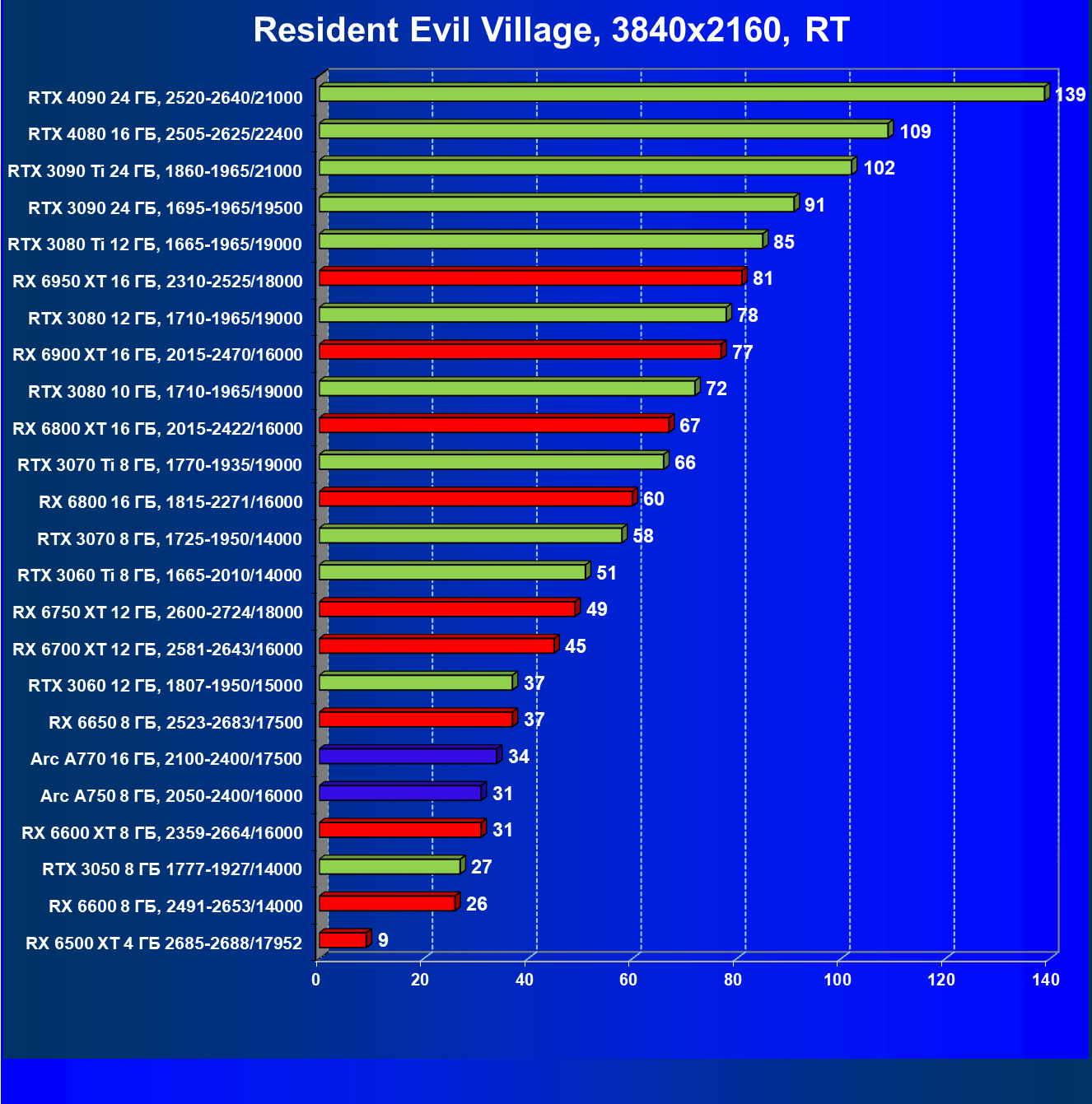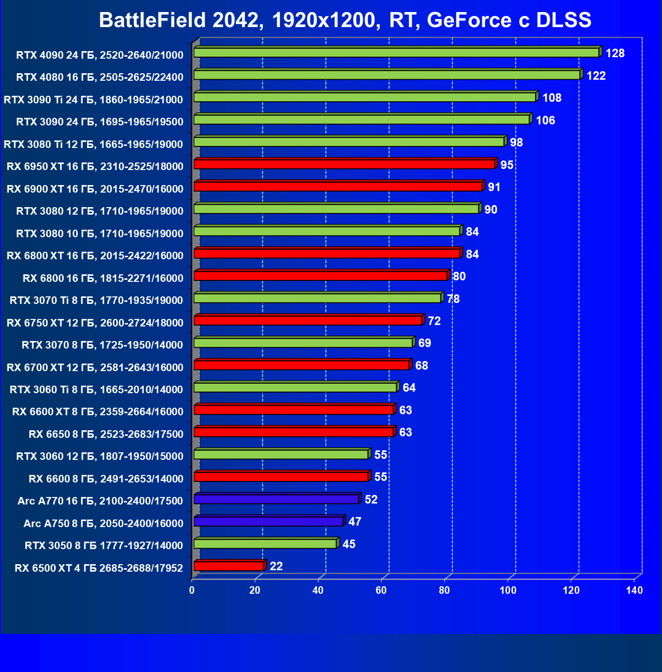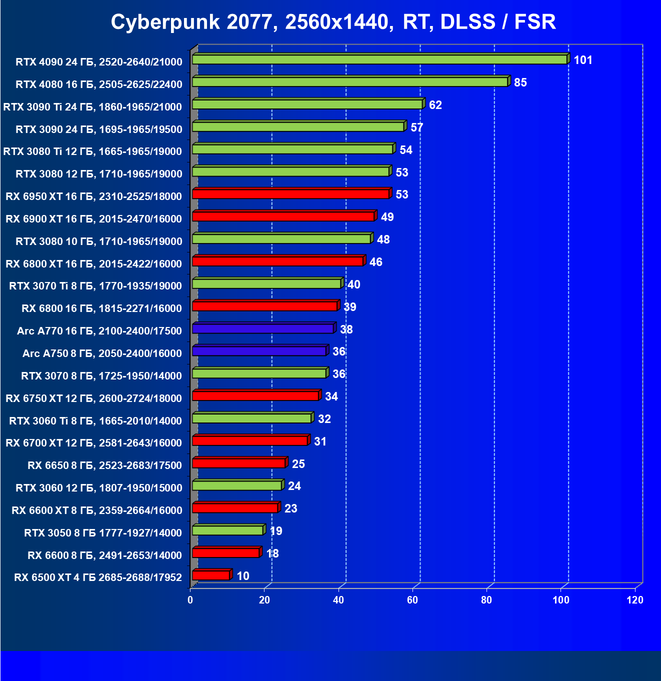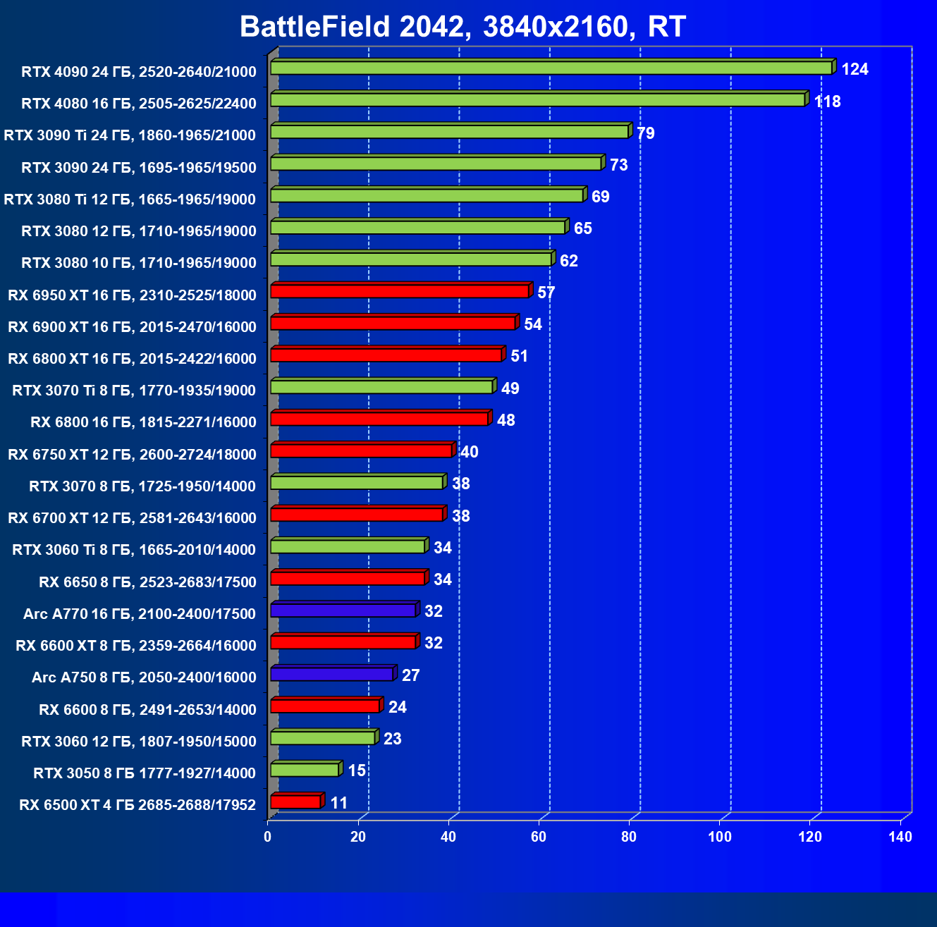| 10 | Arc A770 16 ГБ, 2100—2400/17500 | 111 | 388 | 35 000 |