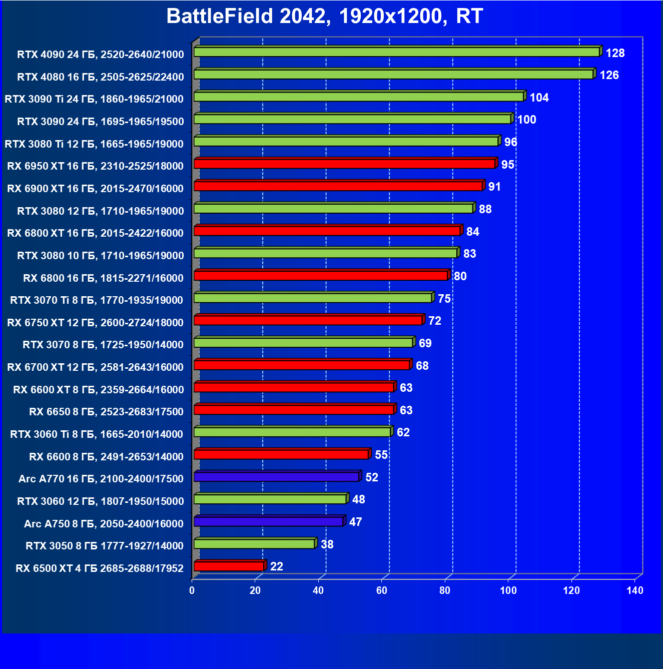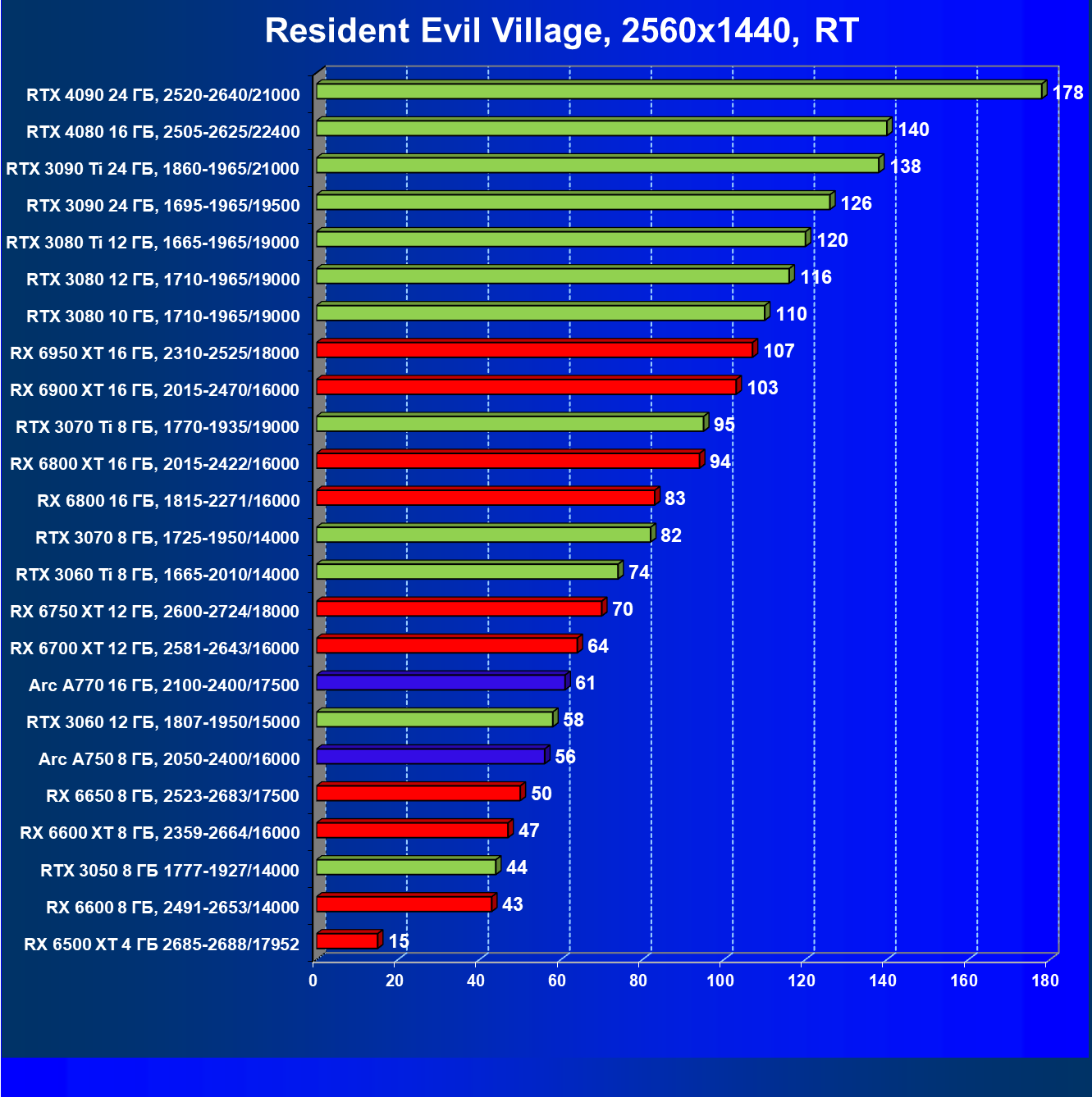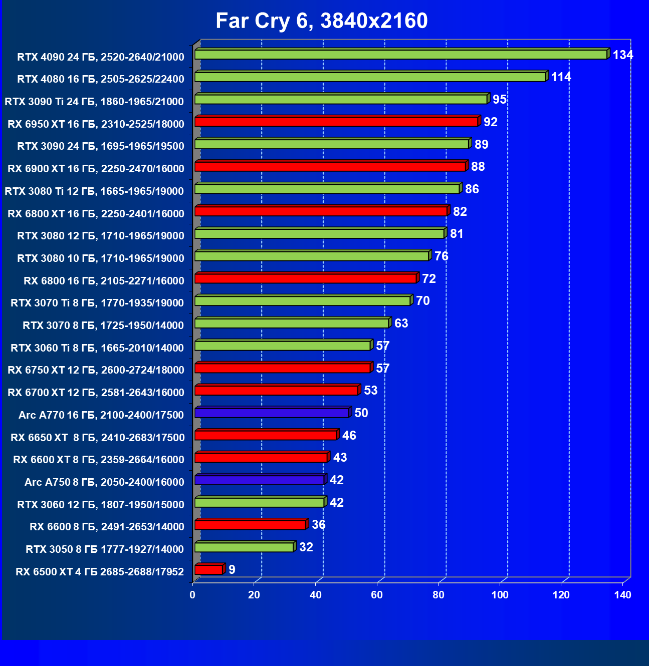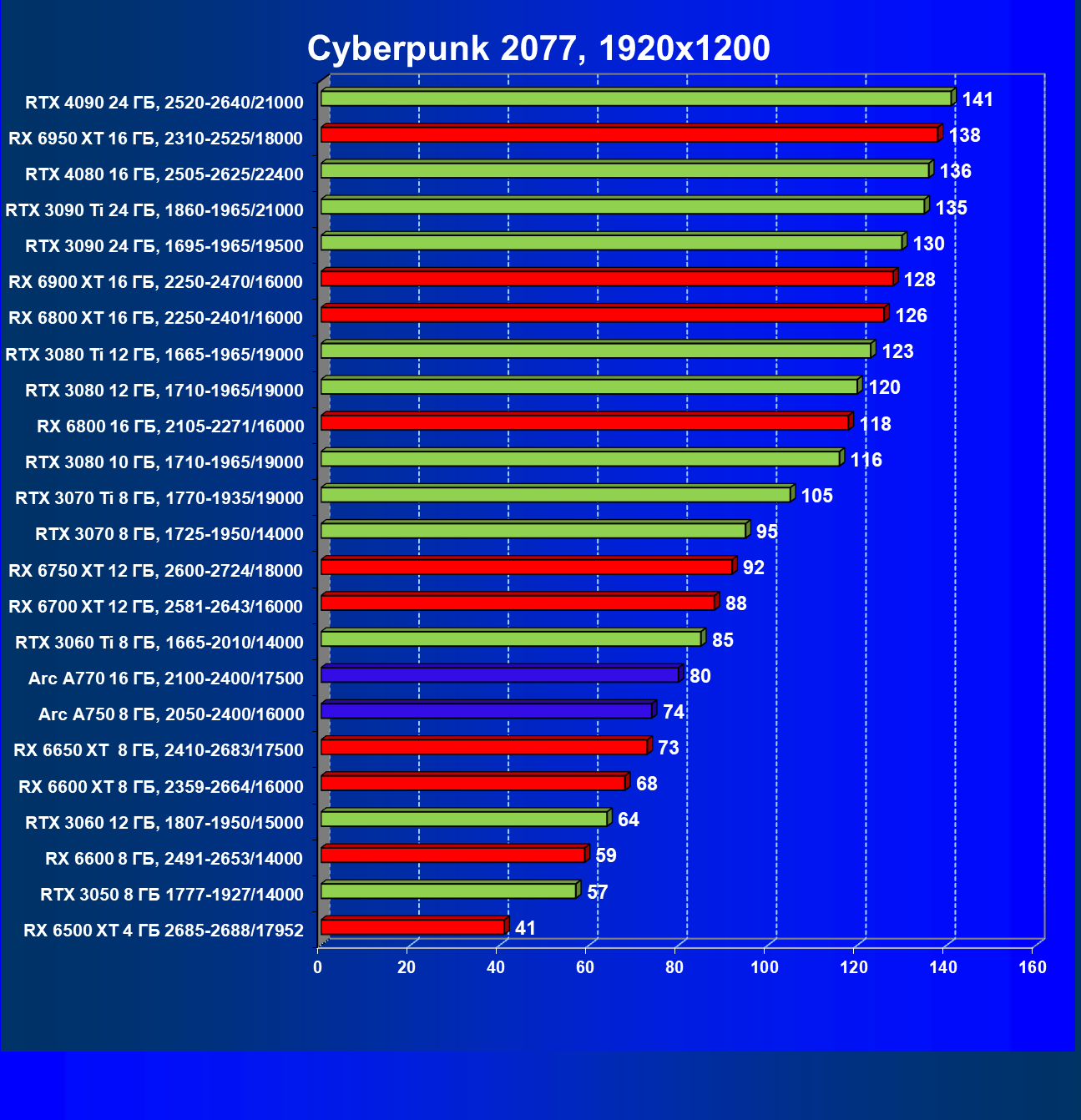 | 10 | Arc A770 16 ГБ, 2100—2400/17500 | 111 | 388 | 35 000 |