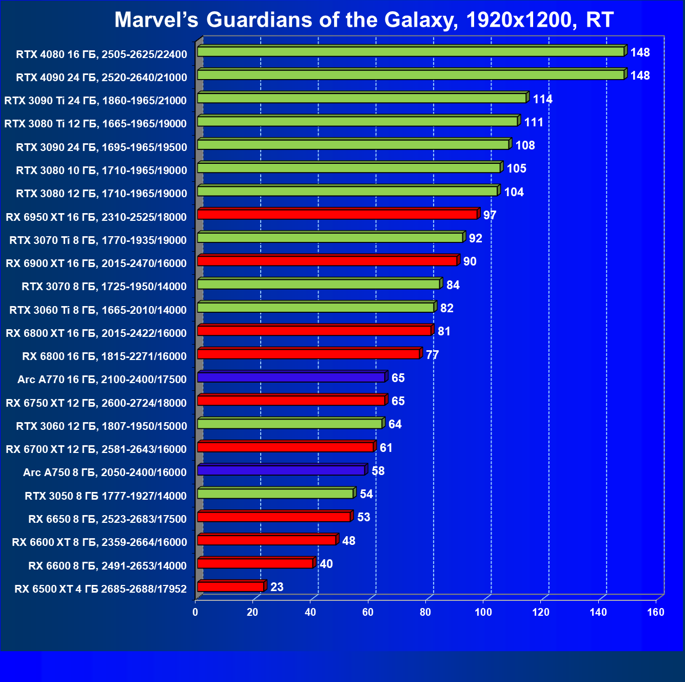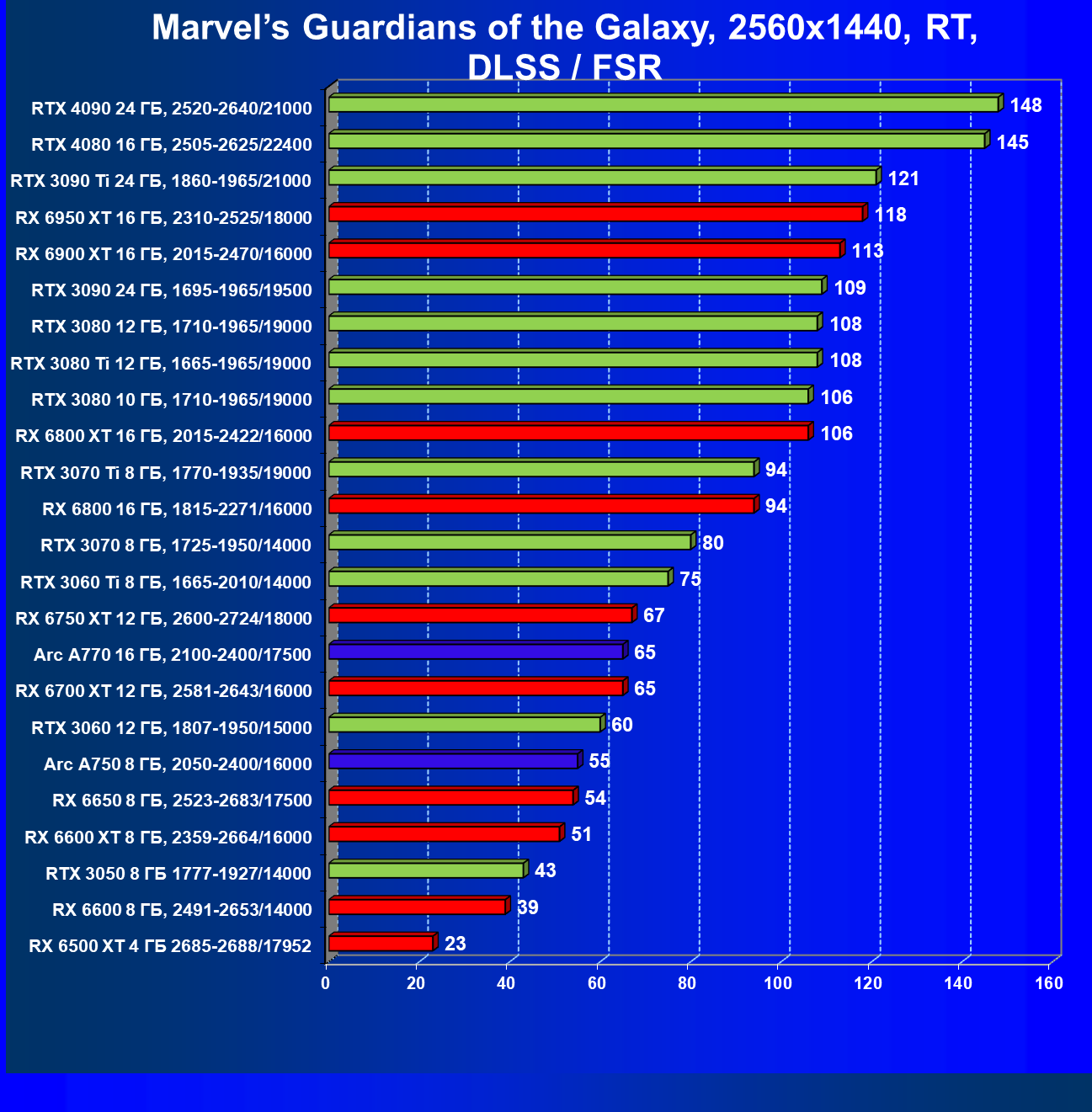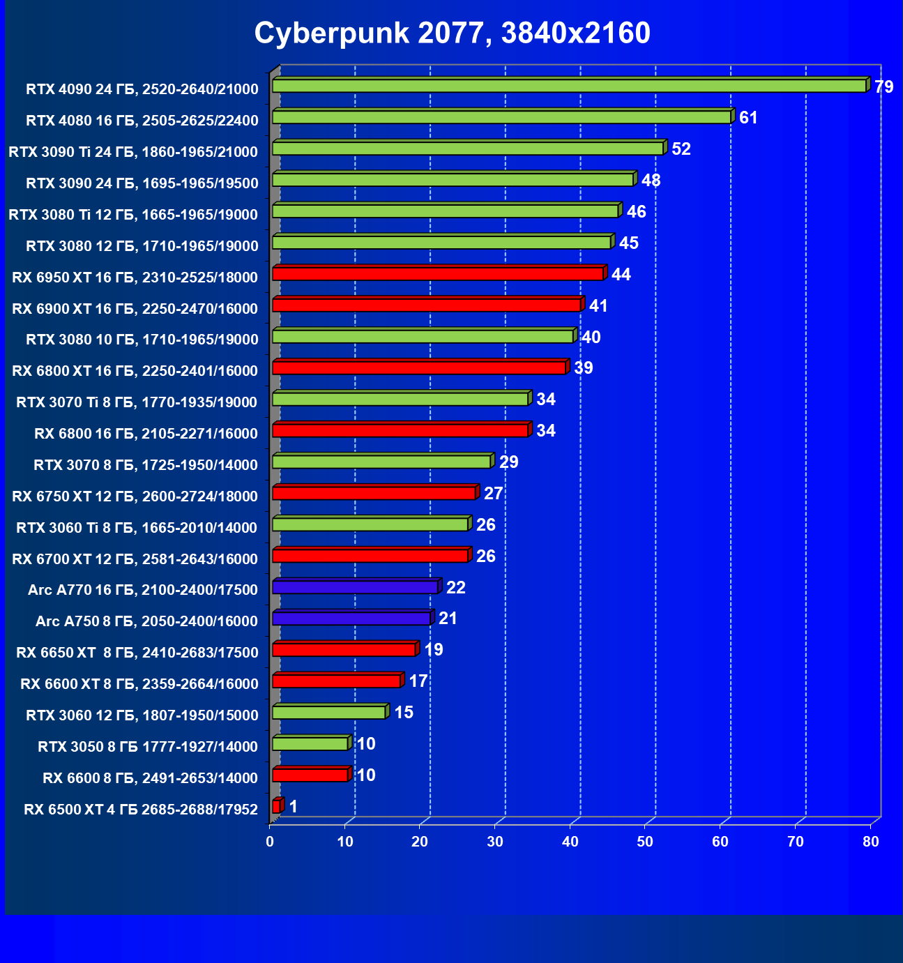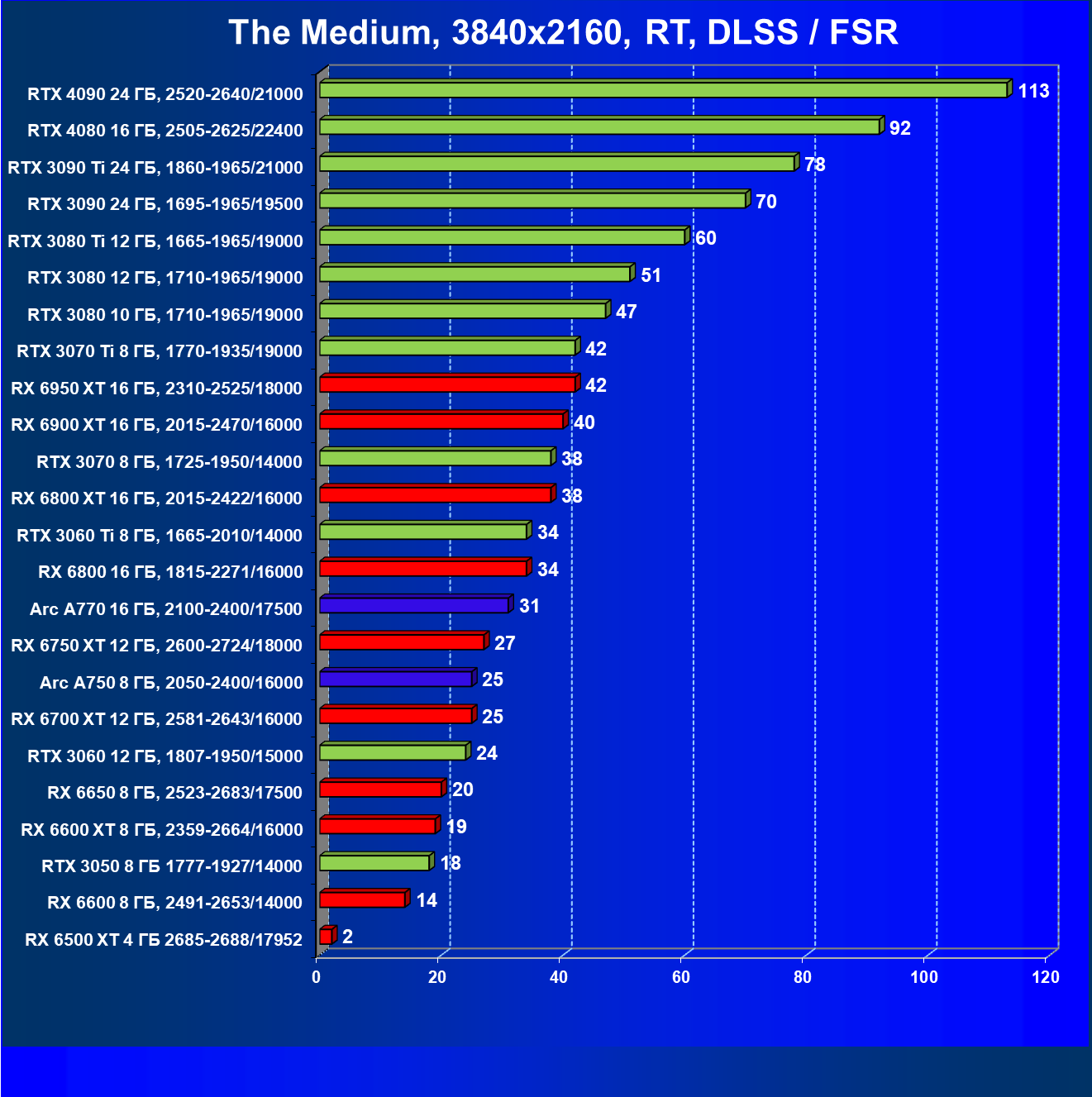 Картина почти аналогична предыдущей, но карты AMD заметно сдают, а вот показатели Arc A770 меняются примерно синхронно с конкурирующими картами Nvidia. Напомним, что для карты Intel применялась технология масштабирования FSR, и интересно будет посмотреть, как изменится ситуация после добавления в игры поддержки XeSS.