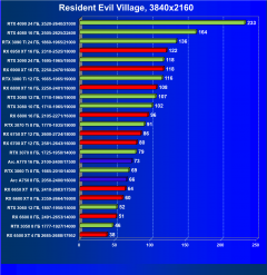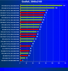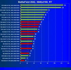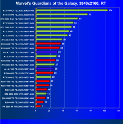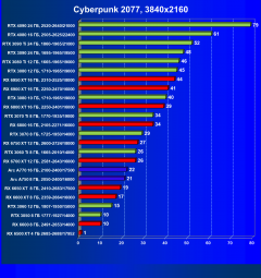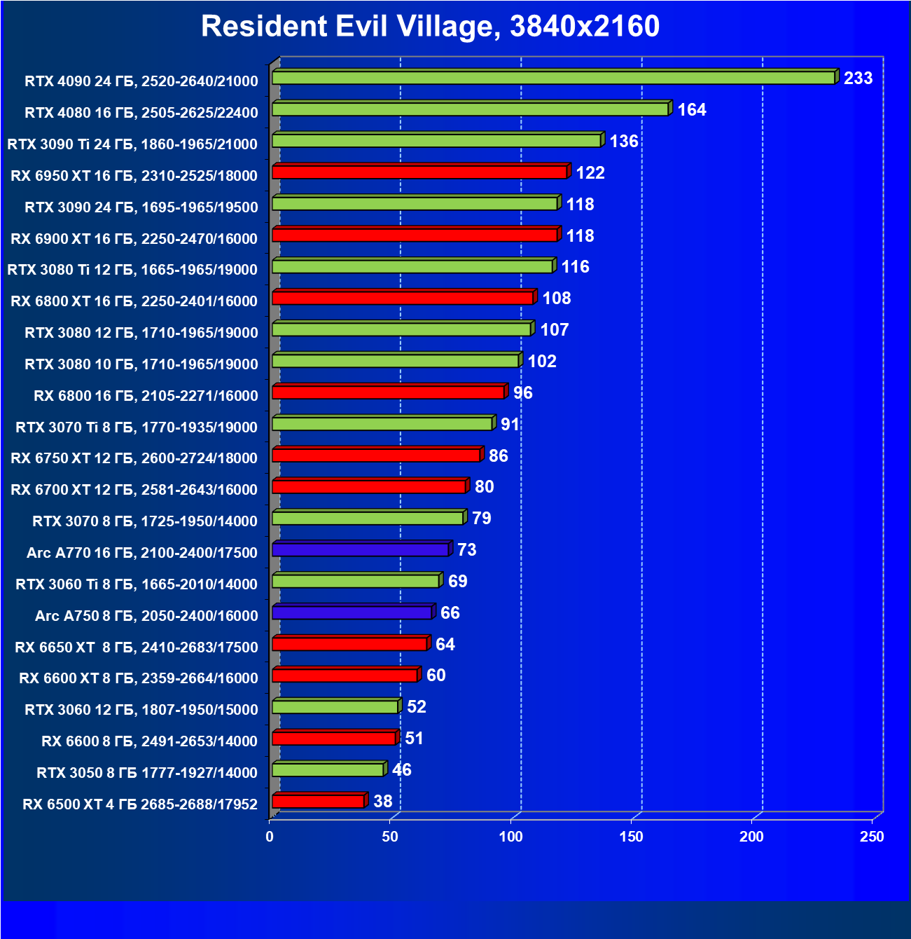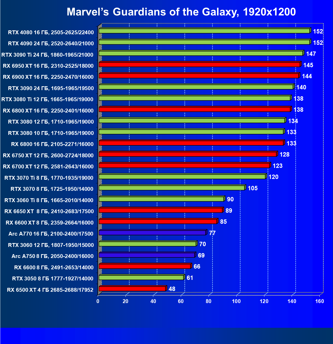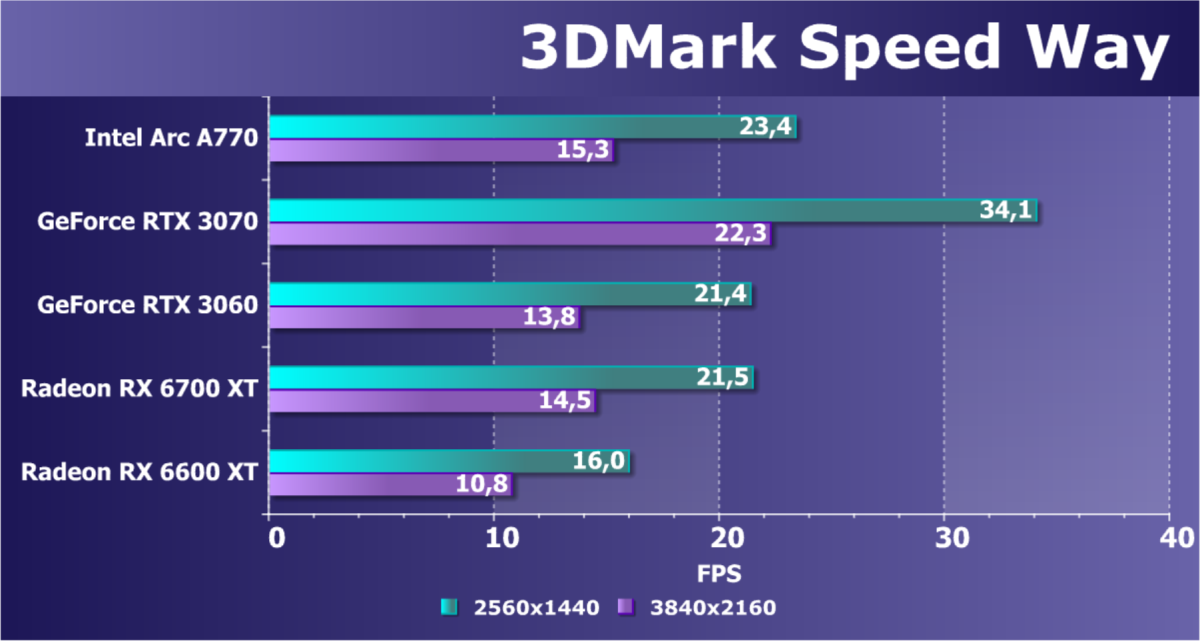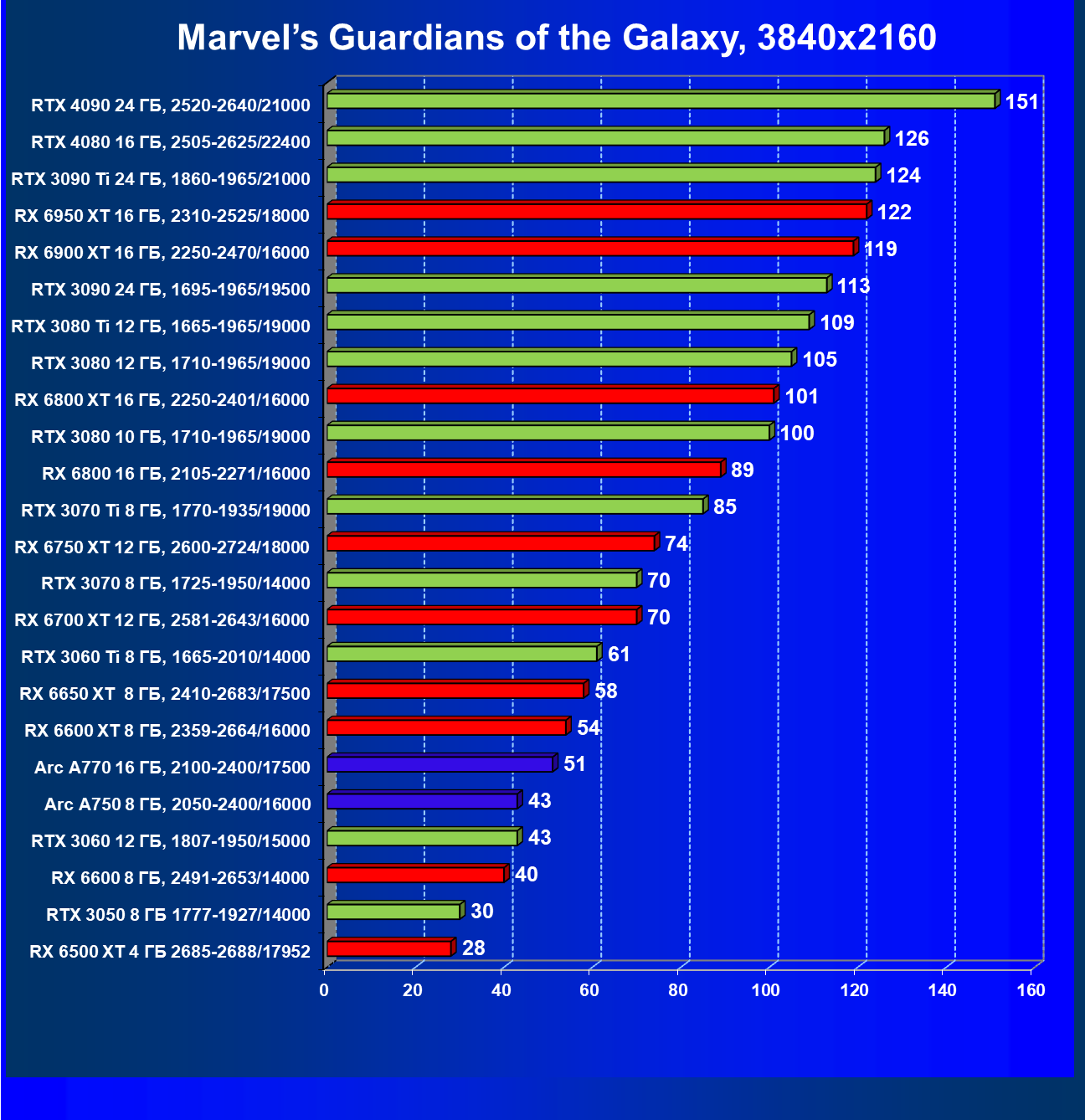 Картина почти аналогична предыдущей, но карты AMD заметно сдают, а вот показатели Arc A770 меняются примерно синхронно с конкурирующими картами Nvidia. Напомним, что для карты Intel применялась технология масштабирования FSR, и интересно будет посмотреть, как изменится ситуация после добавления в игры поддержки XeSS.