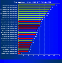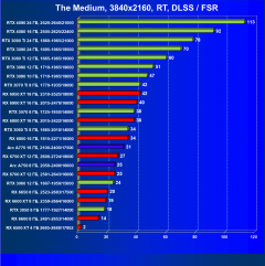 Рейтинг составлен по 9 тестам, в которых используется технология трассировки лучей и одновременно технология Nvidia DLSS или AMD FSR. Этот рейтинг нормирован по самому слабому ускорителю в данной группе — Radeon RX 6500 XT (то есть сочетание скорости и функций Radeon RX 6500 XT приняты за 100%).
