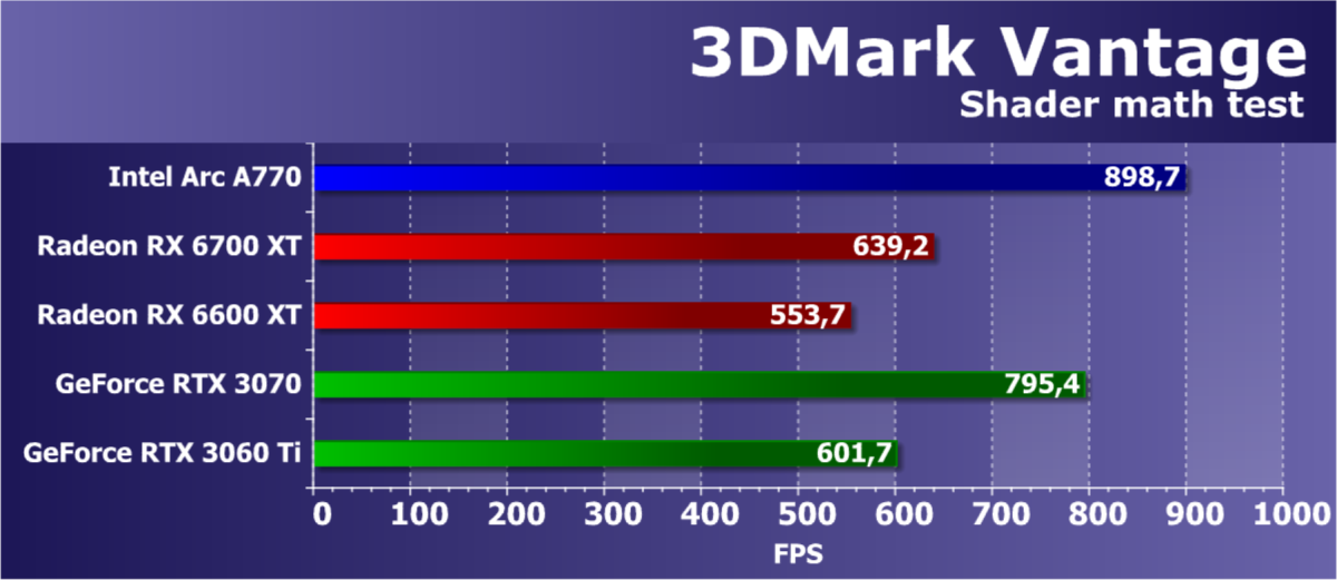 Для анализа производительности видеокарты Arc A770 мы взяли по несколько моделей от обеих компаний, конкурирующих с Intel. Во-первых, от Nvidia мы выбрали GeForce RTX 3060 (GA106), как конкурента по рекомендованной цене (хотя по реальным розничным дела обстоят несколько иначе), но так как в синтетических тестах нам интересны не только ценовые соперники, но и примерно равные GPU по сложности и площади кристалла, то добавили к ней еще и парочку GeForce на более сложном чипе GA104 с разной степенью урезанности: RTX 3060 Ti и RTX 3070.