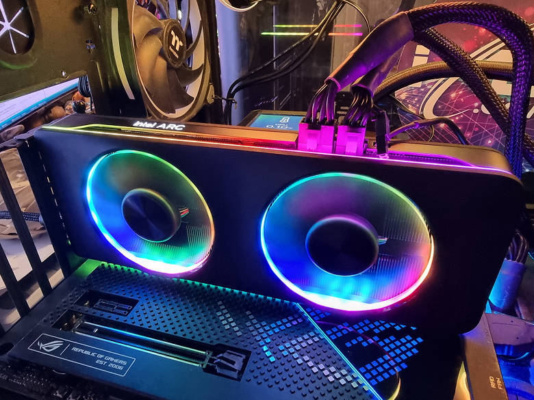Конкретная протестированная нами карта Intel Arc A770 Limited Edition (16 ГБ) обладает довольно компактными размерами, занимая всего 2 слота в системном блоке. Карта имеет 2 разъема питания (8- и 6-контактный), стандартный набор видеовыходов, но с поддержкой более современных версий стандартов (три DP 2.0 и один HDMI 2.1). Отметим тихую и довольно эффективную систему охлаждения, вентиляторы которой, однако, почти не выключаются в простое. Подсветка придает карте оригинальности, хотя мы не привыкли к тому, что для этого требуется подключать дополнительный USB-кабель.