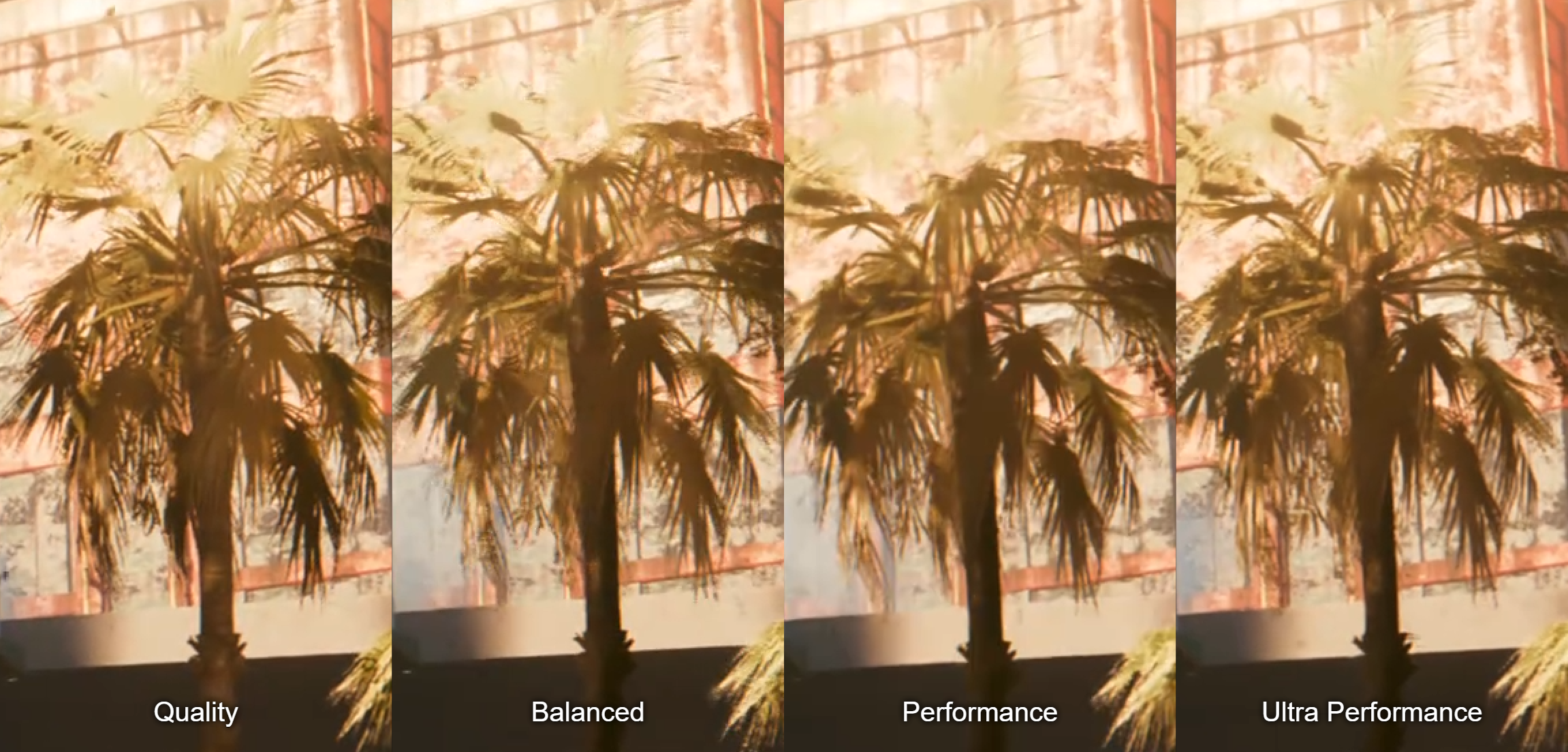 Именно на них лучше всего видно разницу между всеми режимами по детализации текстур. Конечно, режим Quality показал себя лучше всех, Balanced немного уступает ему, Performance уже побольше, оставаясь приемлемым, а вот Ultra Performance уже очень сильно страдает от низкого входного разрешения, показывая артефакты и мыло вместо четких материалов, что объяснимо очень низким исходным разрешением рендеринга. А вот грани сглажены неплохо во всех случаях, нечеткими выглядят в основном текстуры — с этим ничего не поделать, когда разрешения рендеринга не хватает. Ну и то же самое в динамике:
