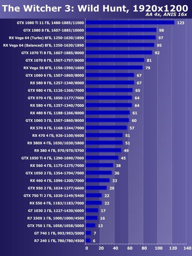 Мысленно соединяя верхушки столбцов на диаграммах, можно оценить, насколько та или иная игра требовательна к карте и (или) к центральному процессору. Если кривая выпуклая и много карт показывают схожие результаты, то в данном разрешении и при данной нагрузке производительность упирается в ресурсы системы, а не в потенциал ускорителей. А если, напротив, кривая вогнутая и по мере снижения мощи топовых ускорителей резко снижается производительность, то тут все ясно: игра очень сильно нагружает видеокарты, так что скорость зависит только от возможностей акселератора.