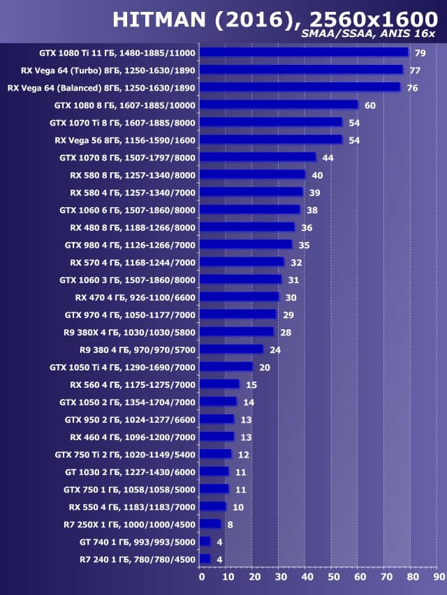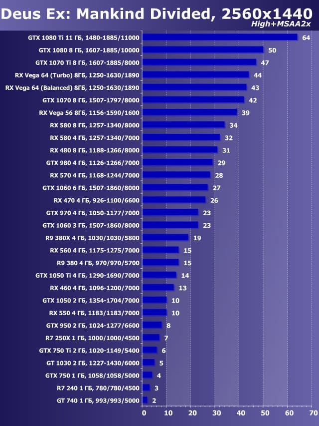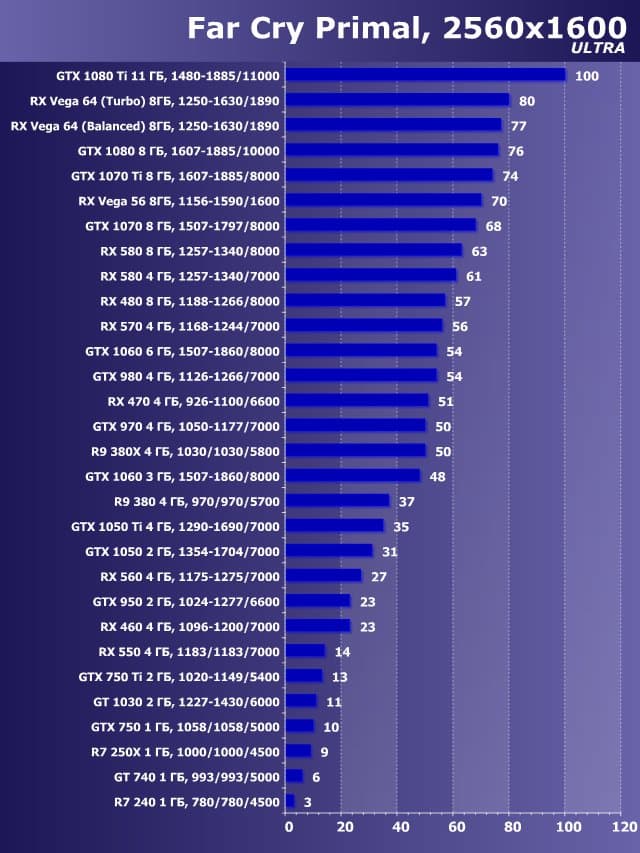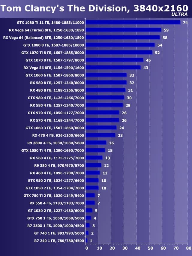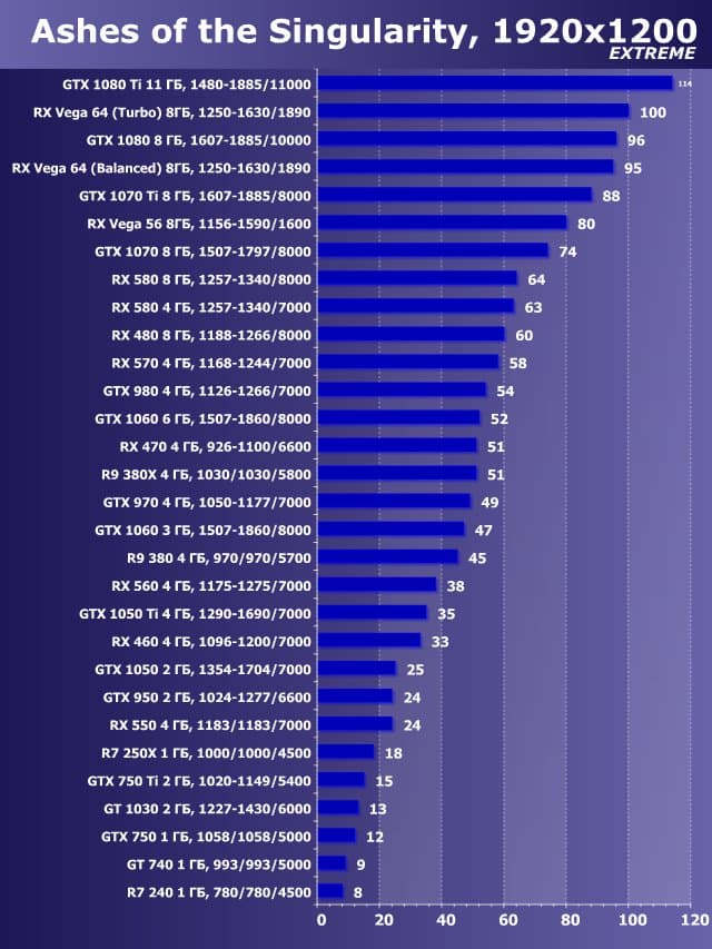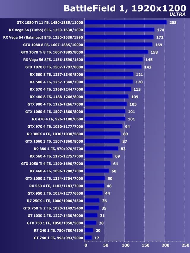 | 11 | GTX 1050 2 ГБ, 1354—1704/7000 | 558 | 530 | 9500 |