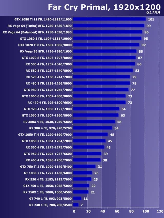 | 21 | RX 460 4 ГБ, 1096—1200/7000 | 550 | 705 | 7800 |