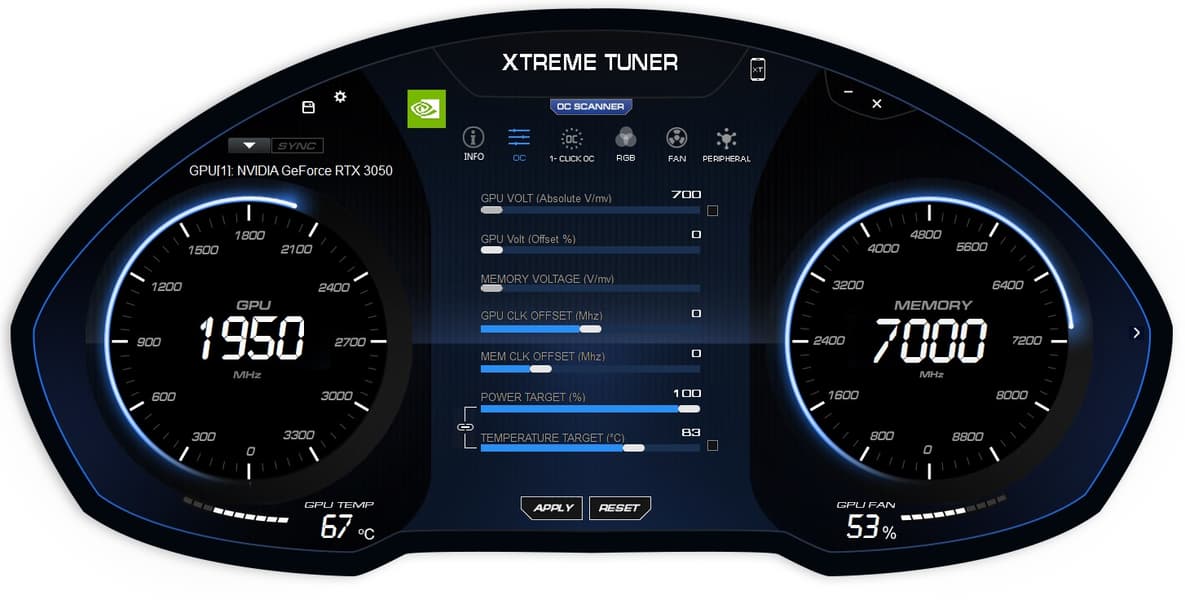 Работа видеокарты управляется фирменной утилитой Xtreme Tuner Plus. Эта программа позволяет слегка разогнать графический процессор одним нажатием кнопки 1-Сlick OC, однако в результате выполнения этой процедуры максимальная частота поднялась всего на 15 МГц, что не увеличит производительность даже на процент.