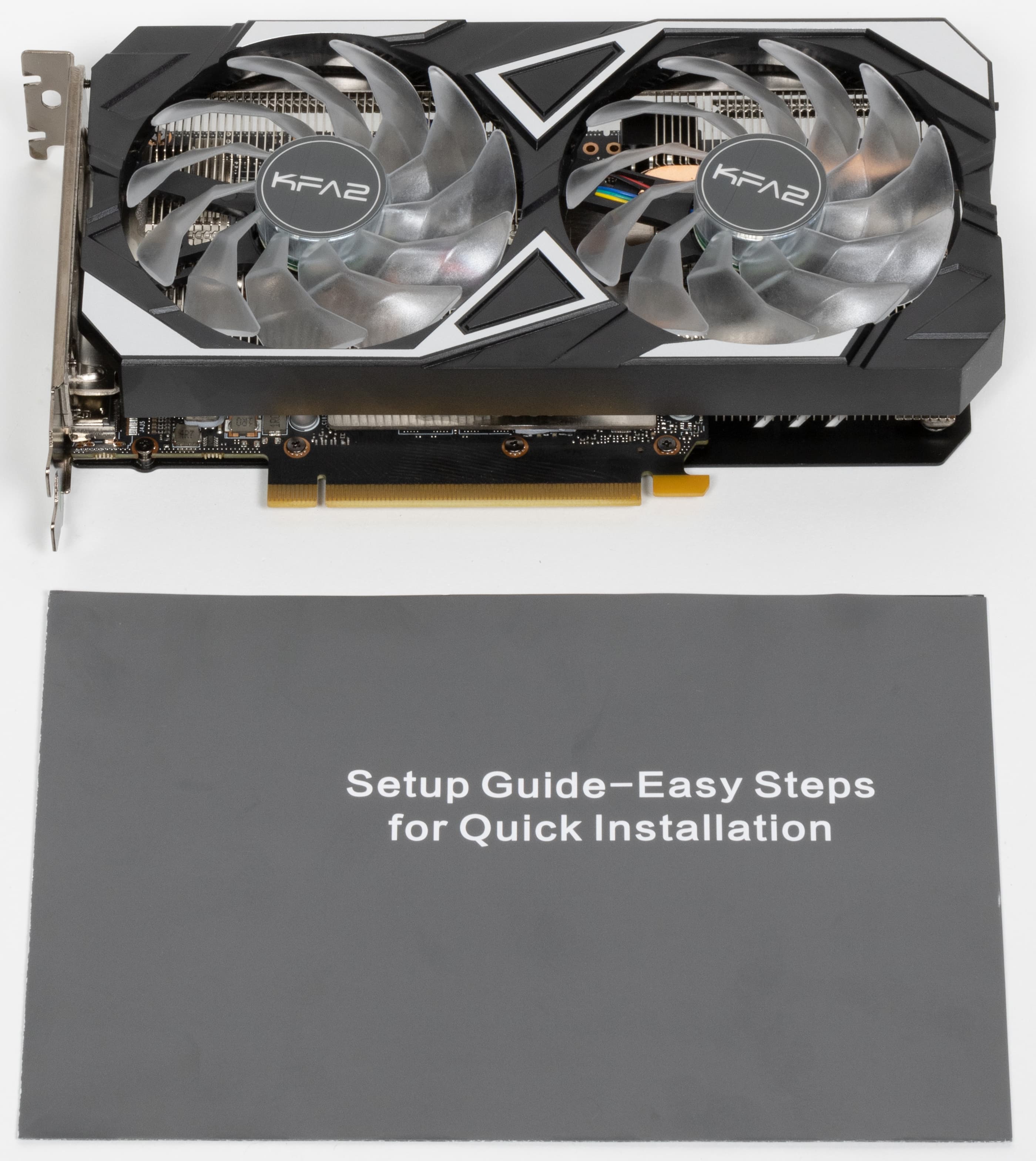 KFA2 GeForce RTX 3050 X Black — продвинутая версия карты этого производителя на GeForce RTX 3050, у нее много улучшений относительно базовой версии (у KFA2 она называется Core). В частности, у всех базовых моделей на GeForce RTX 3050 используется сравнительно небольшой радиатор с одним вентилятором.