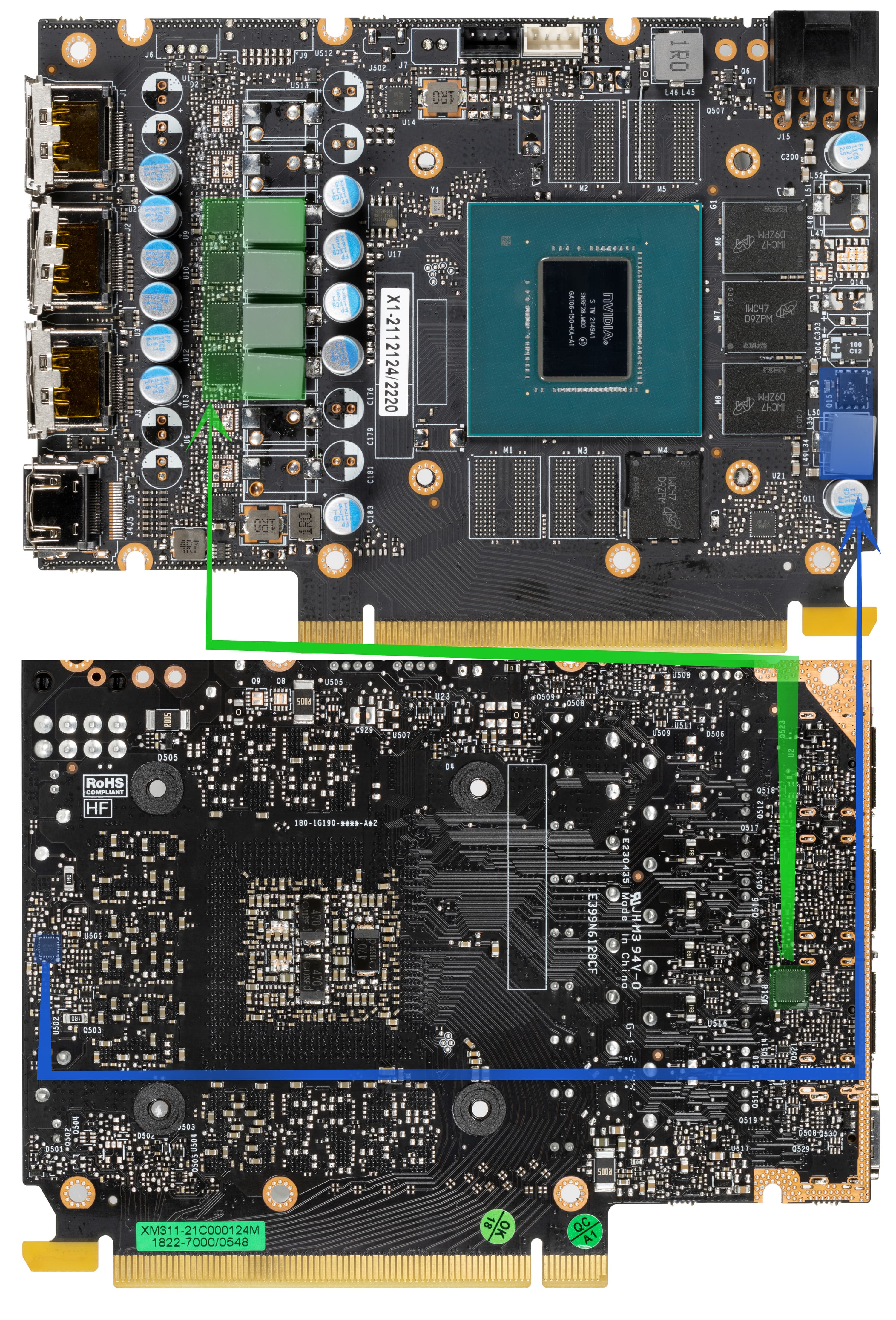Зеленым отмечены фазы питания и ШИМ-контроллер в схеме питания графического процессора, а синим — фазы питания и ШИМ-контроллер для снабжения микросхем памяти.