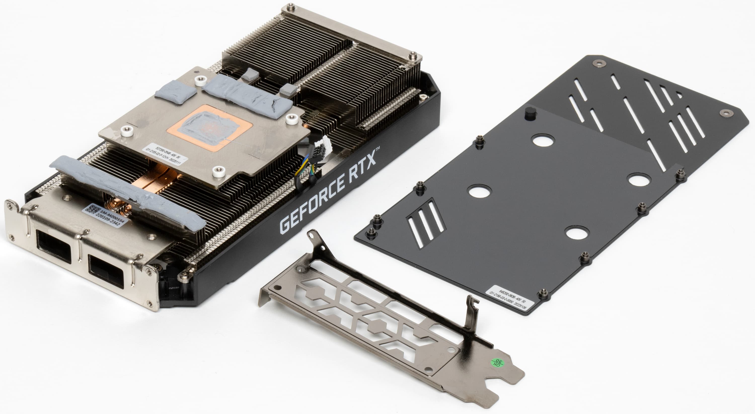 В данном случае использован двухсекционный радиатор пластинчатого типа, обе части которого соединяются тепловыми трубками, прижимающимися к большому основанию с медной вставкой, которое охлаждает ядро и микросхемы памяти. Преобразователи питания охлаждаются отдельной подошвой.