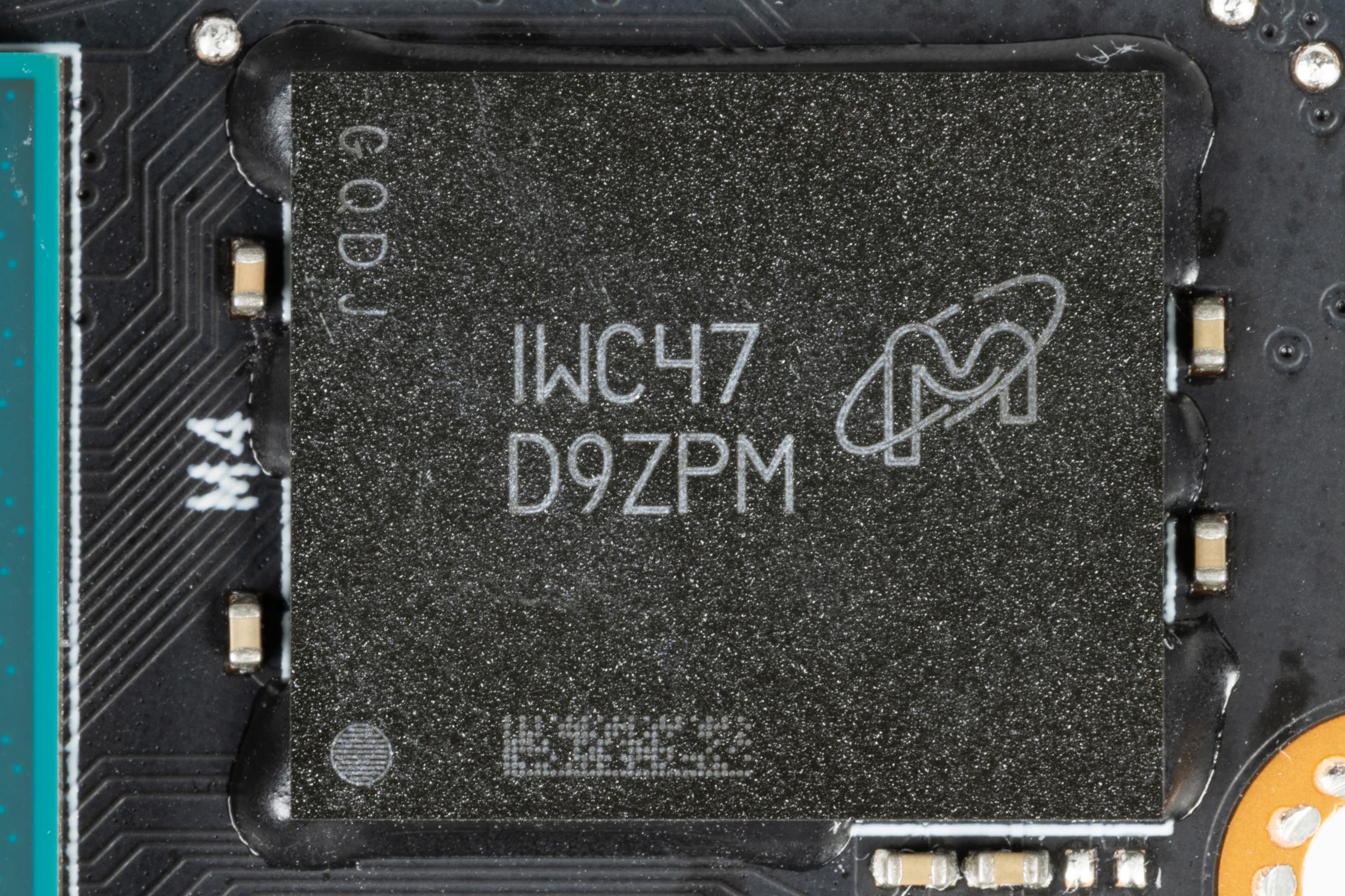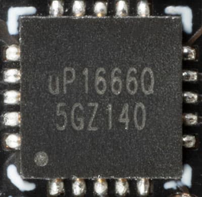 На той же оборотной стороне имеется ШИМ-контроллер uP1666Q (uPI Semiconductor), который управляет однофазной схемой питания четырех микросхем памяти.