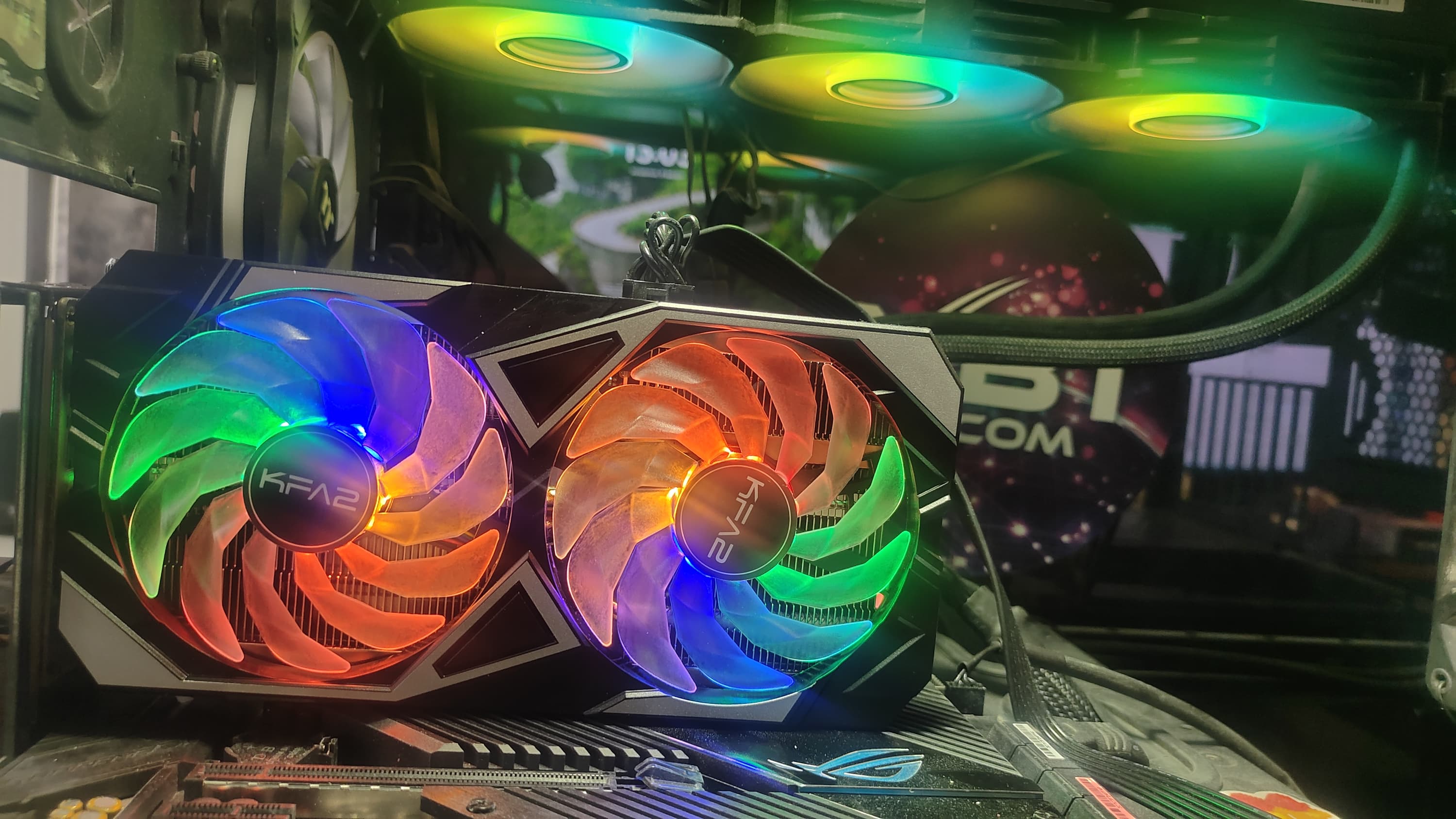 Ручной разгон видеокарты KFA2 позволил получить +130 МГц по ядру и +1000 МГц по памяти (лимит потребления поднять невозможно), так что итоговые частоты составили 2080 и 16000 МГц соответственно. Прирост частоты GPU — 7% относительно референсного значения, что на практике дало прибавку в производительности около 5%.