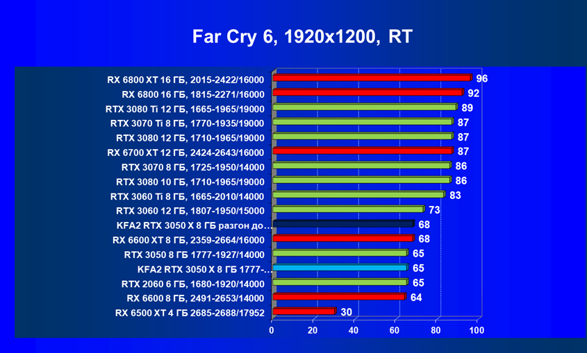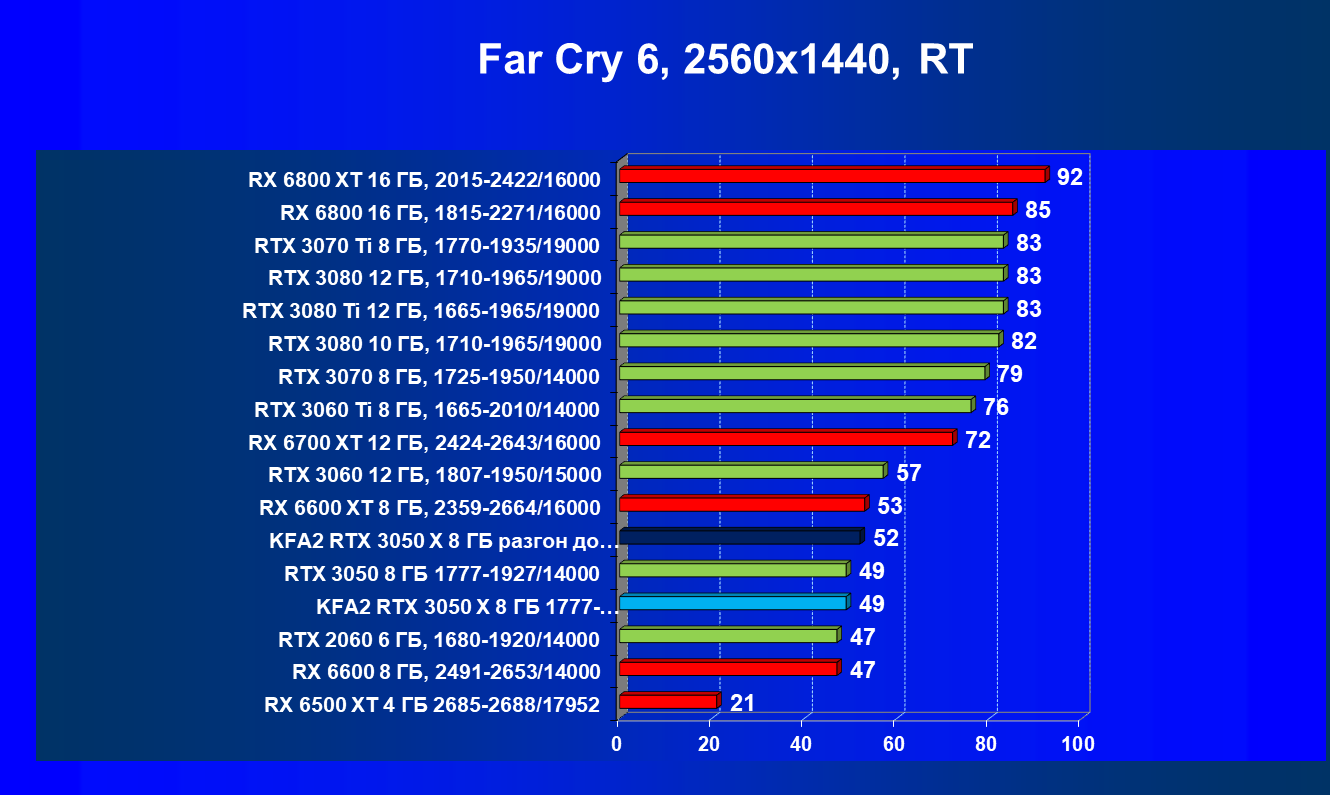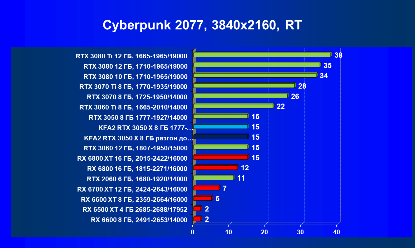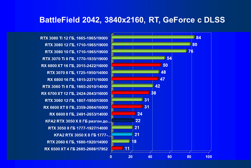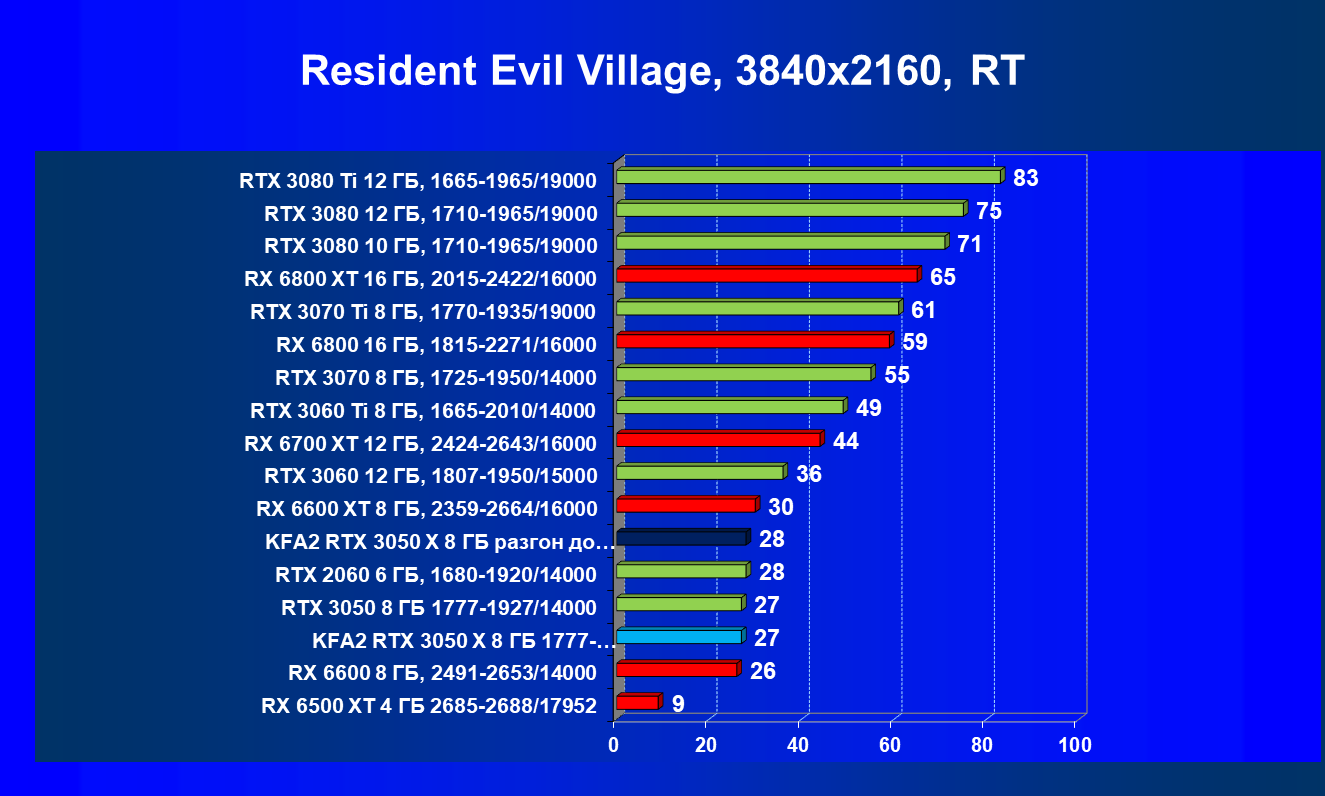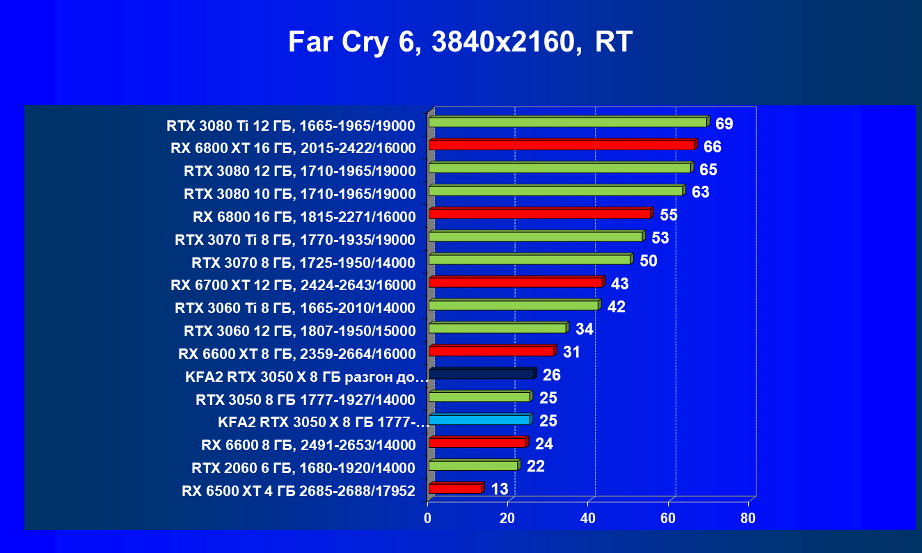 Результаты тестов в «классических» играх (без трассировки лучей) показали, что KFA2 GeForce RTX 3050 X находится на уровне между GeForce RTX 2060 и GeForce RTX 3060, обычно ближе к первому. При ручном разгоне производительность достигает видеокарты RX 6600, которая подороже.