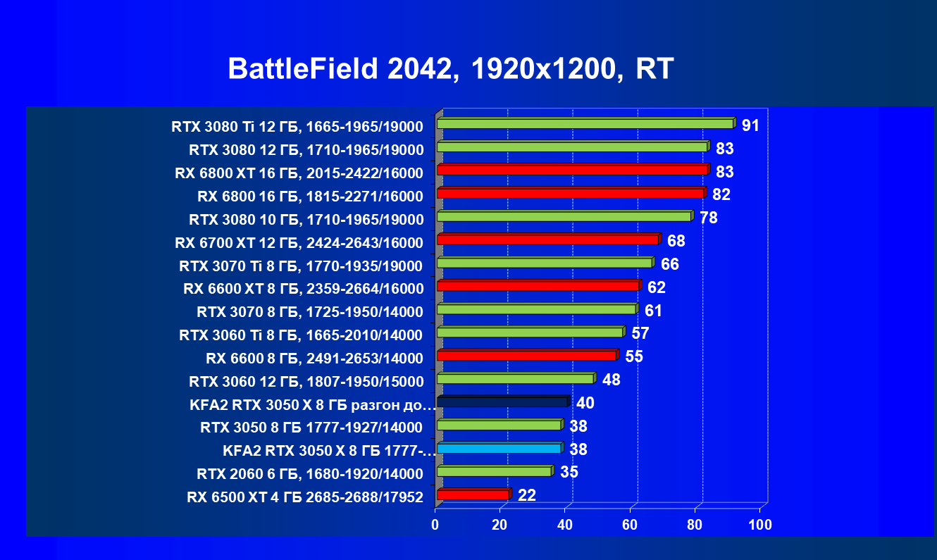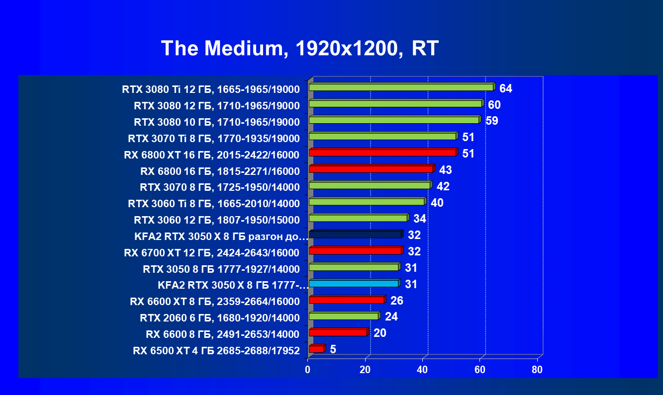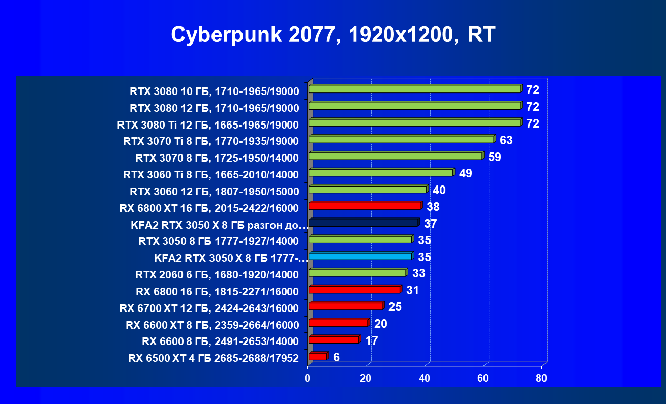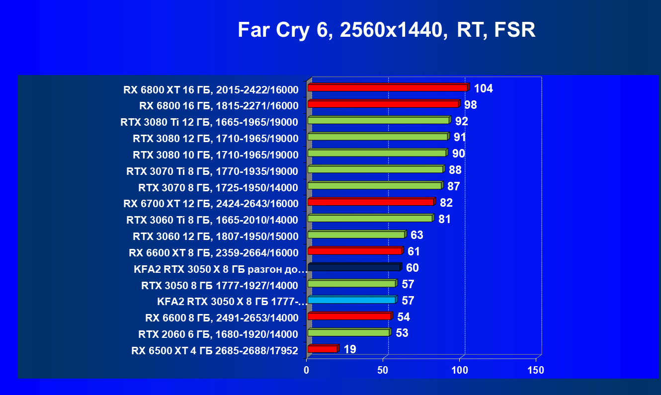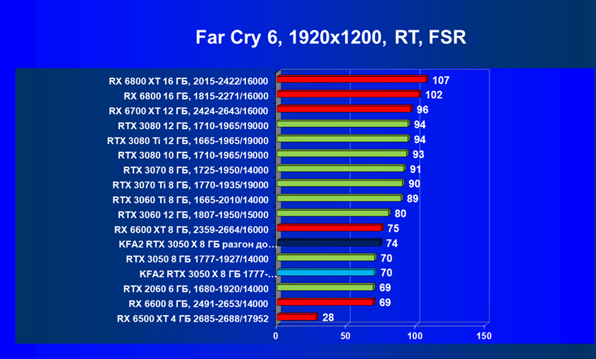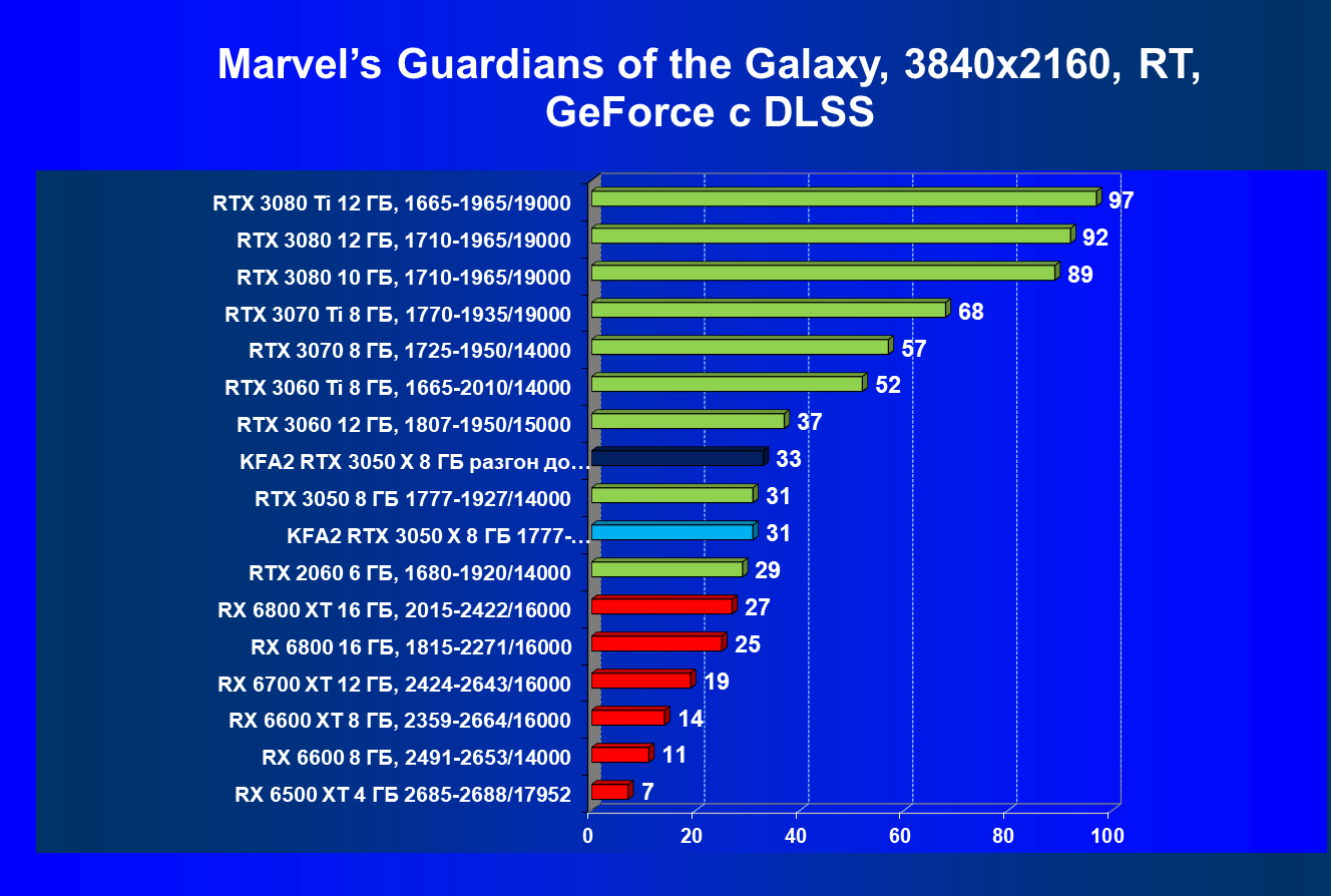 Результаты тестов в «классических» играх (без трассировки лучей) показали, что KFA2 GeForce RTX 3050 X находится на уровне между GeForce RTX 2060 и GeForce RTX 3060, обычно ближе к первому. При ручном разгоне производительность достигает видеокарты RX 6600, которая подороже.