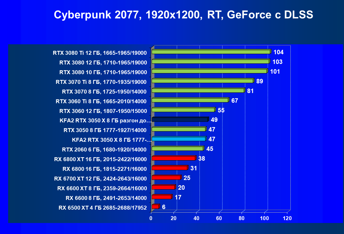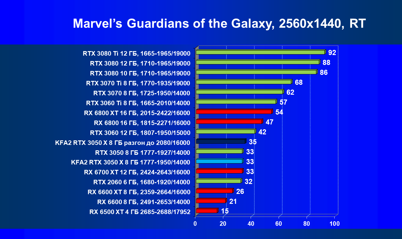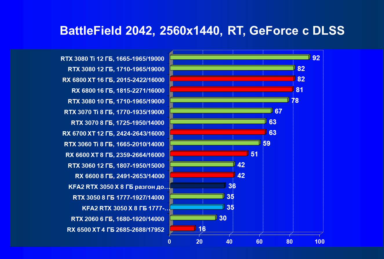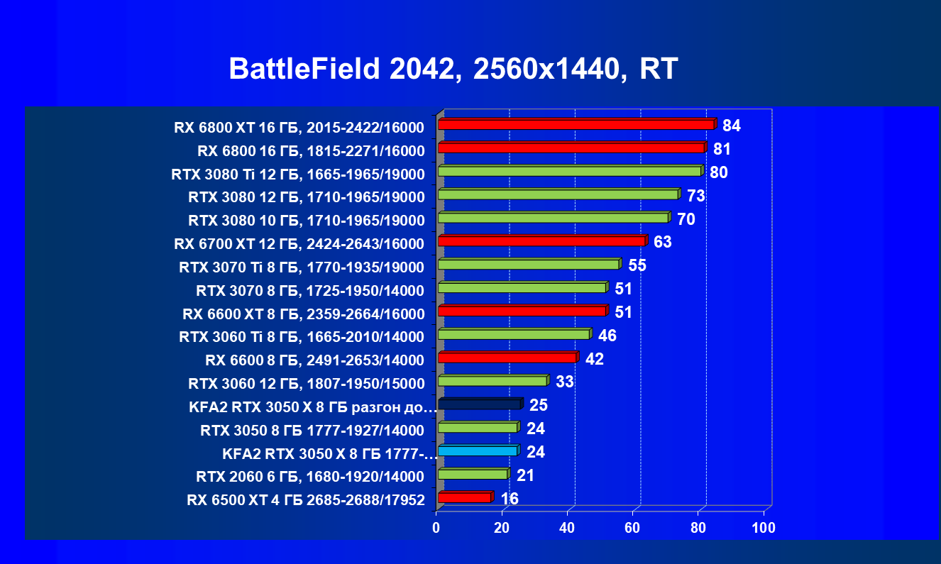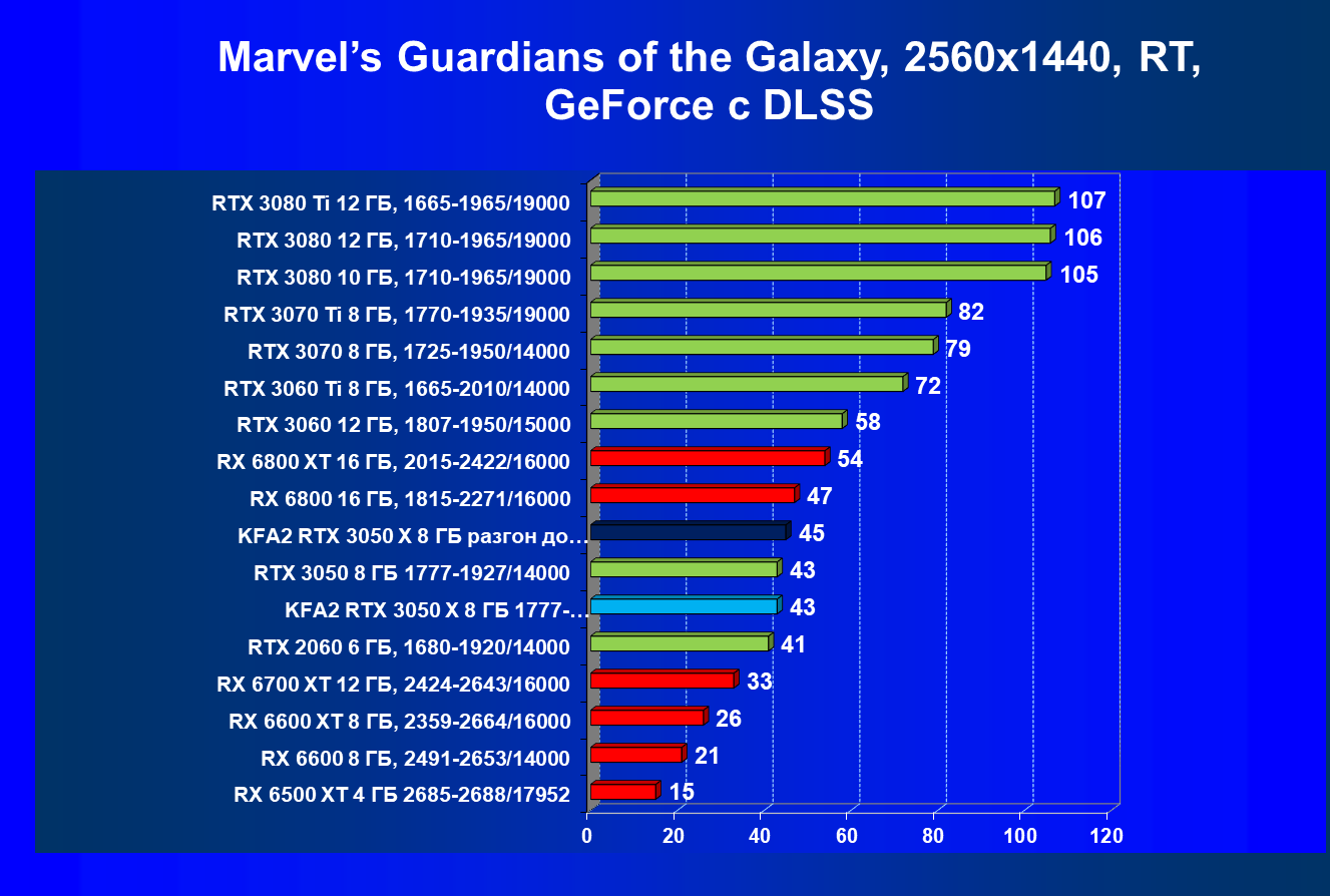 Результаты тестов в «классических» играх (без трассировки лучей) показали, что KFA2 GeForce RTX 3050 X находится на уровне между GeForce RTX 2060 и GeForce RTX 3060, обычно ближе к первому. При ручном разгоне производительность достигает видеокарты RX 6600, которая подороже.