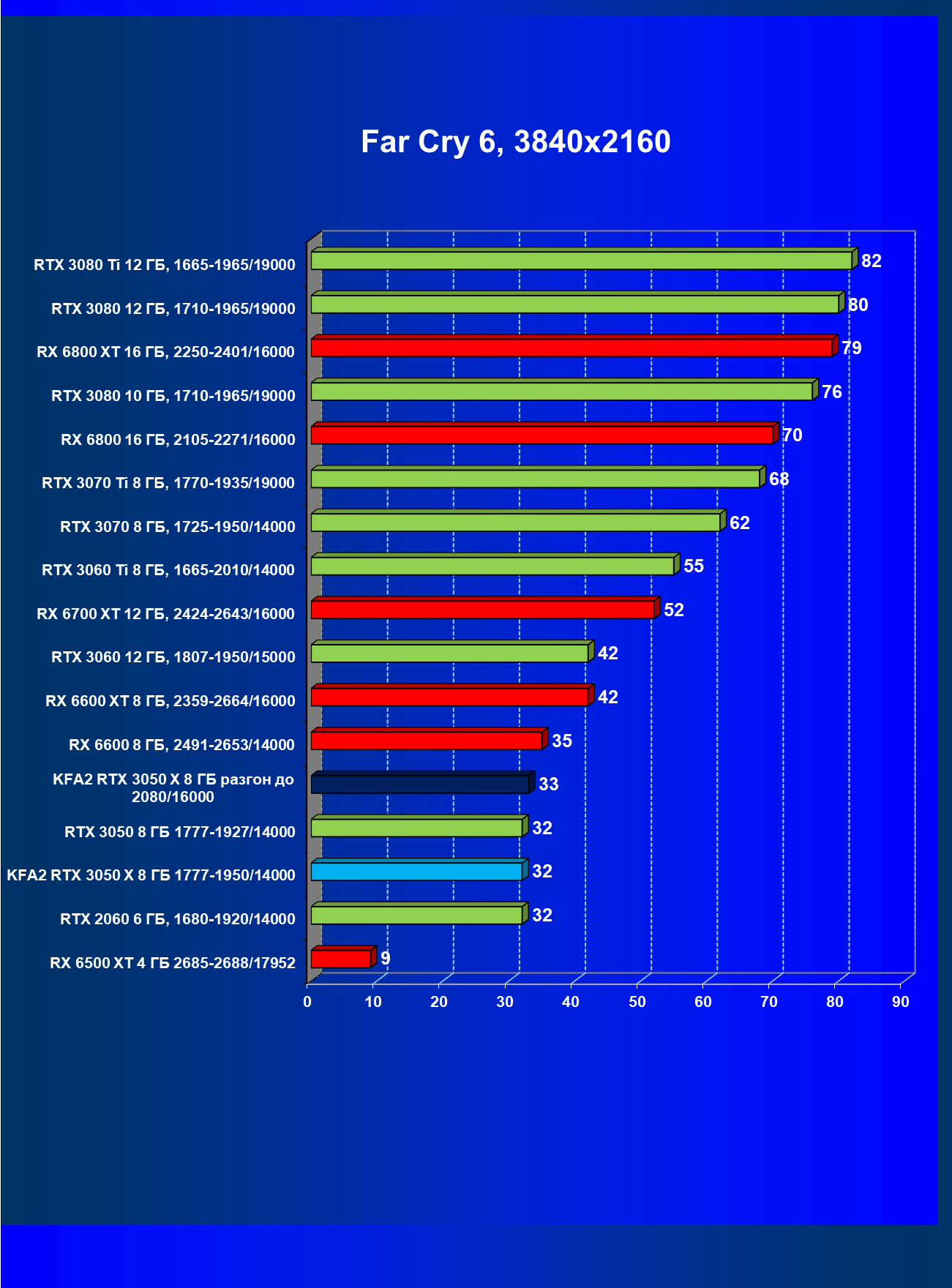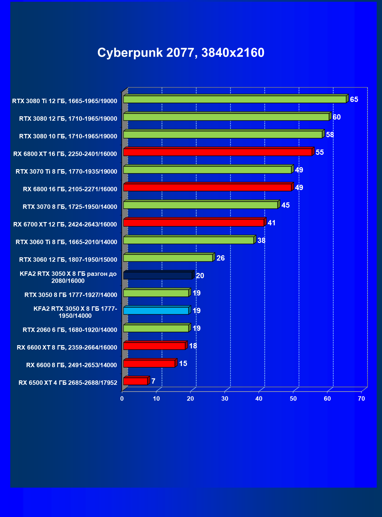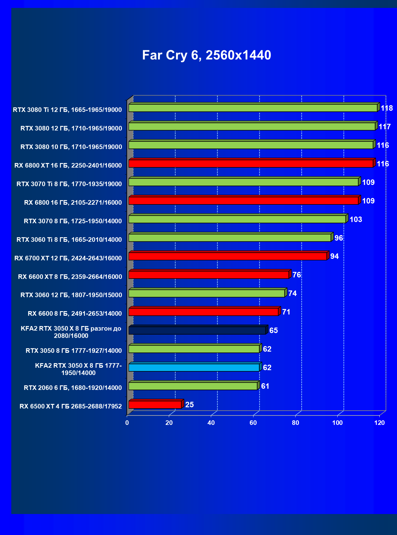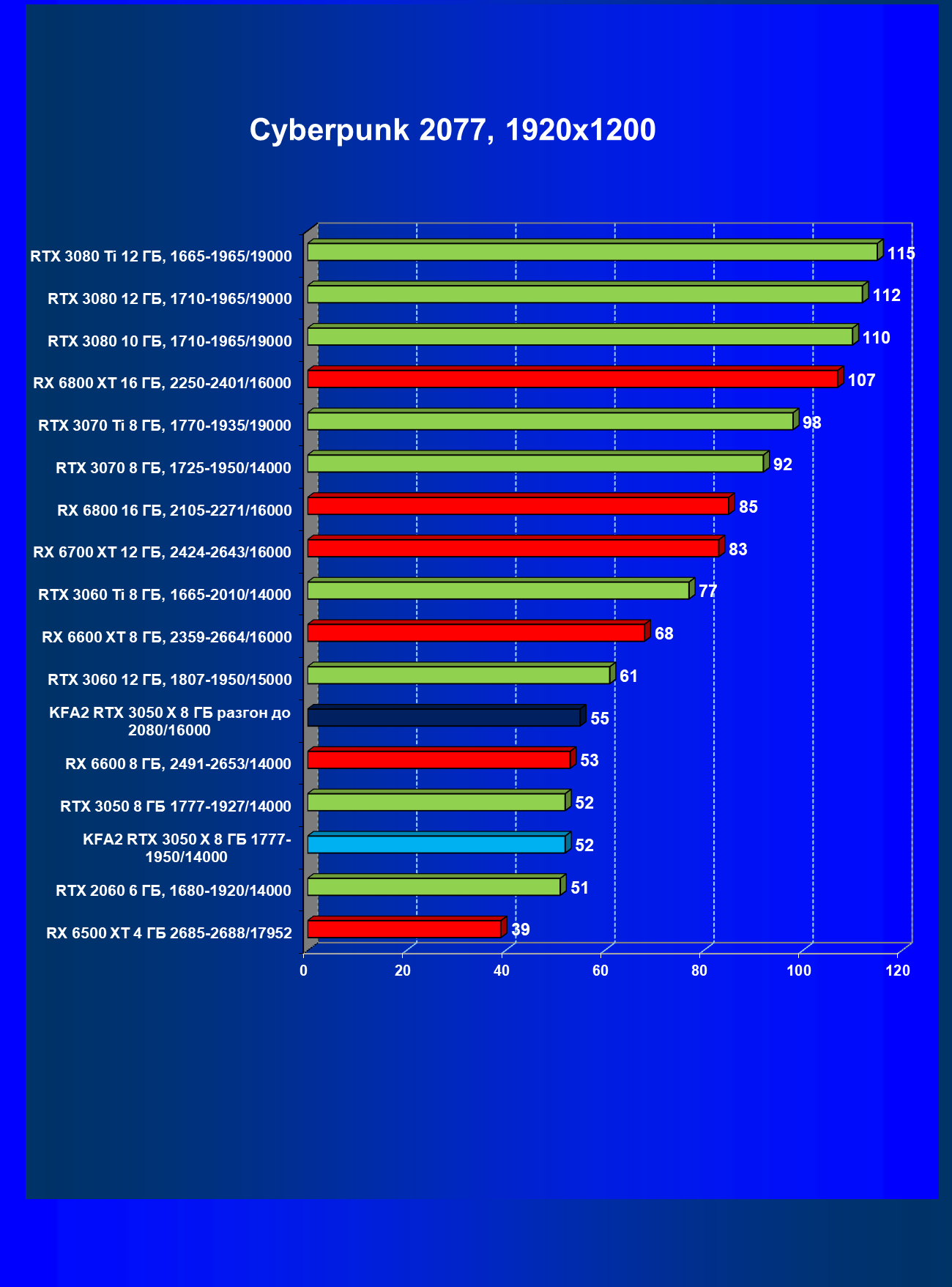 Результаты тестов в «классических» играх (без трассировки лучей) показали, что KFA2 GeForce RTX 3050 X находится на уровне между GeForce RTX 2060 и GeForce RTX 3060, обычно ближе к первому. При ручном разгоне производительность достигает видеокарты RX 6600, которая подороже.
