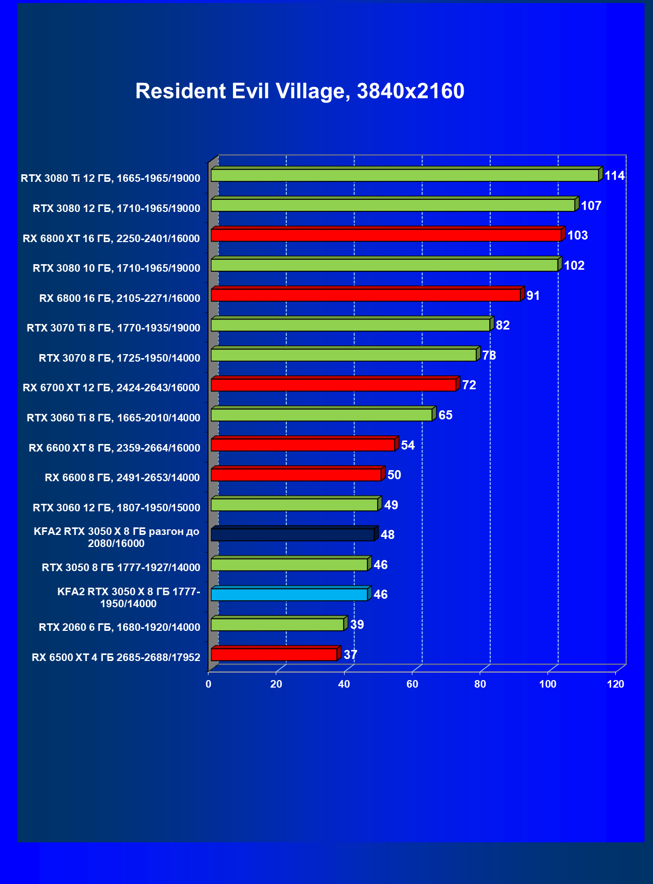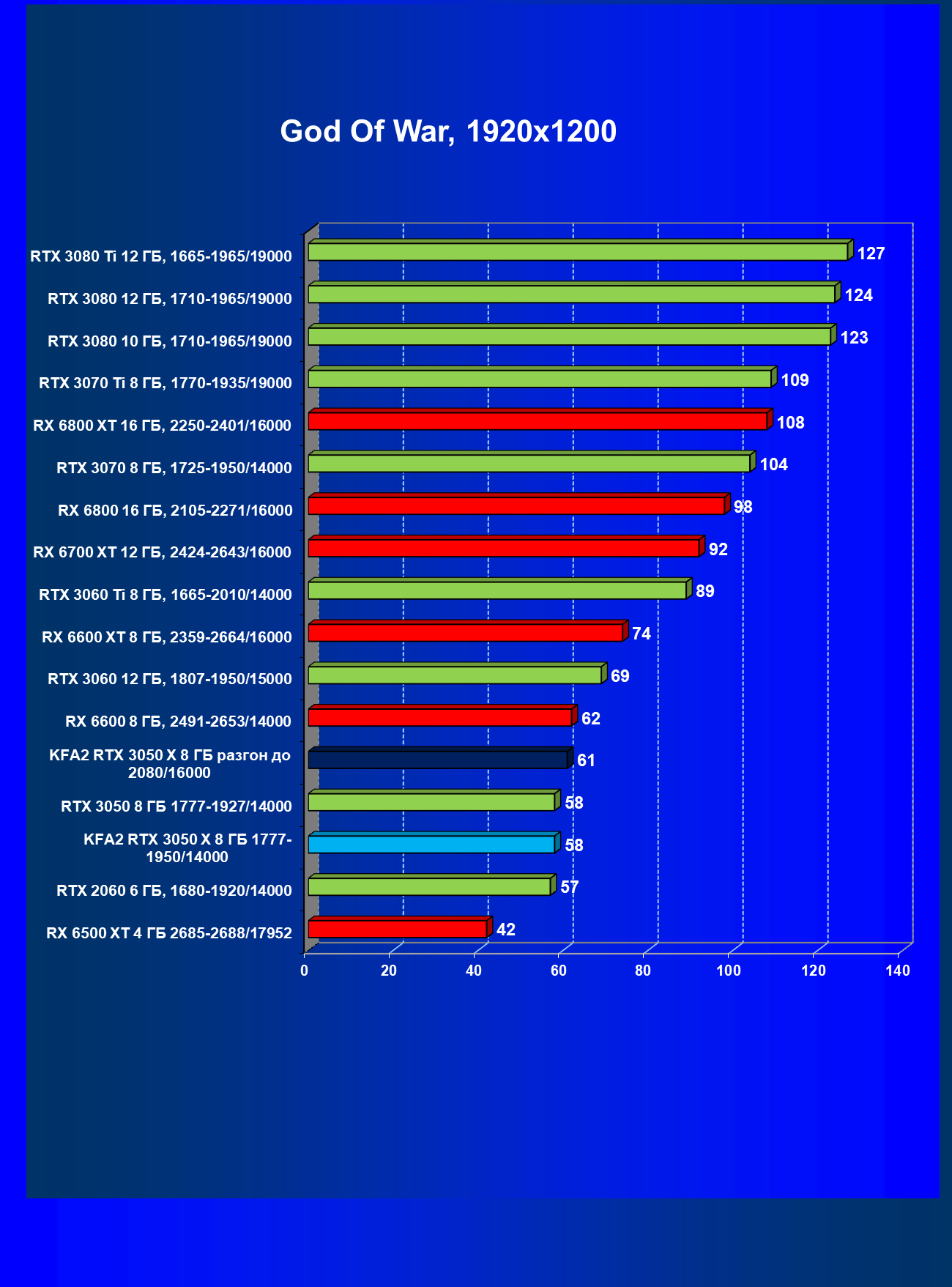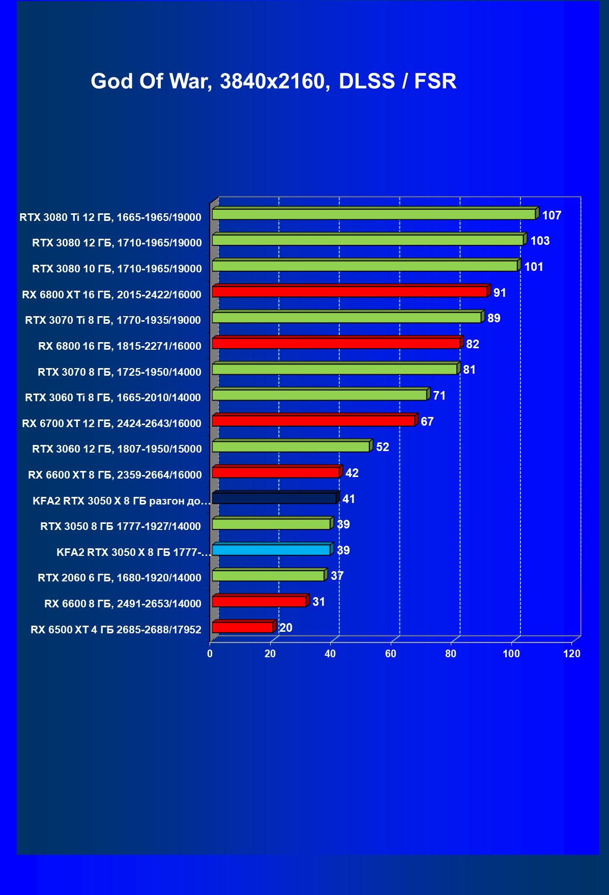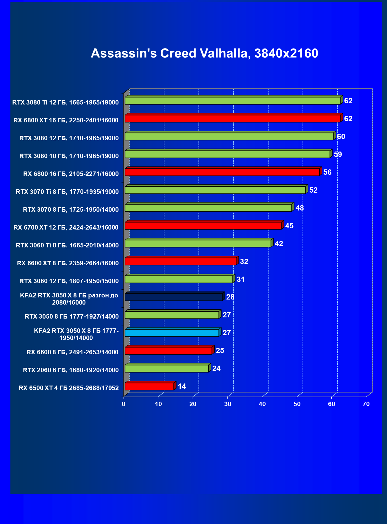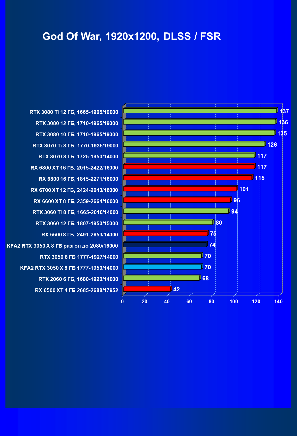 Результаты тестов в «классических» играх (без трассировки лучей) показали, что KFA2 GeForce RTX 3050 X находится на уровне между GeForce RTX 2060 и GeForce RTX 3060, обычно ближе к первому. При ручном разгоне производительность достигает видеокарты RX 6600, которая подороже.