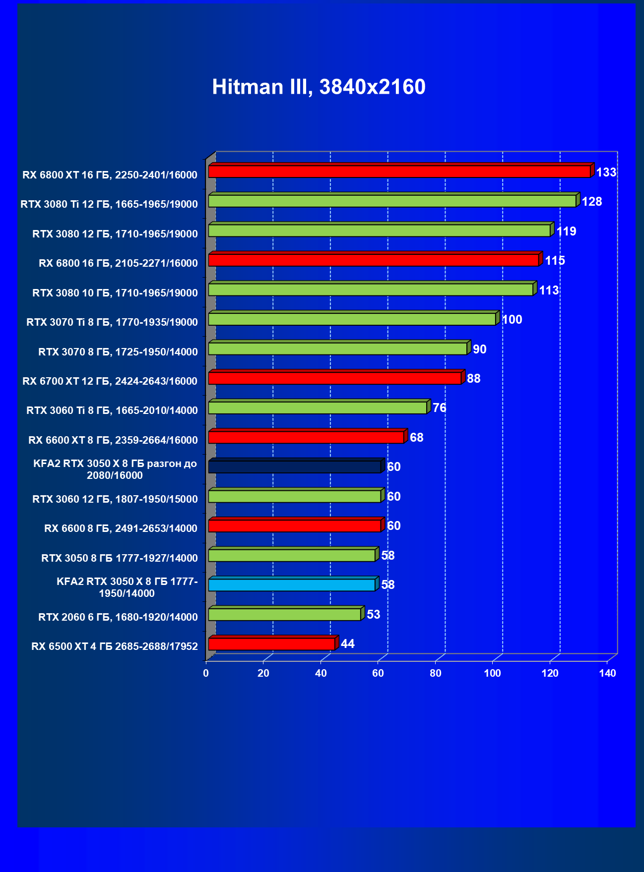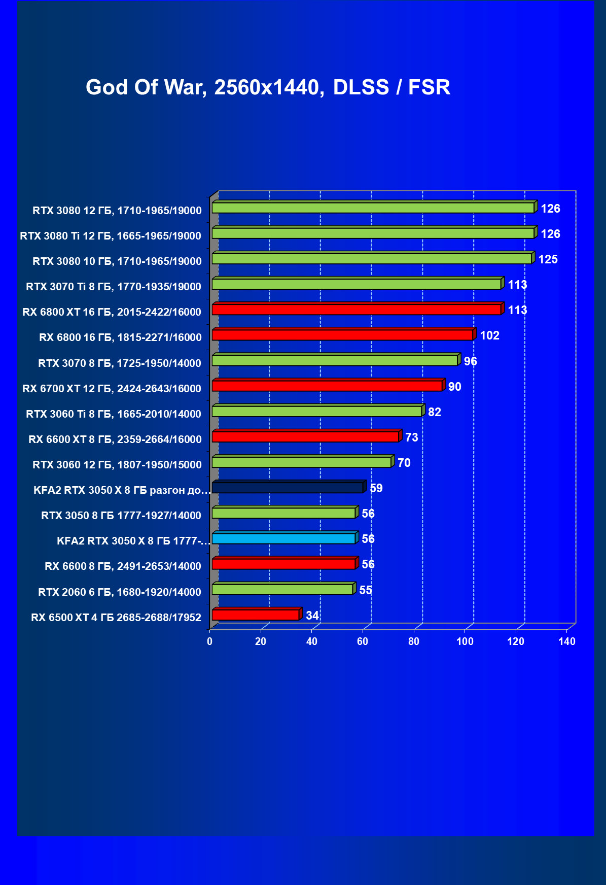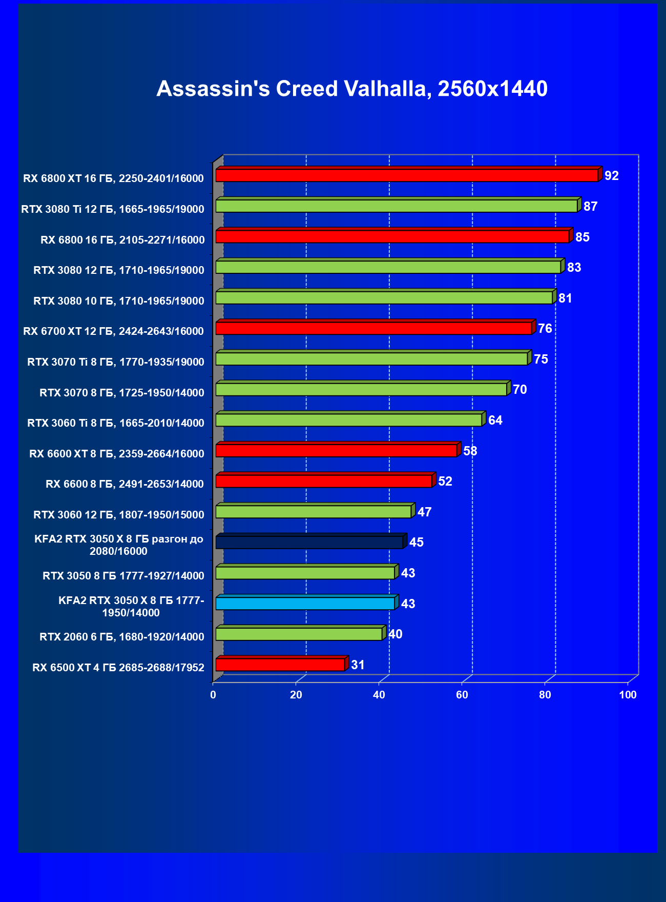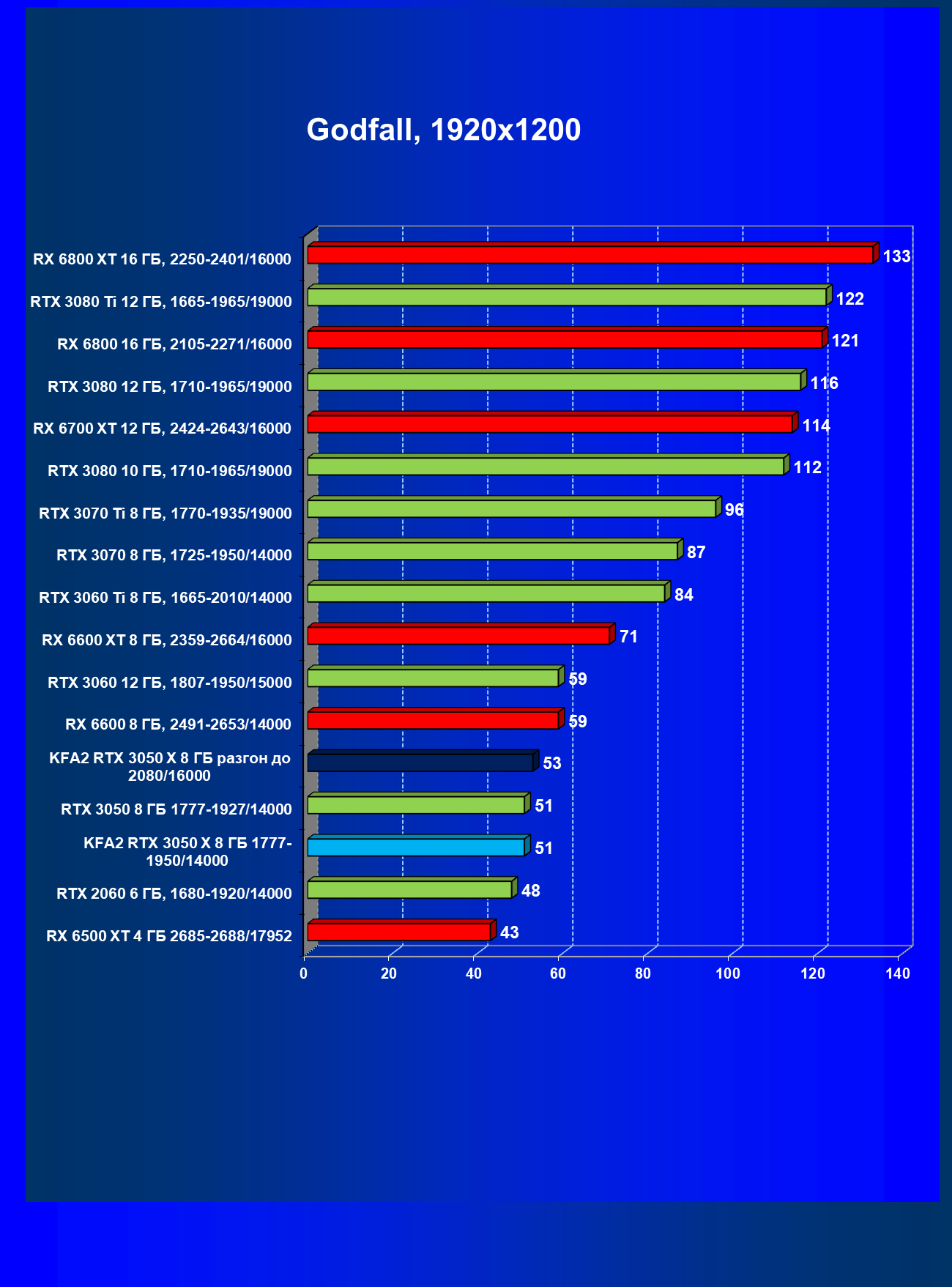 Результаты тестов в «классических» играх (без трассировки лучей) показали, что KFA2 GeForce RTX 3050 X находится на уровне между GeForce RTX 2060 и GeForce RTX 3060, обычно ближе к первому. При ручном разгоне производительность достигает видеокарты RX 6600, которая подороже.