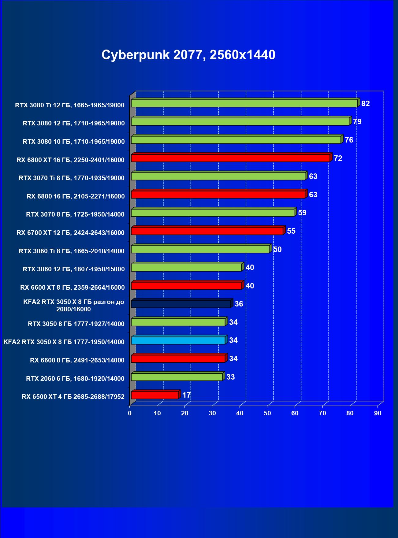 | 15 | KFA2 RTX 3050 X Black 8 ГБ, разгон до 2080/16000 | 170 |
