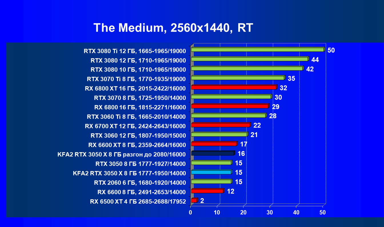 В случае игр с трассировкой лучей KFA2 GeForce RTX 3050 X в разрешении Full HD ненамного, но отстает от более дорогого собрата RTX 3060. В разогнанном состоянии обозреваемая видеокарта в этом разрешении демонстрирует в большинстве случаев более 50 fps.