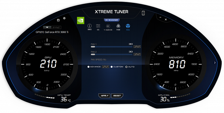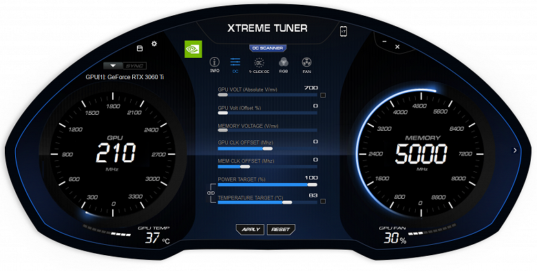Штатные частоты памяти у карты KFA2 равны референсным значениям, а вот с частотой работы ядра сложнее. Boost-значение частоты GPU увеличено почти на 2% относительно карты Nvidia GeForce RTX 3060 Ti Founders Edition, однако максимальная частота у карты KFA2 — ниже (1965 против 2010 МГц), хотя при этом энергопотребление карты KFA2 доходило до 221 Вт (против 207 у референс-аналога). Исследования показали, что в среднем мы получили в играх прирост производительности в 1,5% относительно референс-карты. При этом есть еще дополнительный режим 1-Click, активируемый через фирменную программу Xtreme Tuner (о ней ниже), в нем Boost-частота ядра поднимается еще на 1% относительно референсной, а максимум остается все равно ниже референсного максимума. В итоге этот режим обеспечивает в играх прирост производительности около 2% (речь идет, разумеется, о разрешении 2.5К) относительно GeForce RTX 3060 Ti FE.