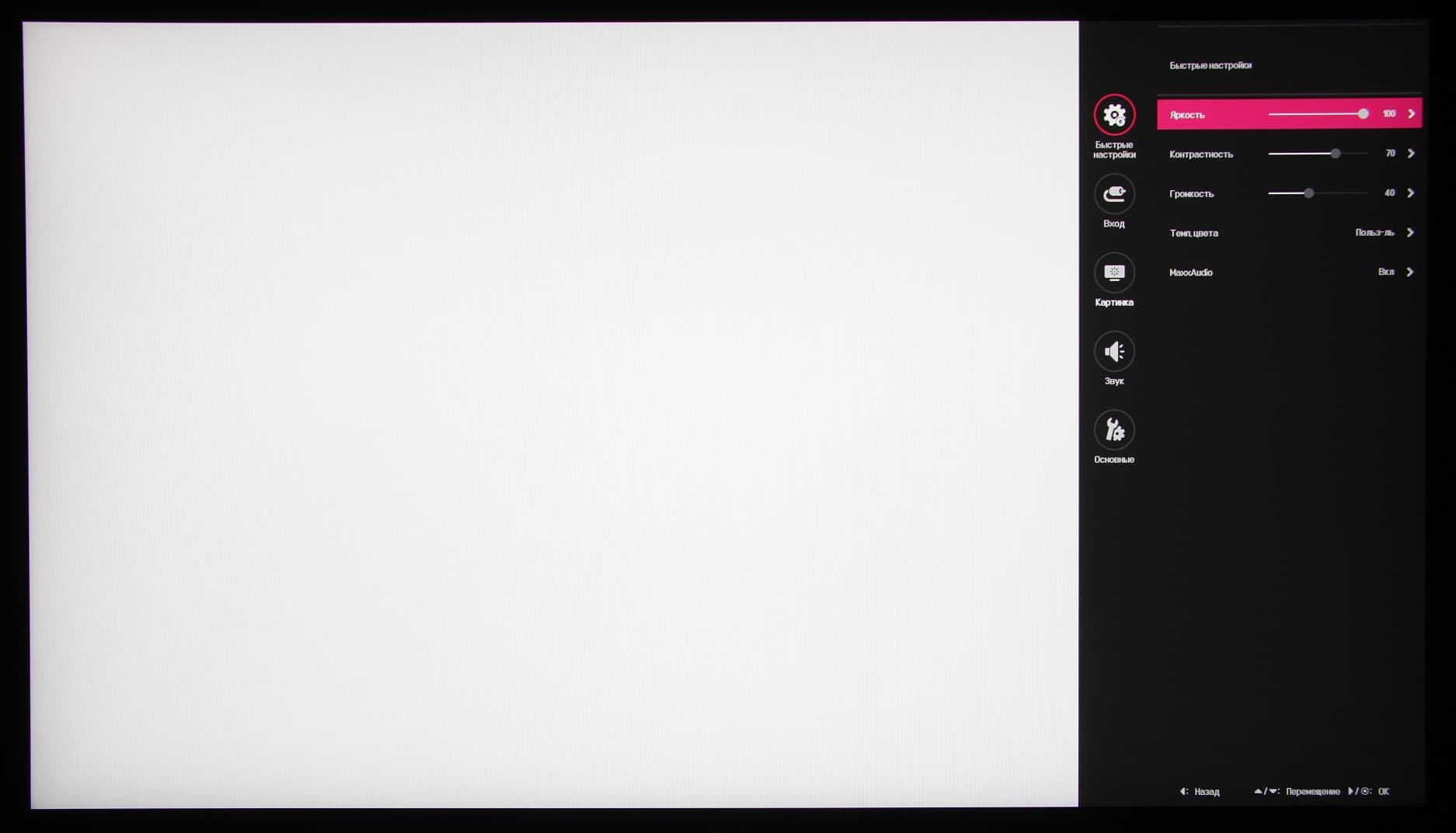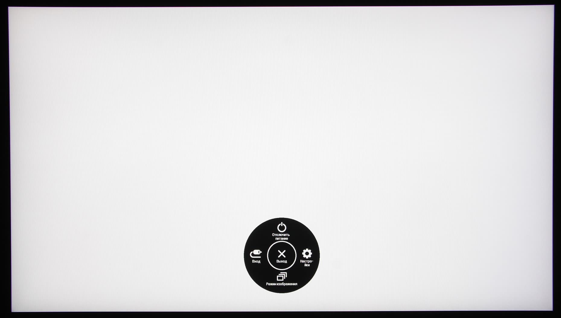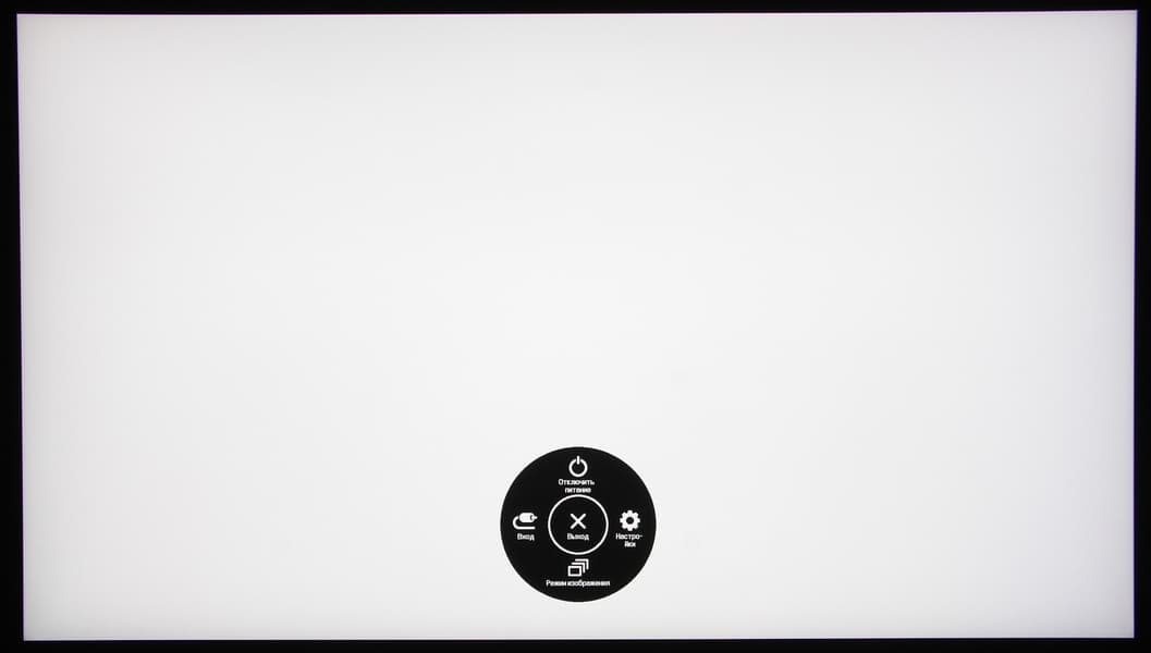 Длительное нажатие, когда нет меню, выключает монитор. Короткое — включает. Из стартового меню можно выйти, перейти к выбору входа, к основному меню, к списку выбора режима изображения или выключить монитор. Меню занимает на экране значительную площадь, что иногда мешает оценке вносимых изменений.