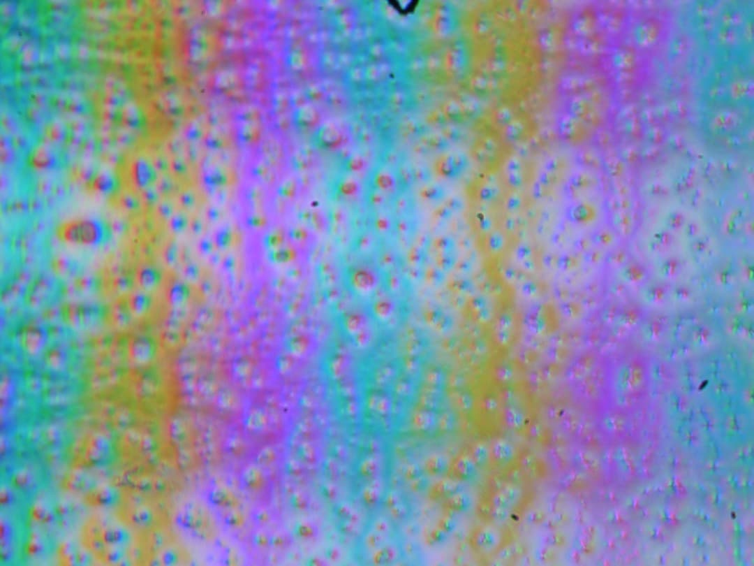 Зерно этих дефектов в несколько раз меньше размеров субпикселей (масштаб этих двух фотографий одинаковый), поэтому фокусировка на микродефектах и «перескок» фокуса по субпикселям при изменении угла зрения выражены слабо, из-за этого нет и «кристаллического» эффекта.