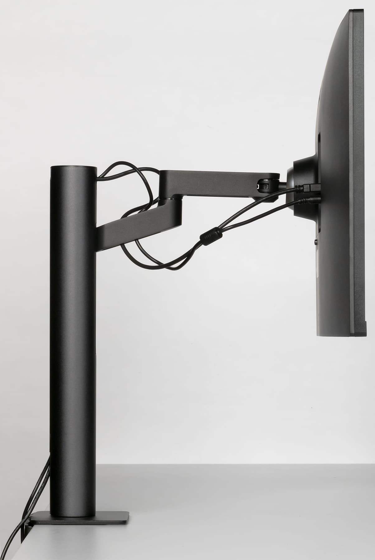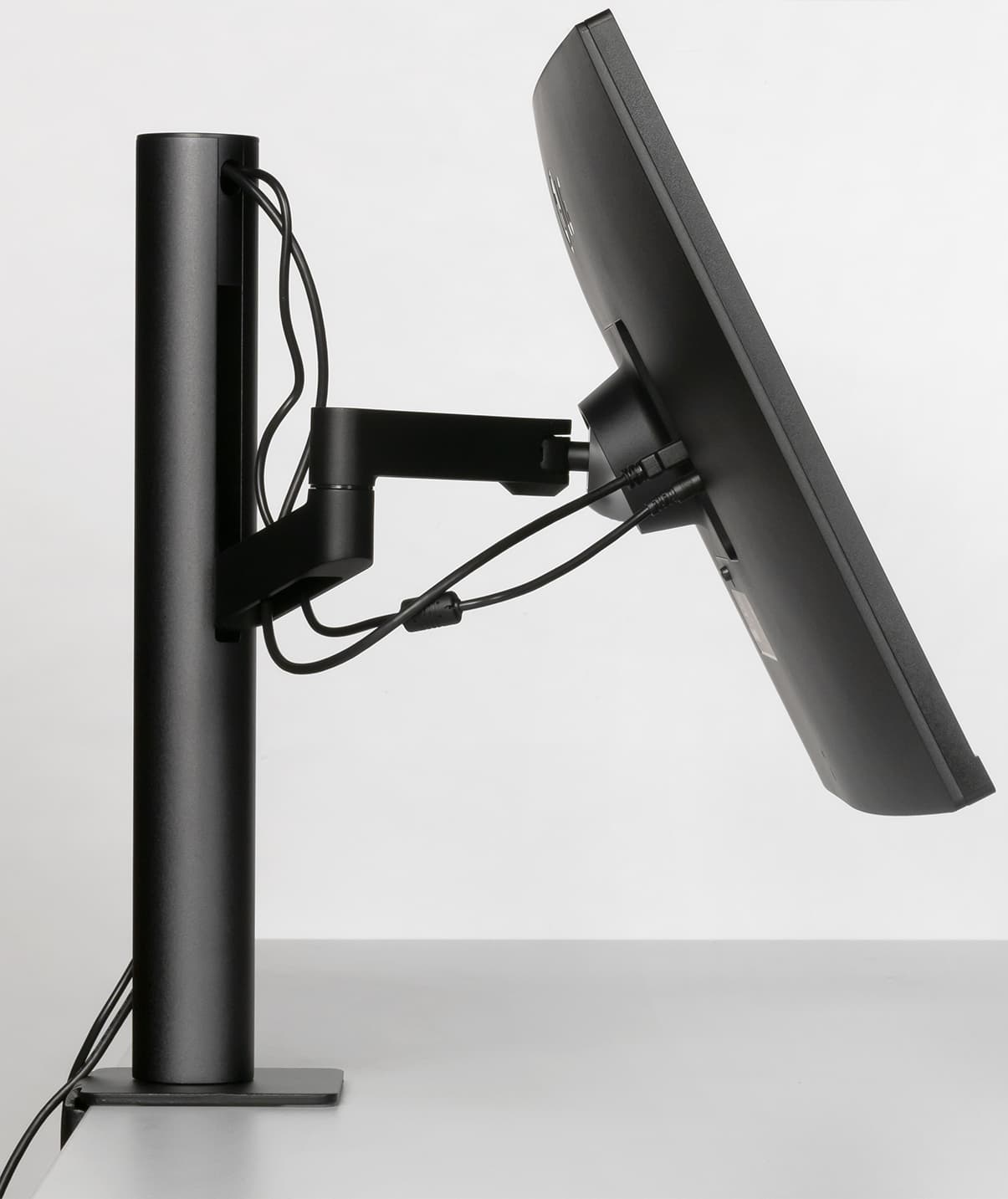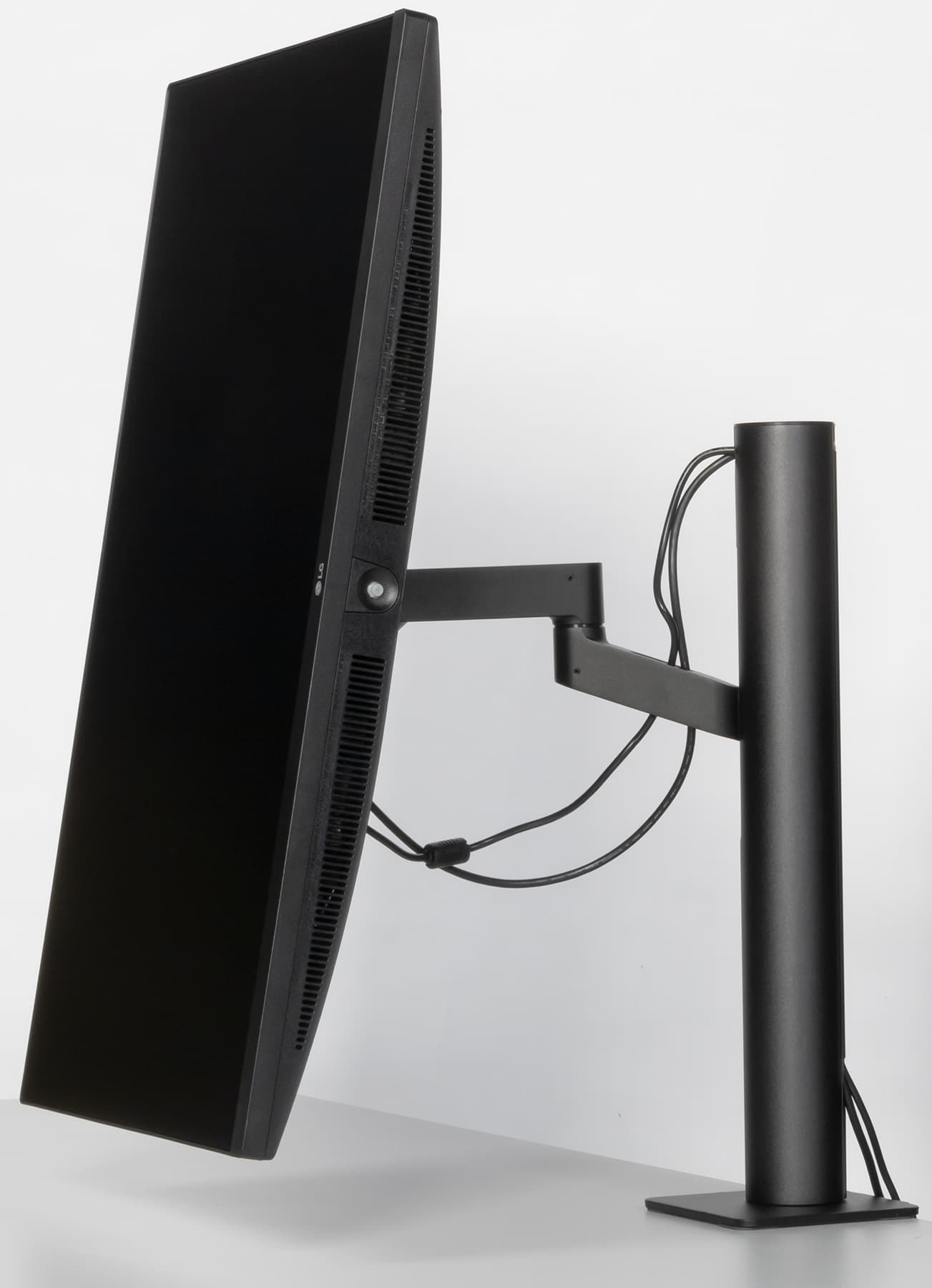 Дополнительно шарниры в крепежной площадке позволяют наклонить блок экрана вперед, отклонить назад и перевернуть по часовой стрелке в портретную ориентацию. Вертикальное перемещение обеспечивает рельсовый механизм с шариковыми подшипниками.