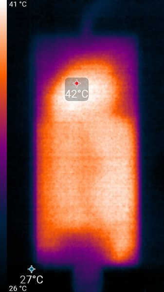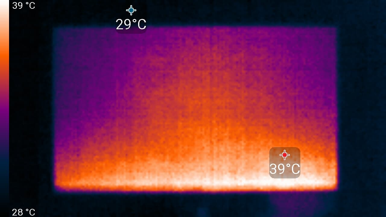 Нижний край экрана нагрелся до 39 °C максимум. Видимо, внизу находится светодиодная линейка подсветки экрана.