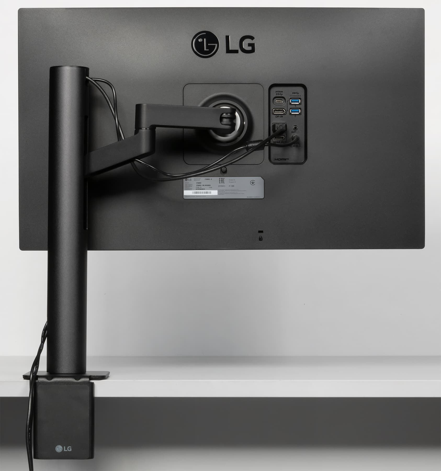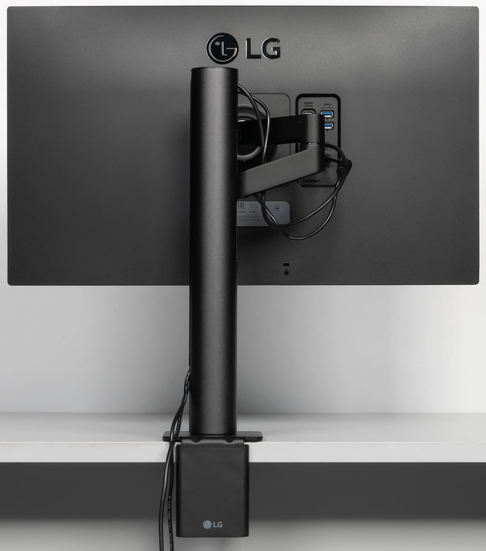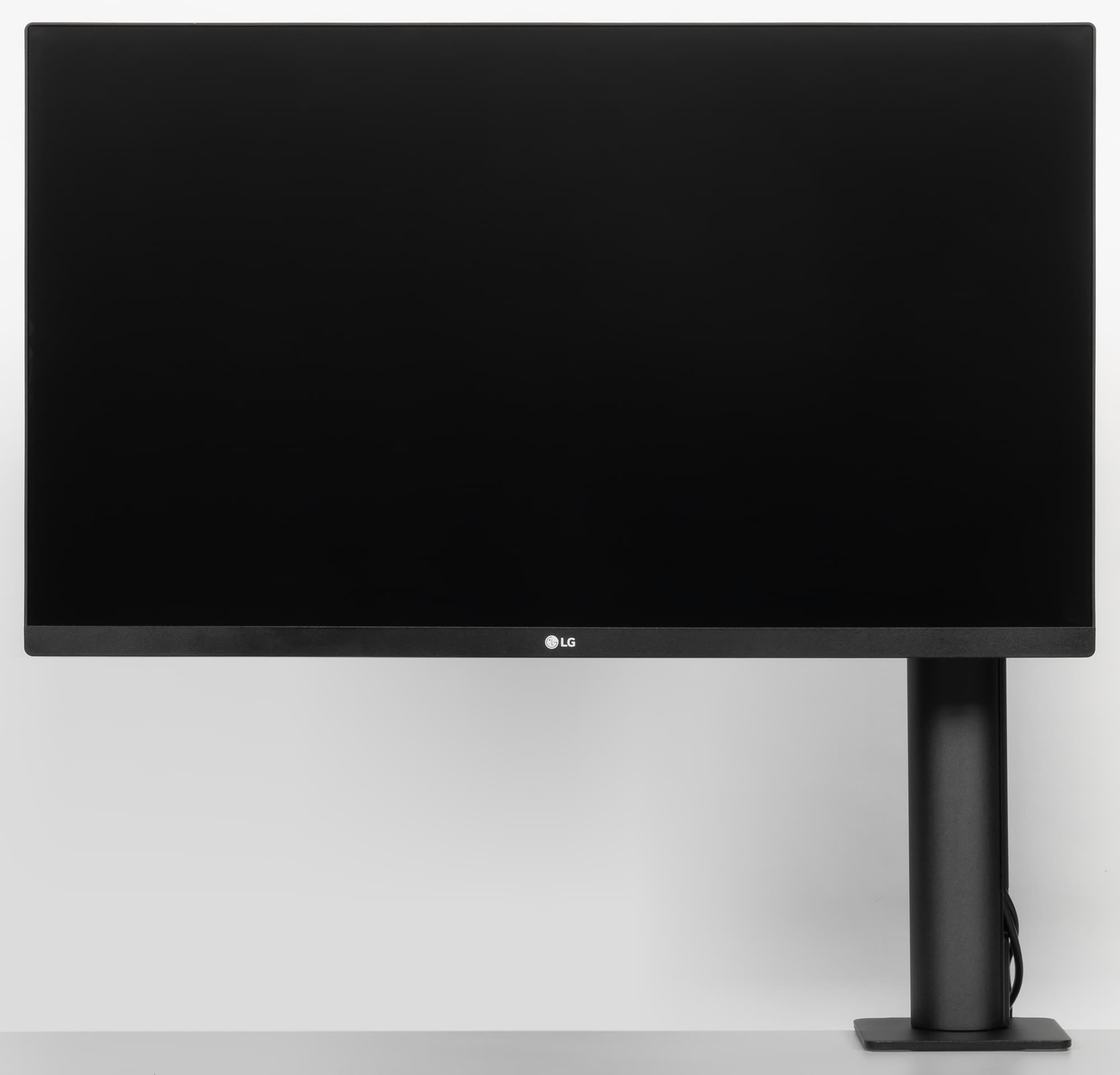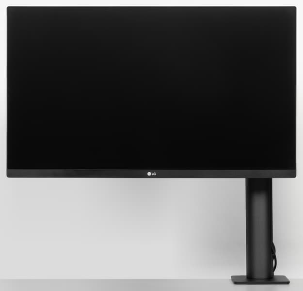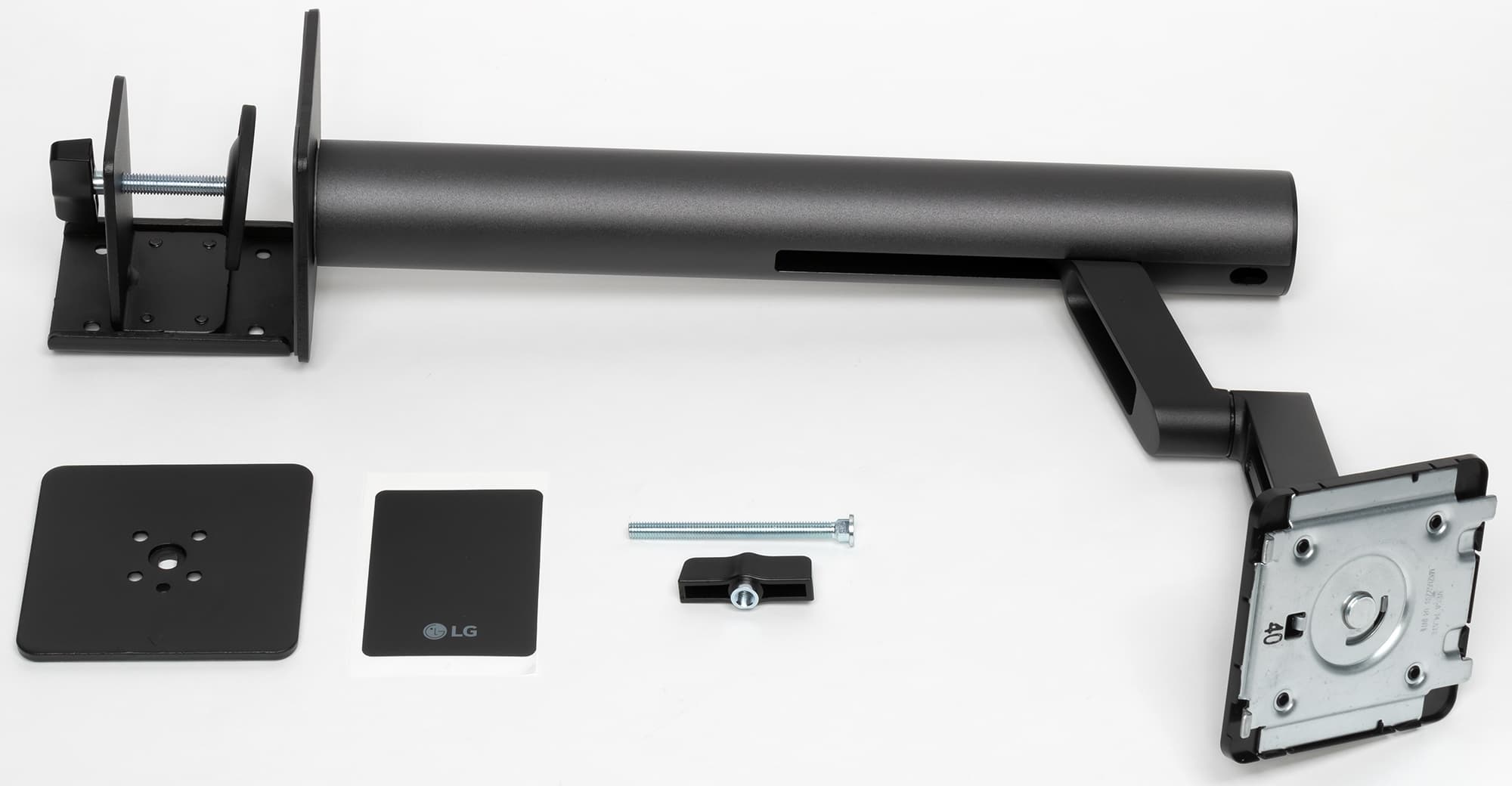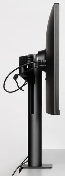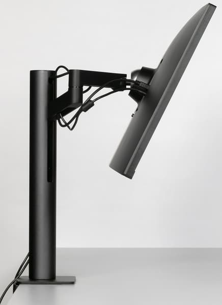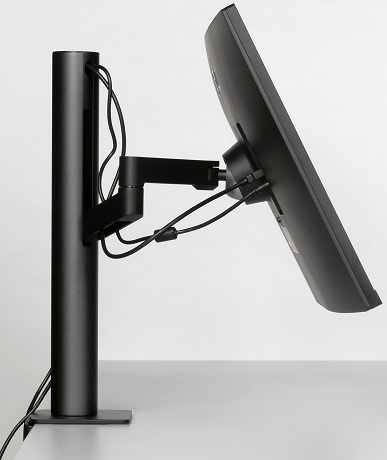 Штатная подставка оснащена винтовым прижимом и позволяет установить монитор на столе двумя способами: фиксация за край столешницы (толщиной до 90 мм) или через отверстие в столешнице (толщиной до 60 мм). Второй способ потребует демонтажа крепежного уголка и использования прижимной пластины, винта и барашковой гайки, входящих в комплект поставки. Чтобы выдержать вес монитора, ряд ответственных деталей подставки изготовлены из алюминиевого сплава и толстой штампованной стали. Большинство видимых пользователю металлических деталей имеют стойкое черное матовое покрытие.