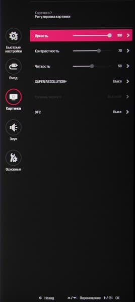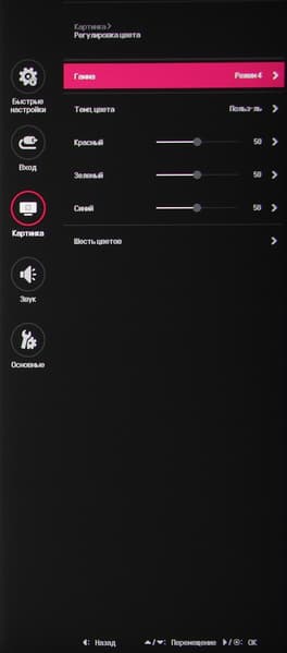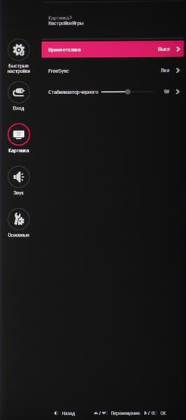 Присутствуют стандартные настройки Яркость, Контрастность и Четкость. Есть функция улучшения изображения с низким разрешением Super Resolution+. В списке выбирается профиль гамма-коррекции, а цветовой баланс корректируется выбором одного из трех профилей цветовой температуры, или ползунком цветовой температуры, или ручной регулировкой интенсивности трех цветов, а также коррекцией оттенка и насыщенности шести цветов. В дополнение к выбору профиля гамма-коррекции есть настройка (Стабилизатор черного), изменяющая различимость градаций в тенях, что может пригодиться в играх с темными сценами. Также можно регулировать разгон матрицы и включать/выключать поддержку режима FreeSync.